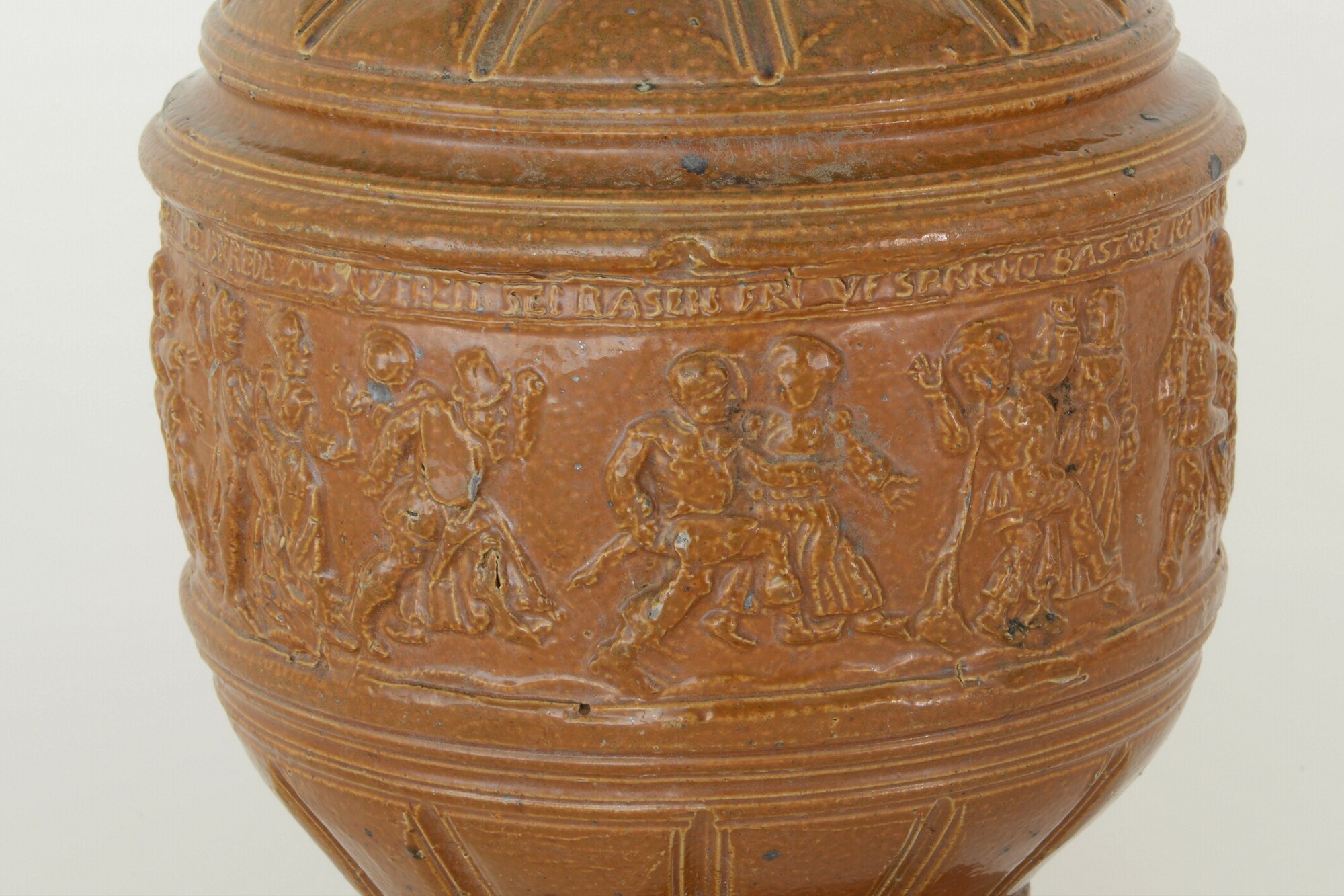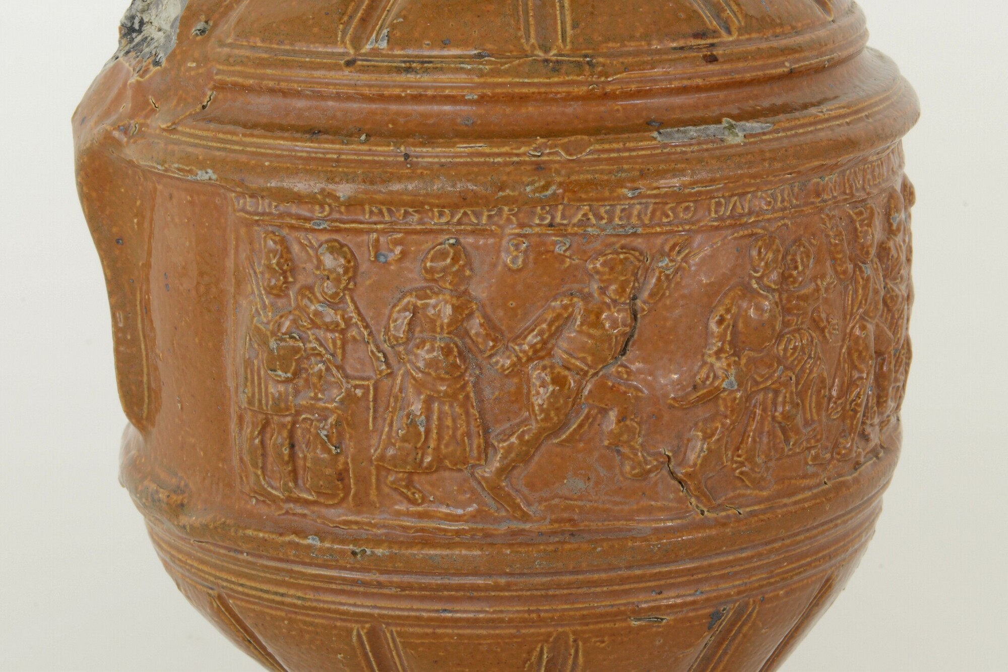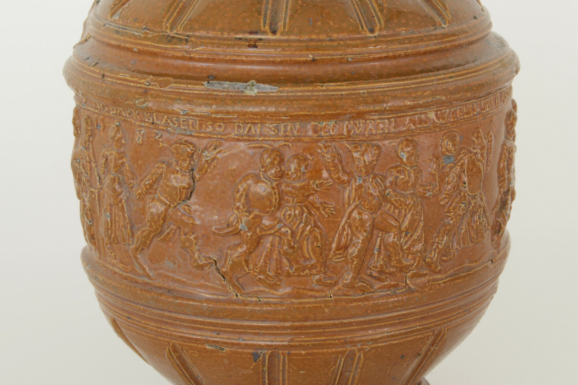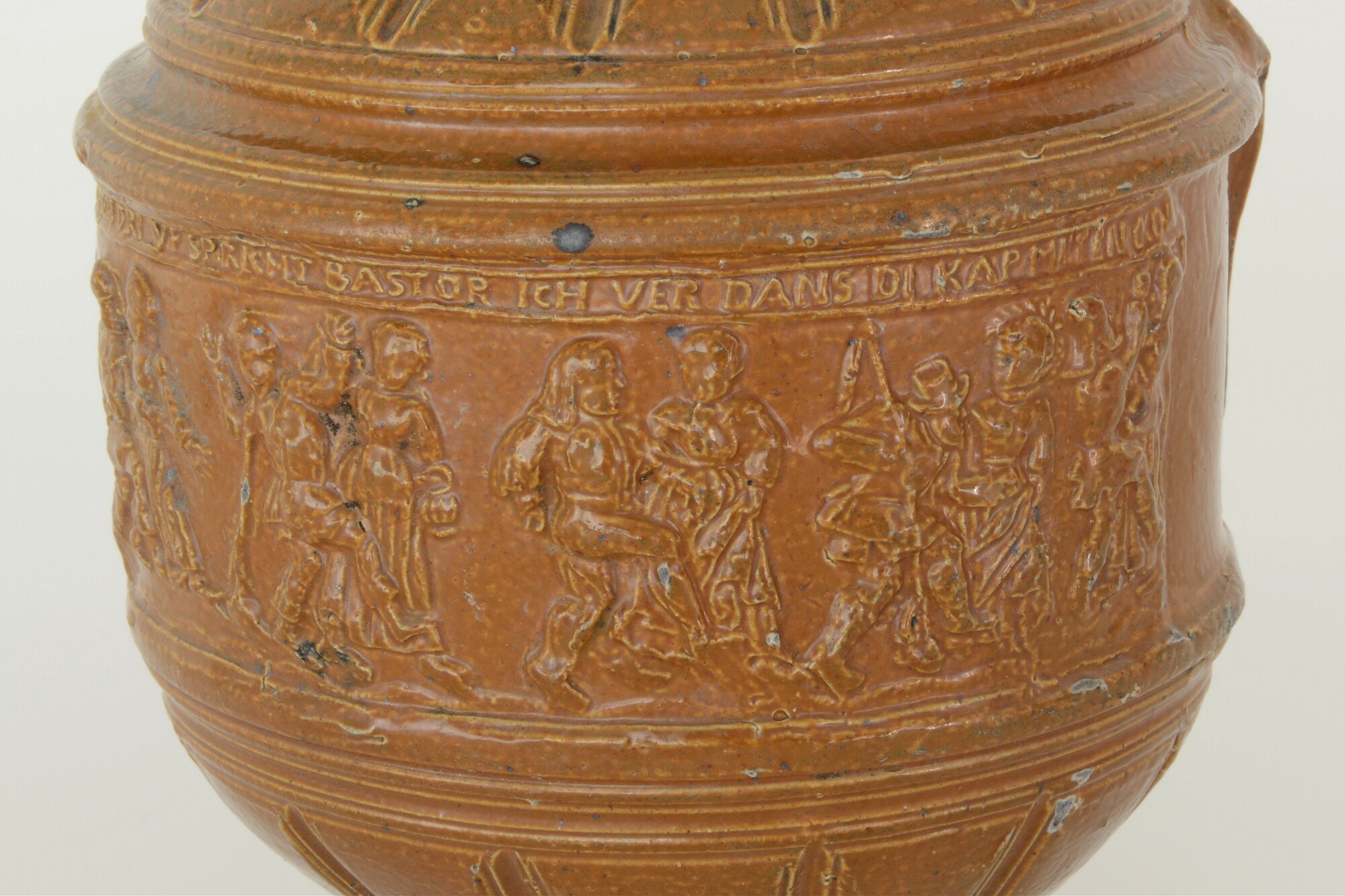 Kan; s2-kan-49; kan met op buik een cilindrische zone door ribbels gemarkeerd, hoge cilindrische hals, standvoet, verticaal oor (ontbreekt); steengoed met oppervlaktebehandeling: ijzerengobe en zoutglazuur; in reliëf: fries met boerendans en tekst: 'GERET DU MUS DAPR BLASEN SO DANSEN DEI BUREN ALS WEREN SEI RASEN ERI WE SPRICHT BASTOR ICH VER DANS DI KAPMITEN' en ...