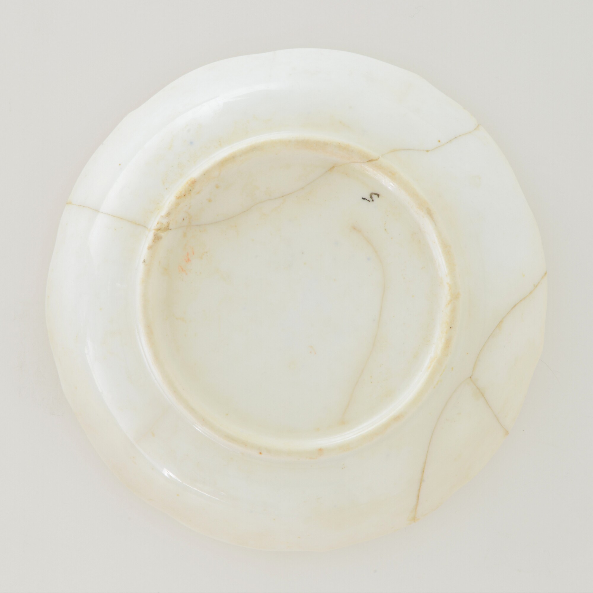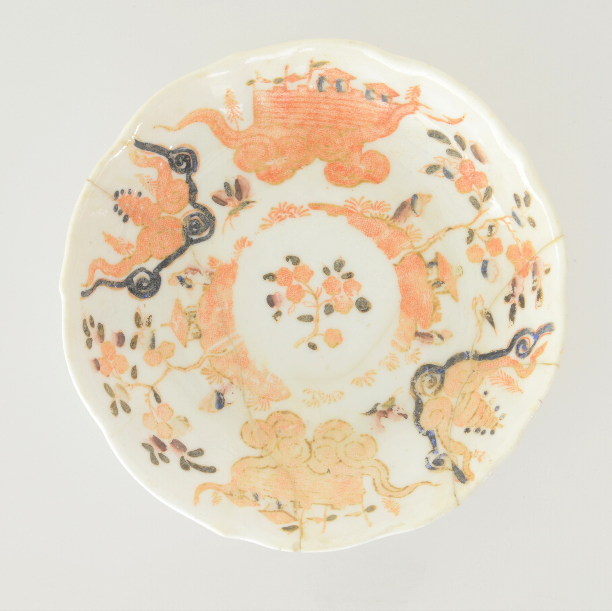 Bord; ep-bor-; Europees porselein; veldspaatglazuur, onderglazuur rood; beschildering in blauw, paars, geel en bruin, inw.: bloemen; standring; merkteken: 341 en 6