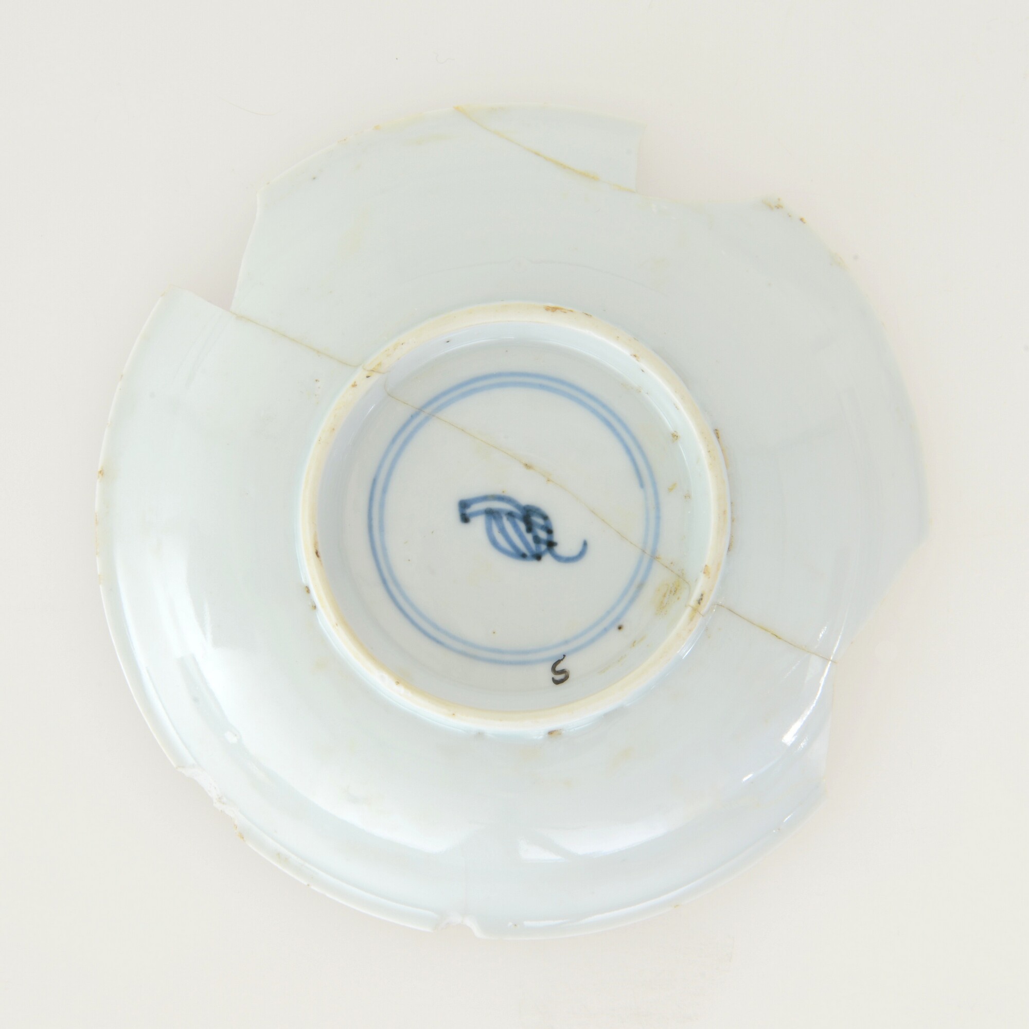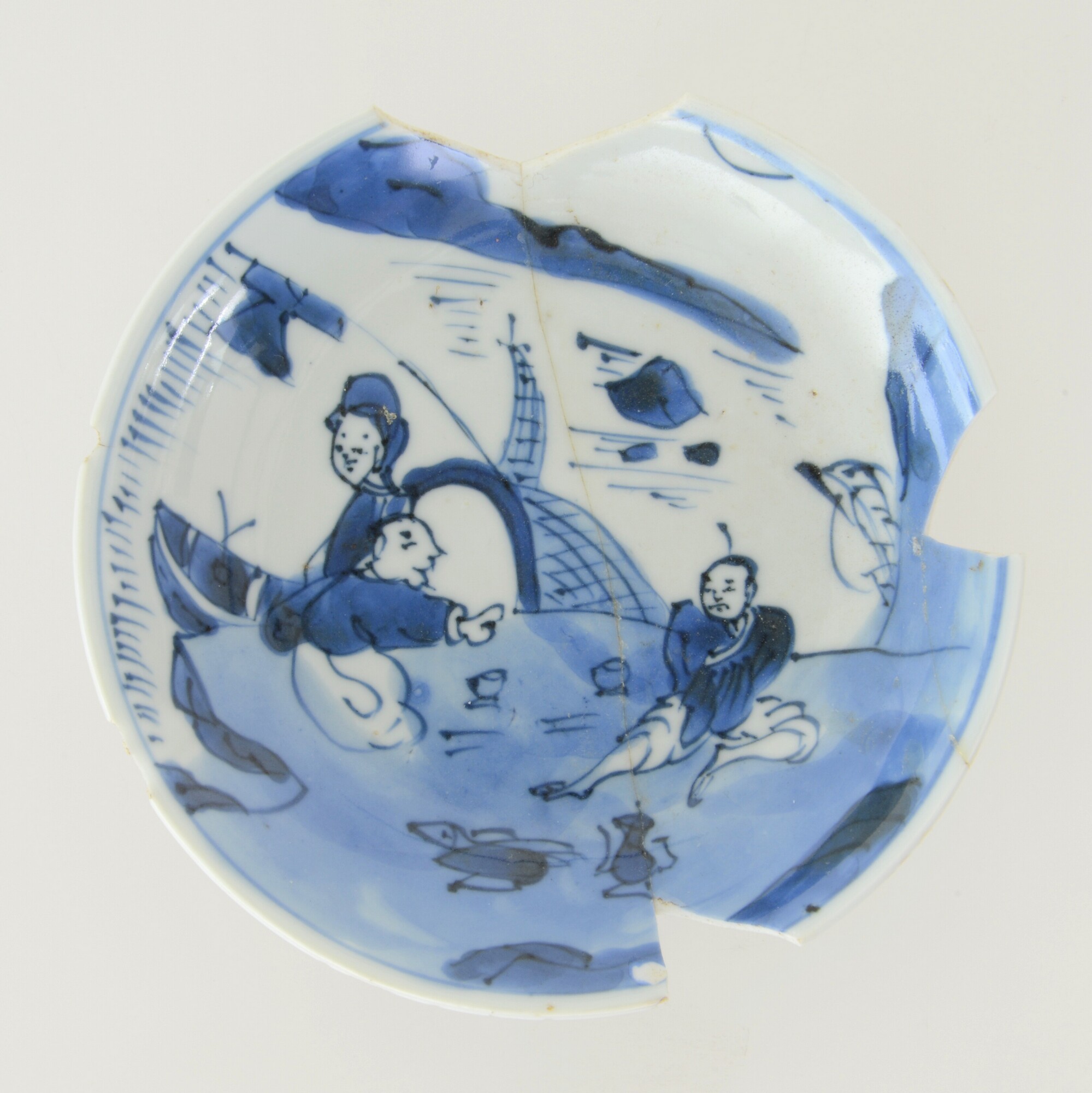 Bord; p-bor-1; klein diep bord zonder vlag met uitgebogen rand; Chinees porselein; Kangxi-periode; veldspaatglazuur, onderglazuur blauw; 2 theedrinkende figuren en 1 figuur op de achtergrond; standring; merk; herkomst: China, Jingdezhen