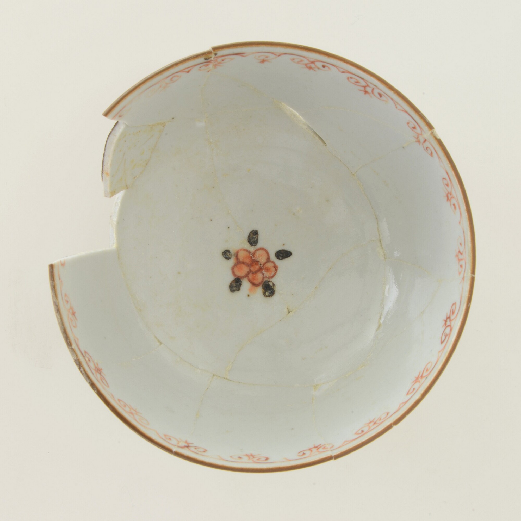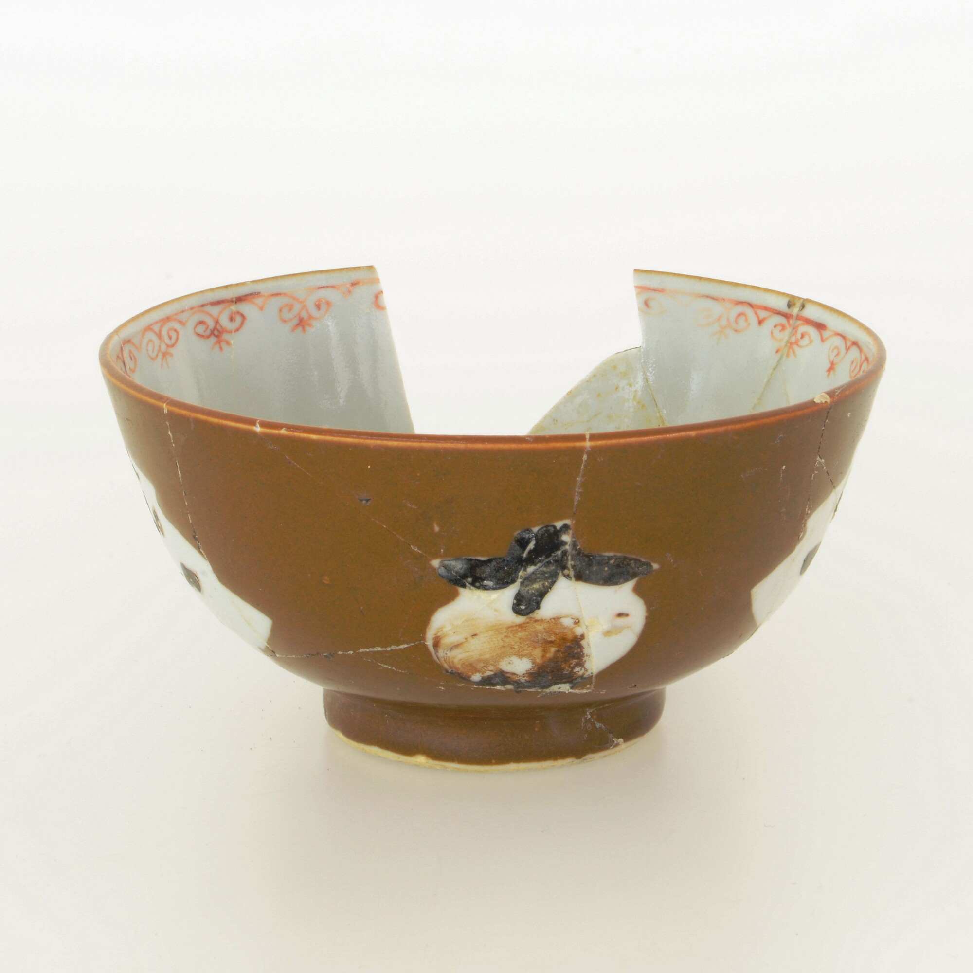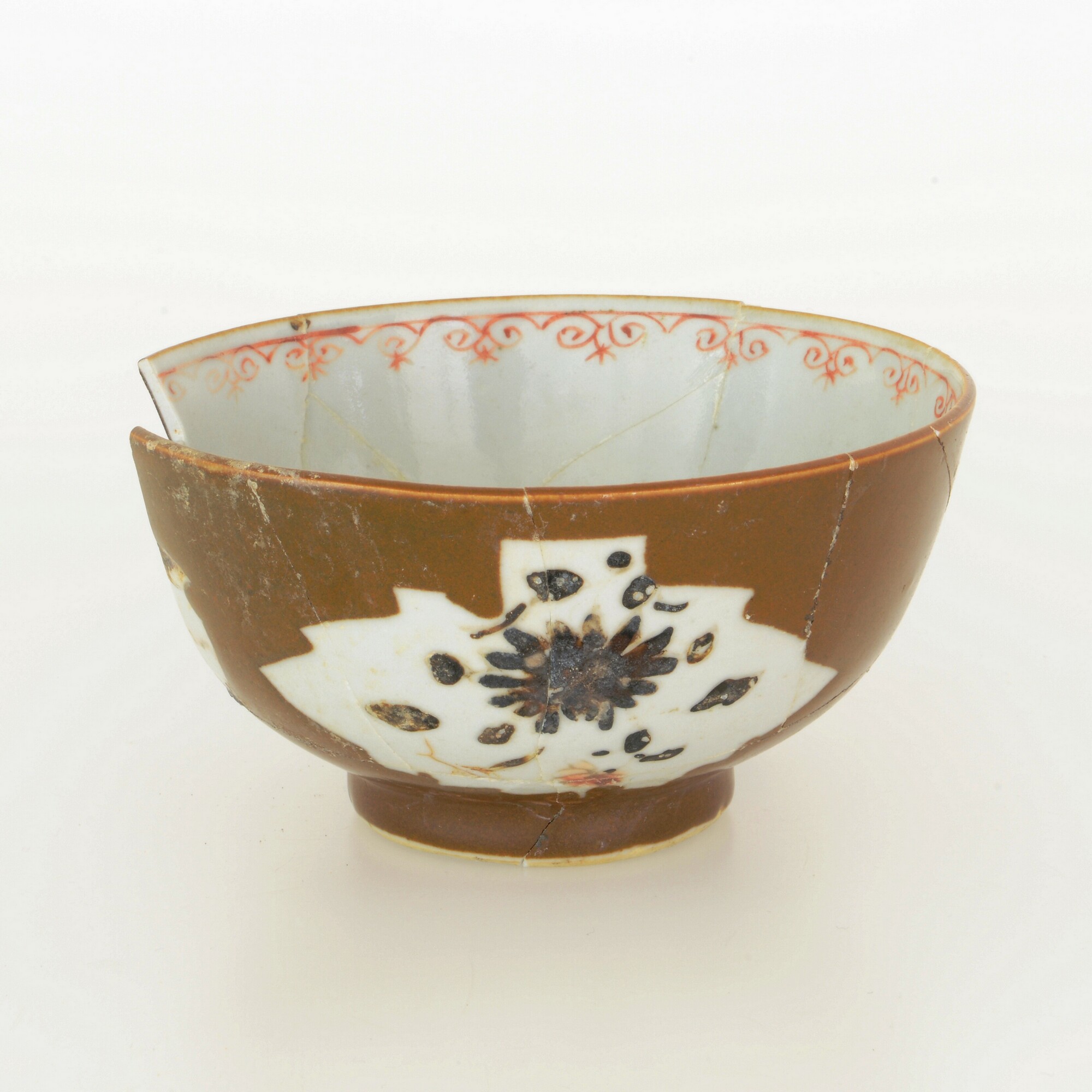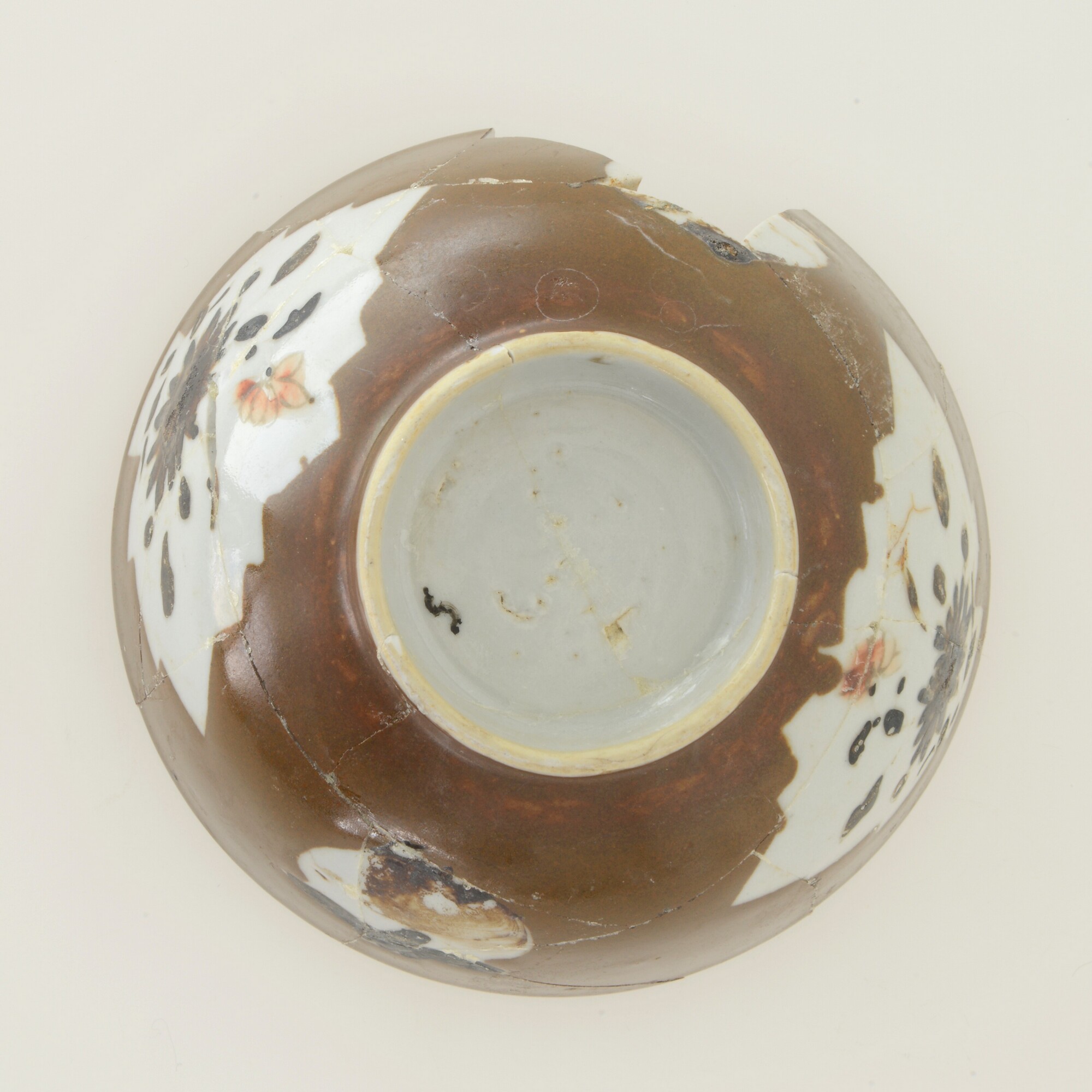 Kom; p-kom-3; Chinees porselein; afgeronde kom met uitgebogen lip; veldspaatglazuur, onderglazuur rood/bruin; inw: sp: bloem, vl: balusters; uiw.:uitgespaarde kaders met bloemen (capucijnergoed); standring; herkomst: China, Jingdezhen