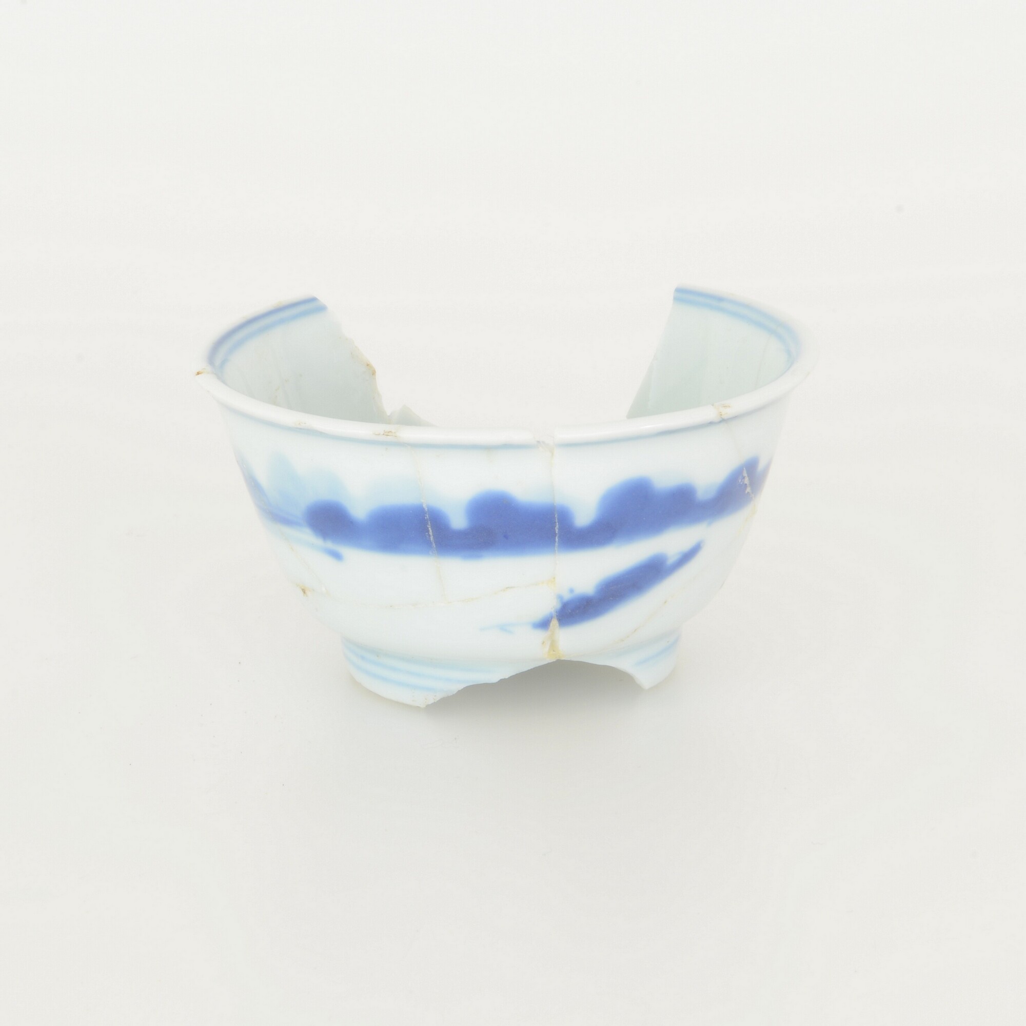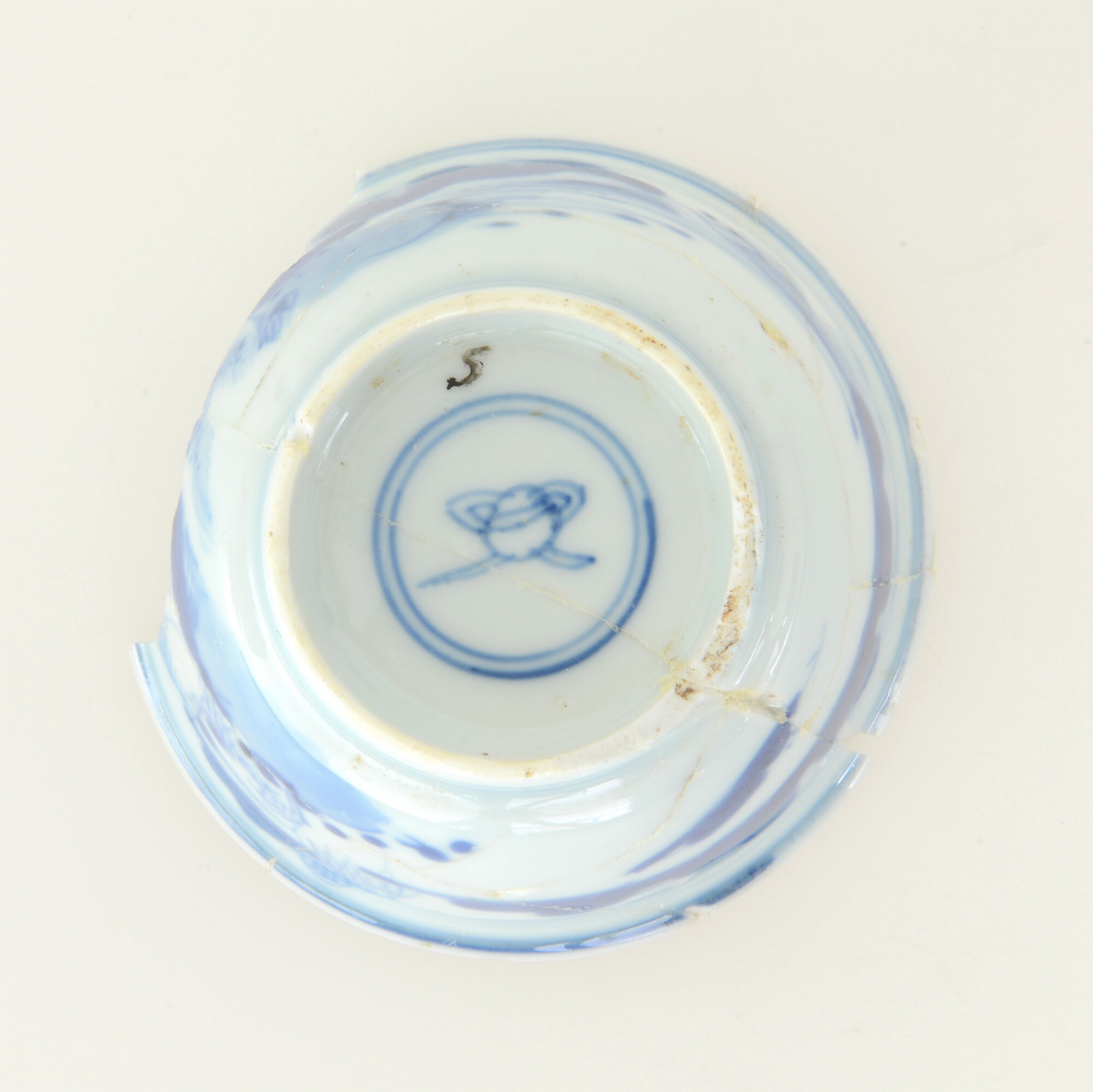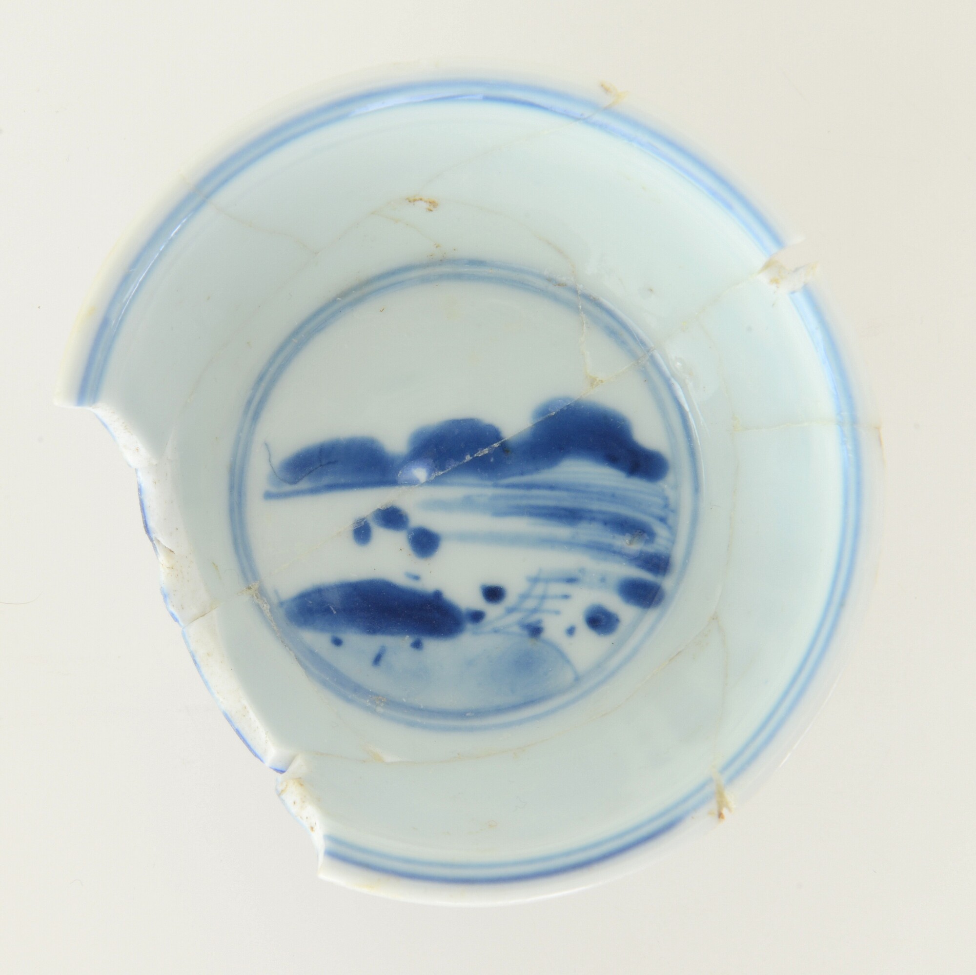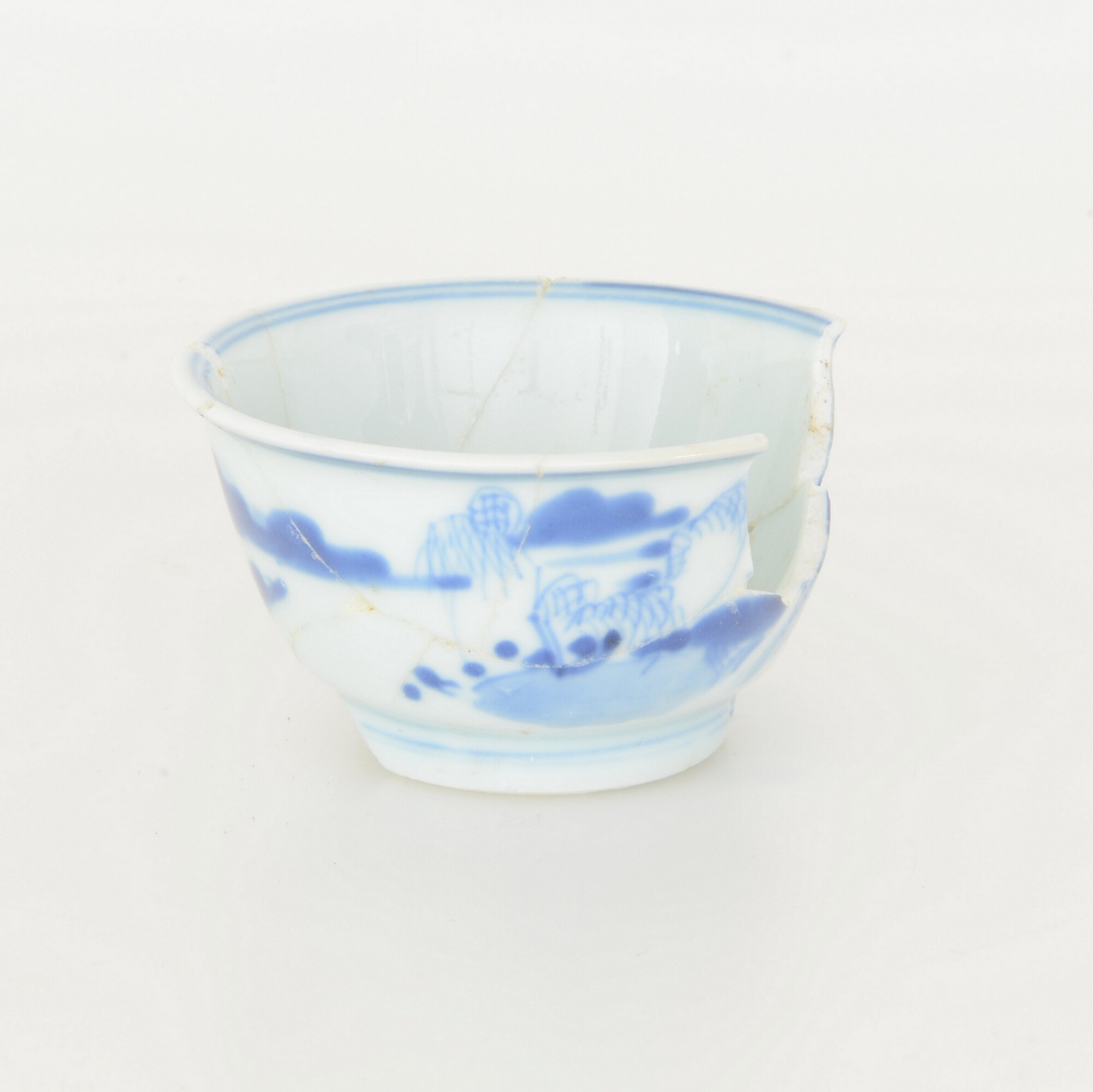 Kop; p-kop-1; kop met iets uitgebogen rand; Chinees porselein; veldspaatglazuur, onderglazuur blauw; inw, sp: landschap, uitw.: landschap; standring; merk; herkomst: China, Jingdezhen