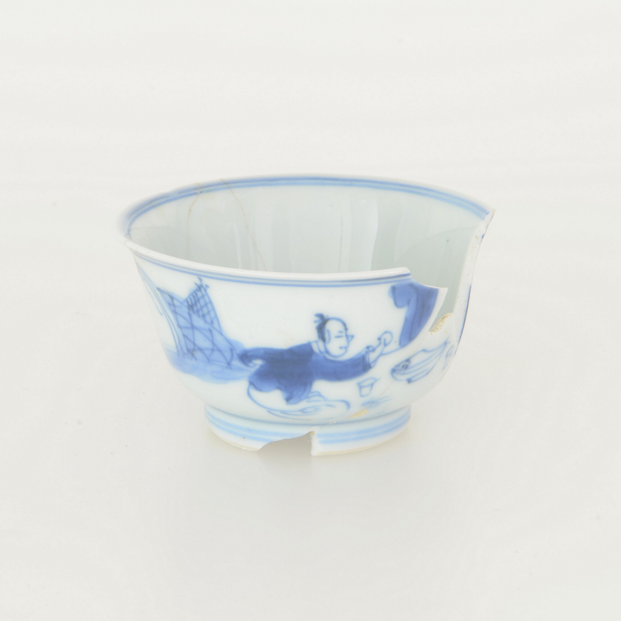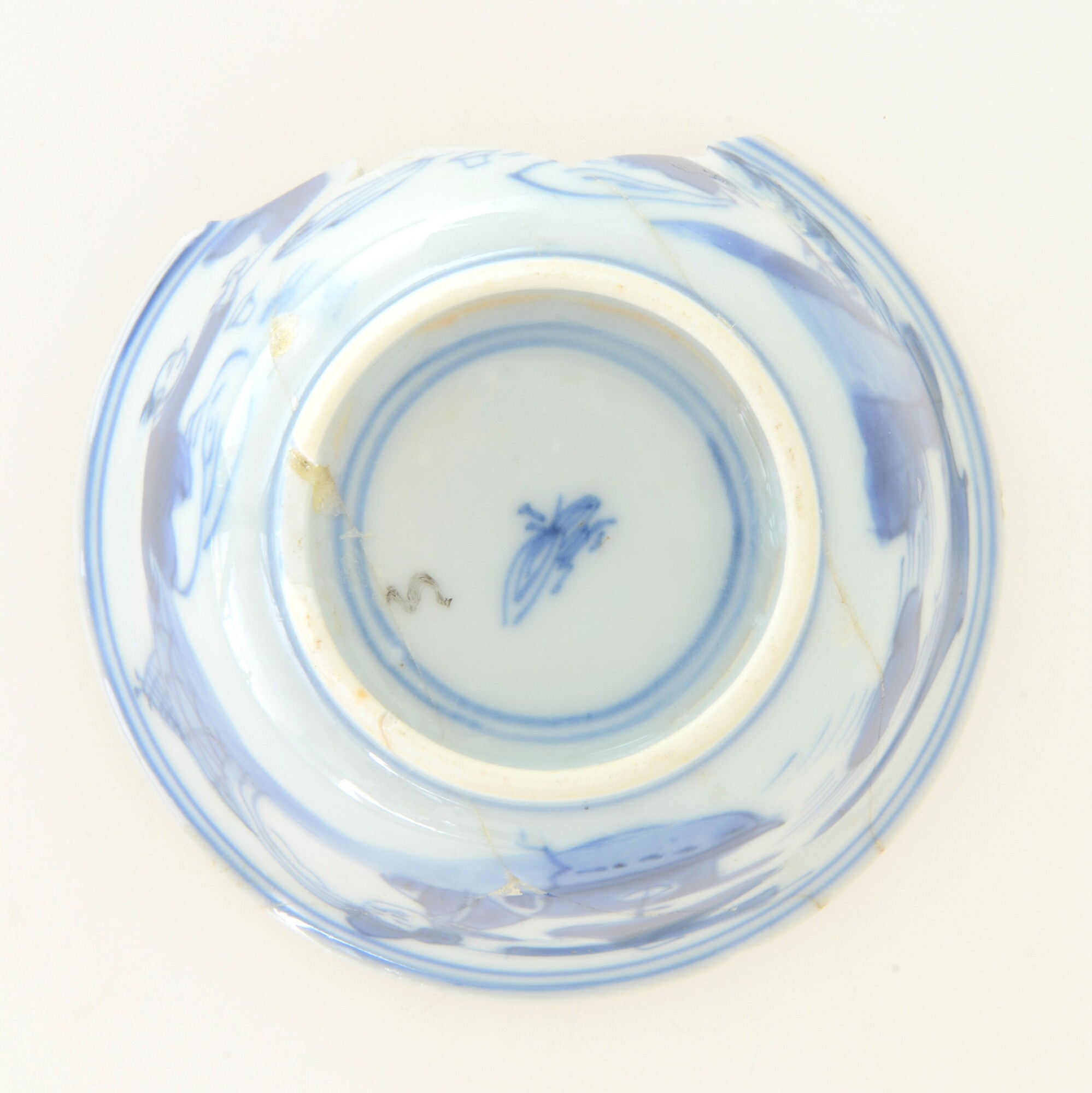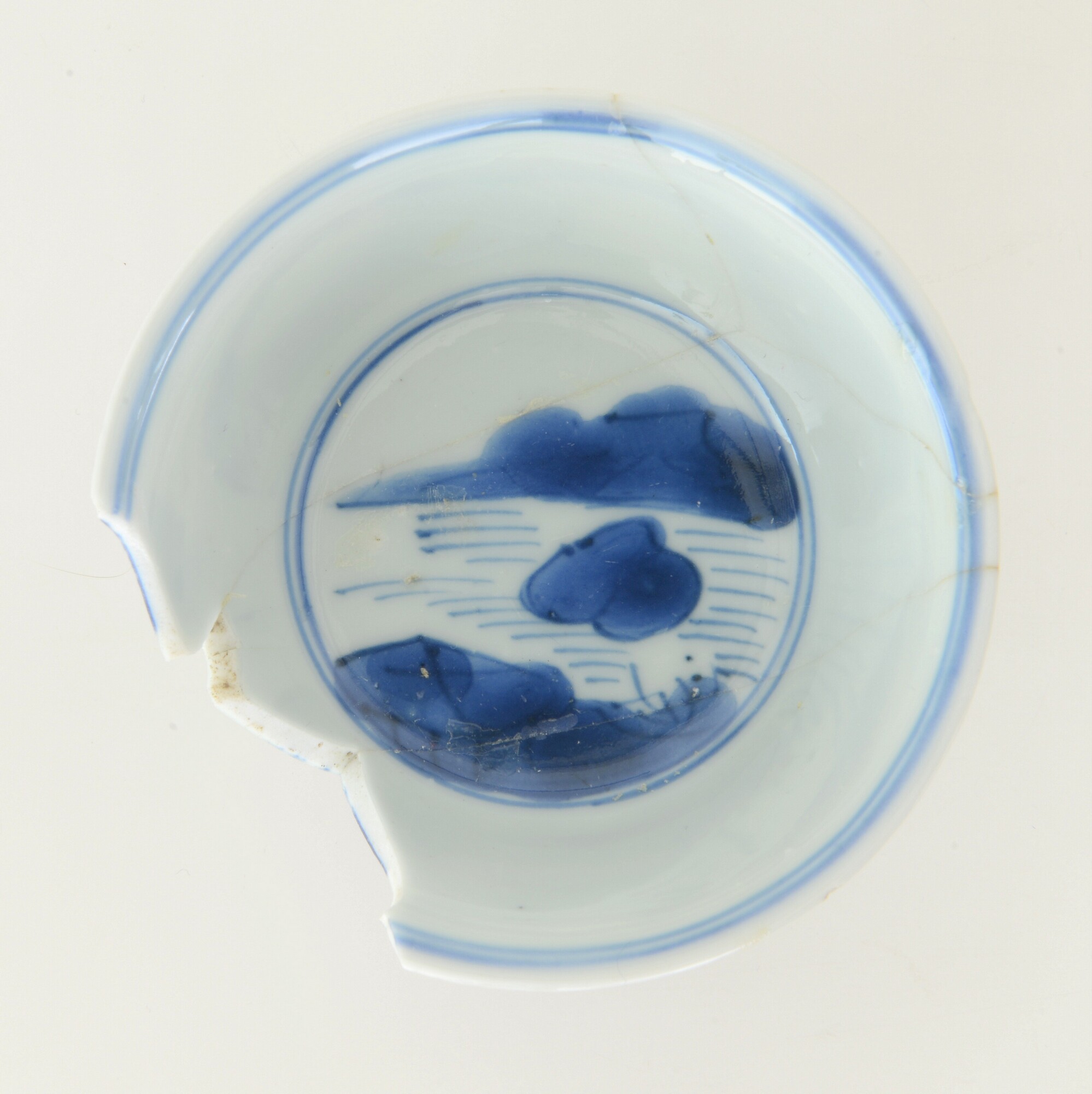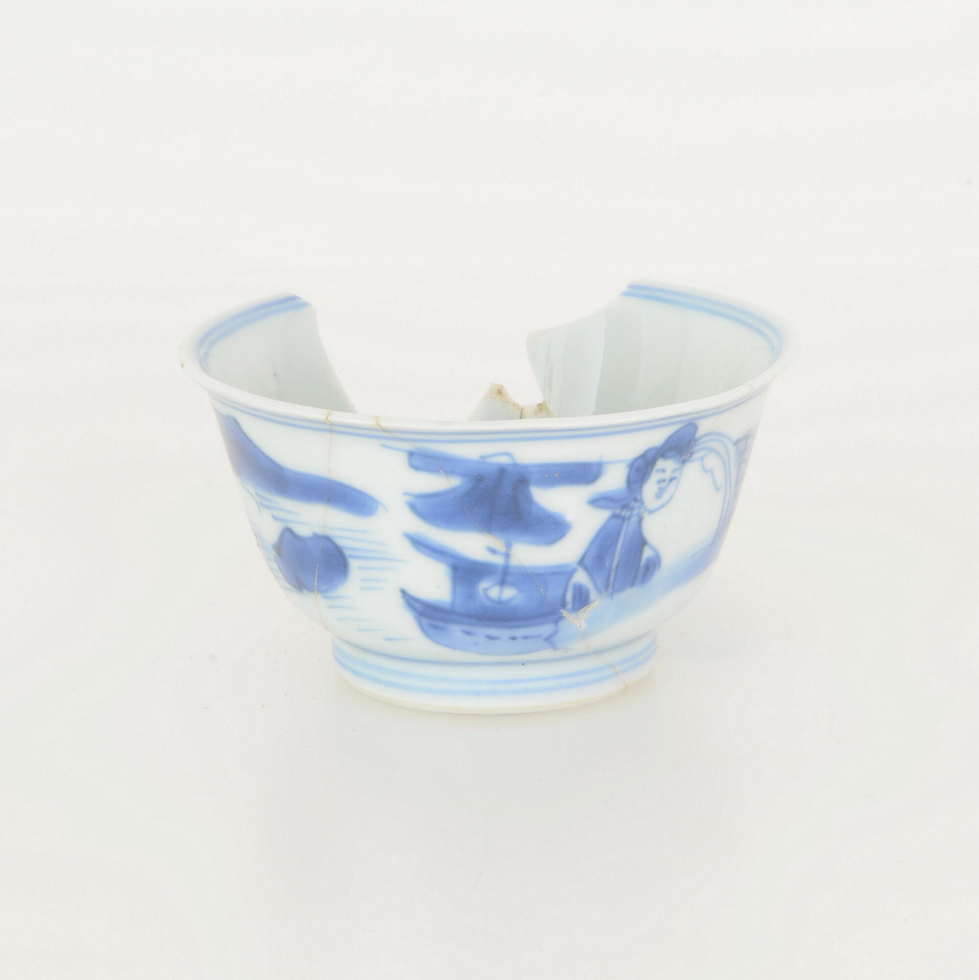 Kop; p-kop-1; kop met iets uitgebogen rand; Chinees porselein; veldspaatglazuur, onderglazuur blauw; inw, sp: landschap, uitw.: Lange Lijs en zotje in landschap; standring; merk; herkomst: China, Jingdezhen