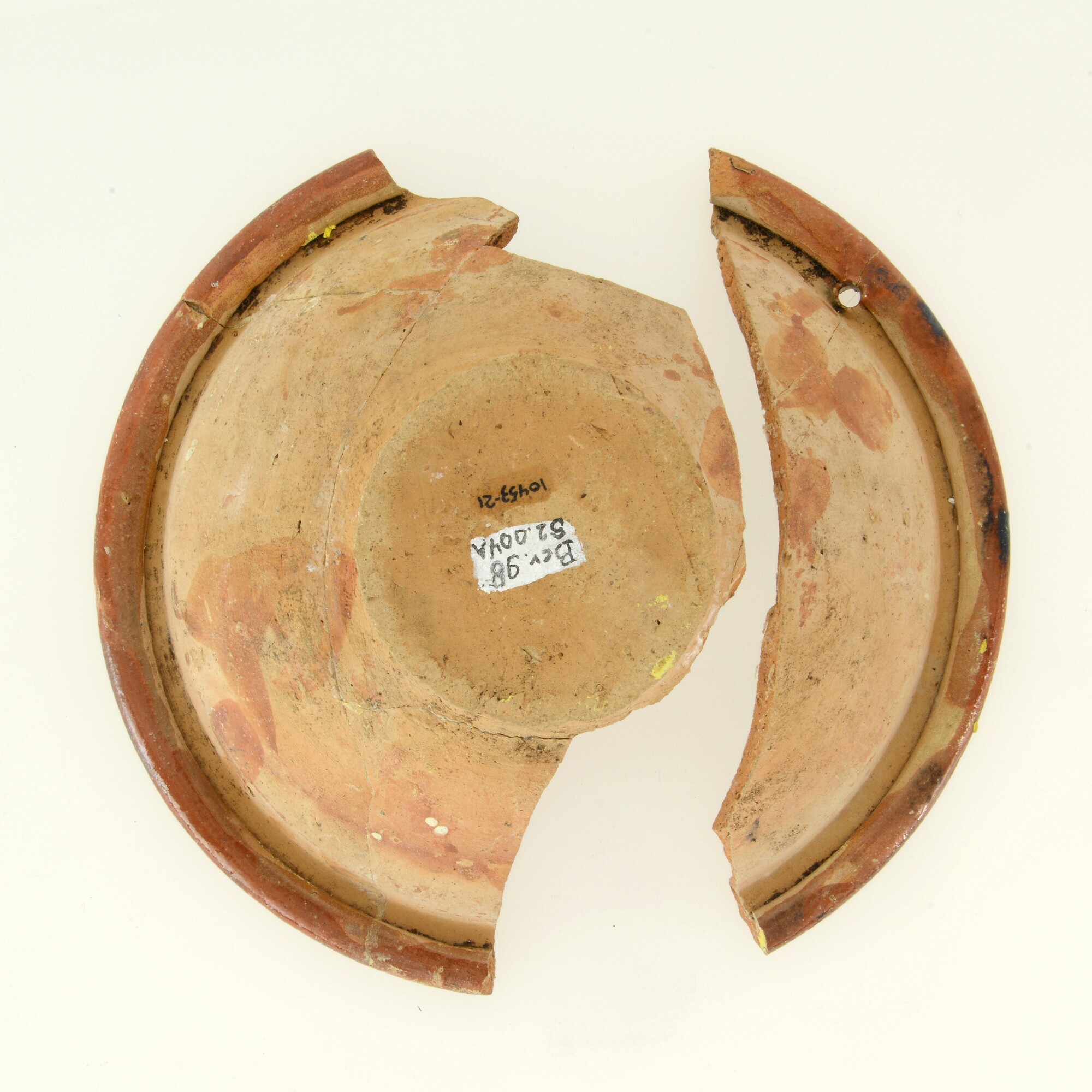Kom; wa-kom-2; kom met verdikte rand; roodbakkend aardewerk; inwendig loodglazuur, slib; koperoxide, spiegel: bloem/plant, vl: concentrische cirkels; standvlak; doorboring in rand; herkomst: Duitsland, Werra gebied