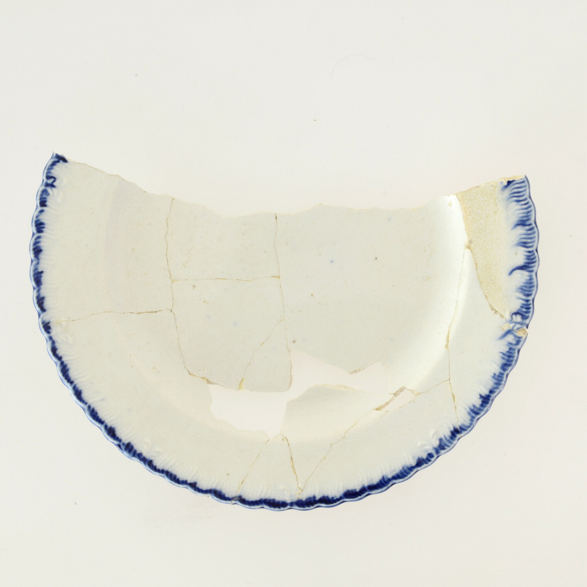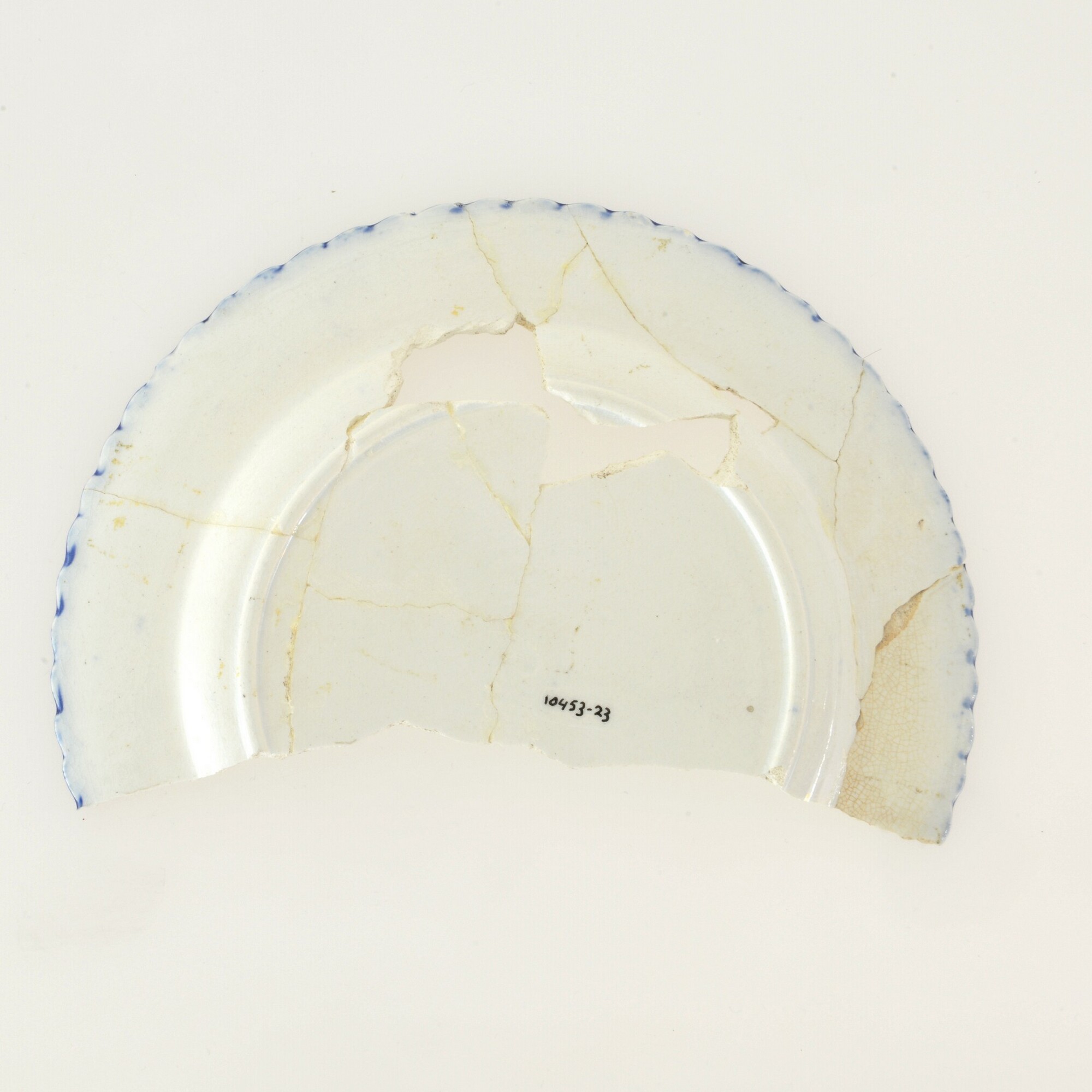Bord; iw-bor-11; ondiep bord met vlag met reliefversiering, knik van spiegel naar vlag; industrieel wit aardewerk; in- en uitwendig loodglazuur. kobaltblauw; shell edge blue, golfrand; herkomst: Engeland?