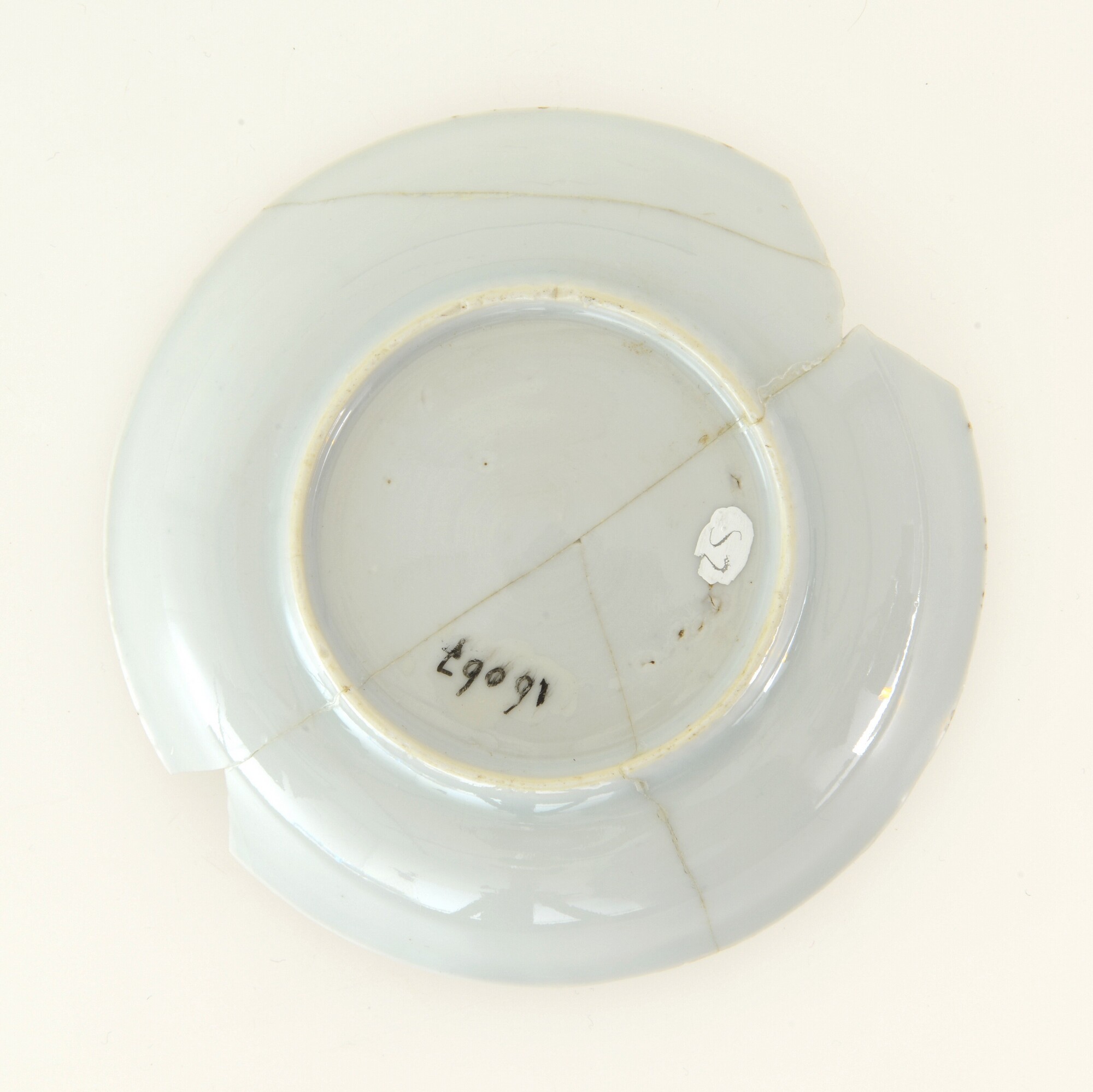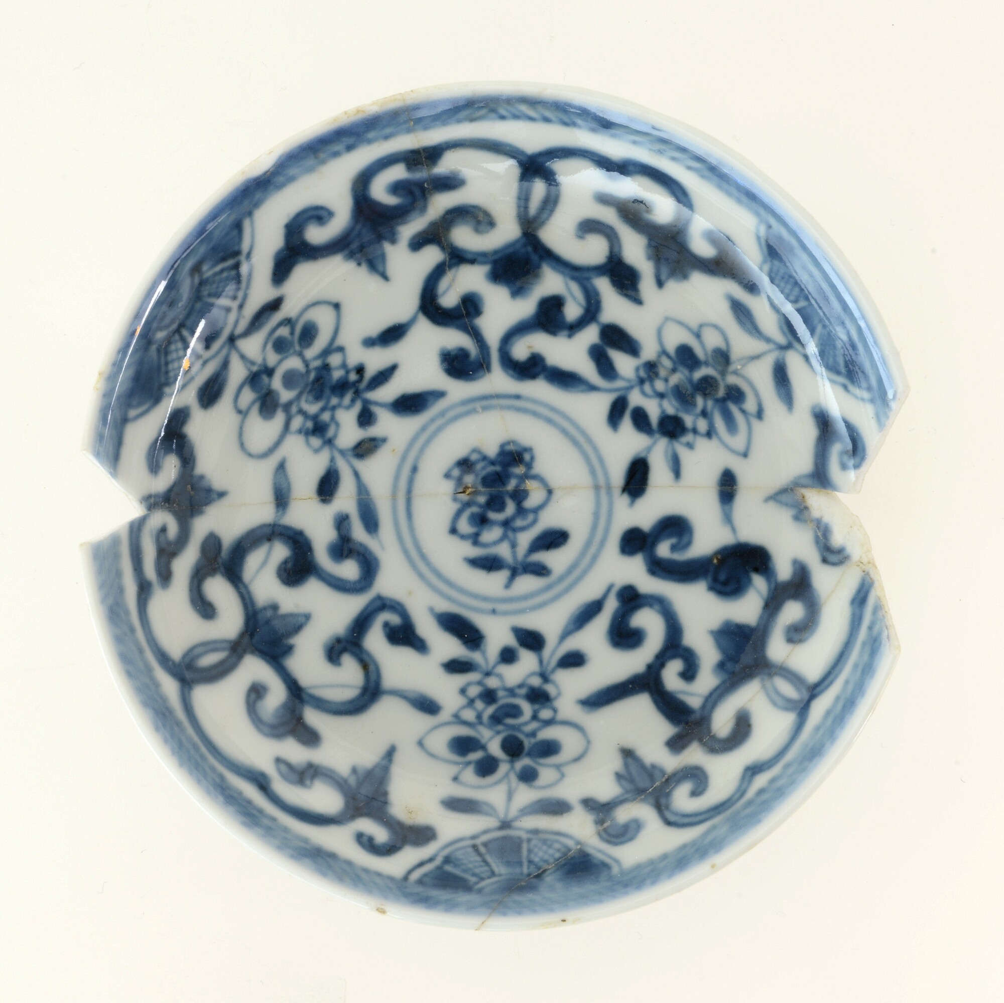 Bord; p-bor-1; klein diep bord zonder vlag met uitgebogen rand; ; porselein; veldspaatglazuur, onderglazuur blauw; sp: bloemen en lotusranken, vl: visgraat; standring; herkomst: China