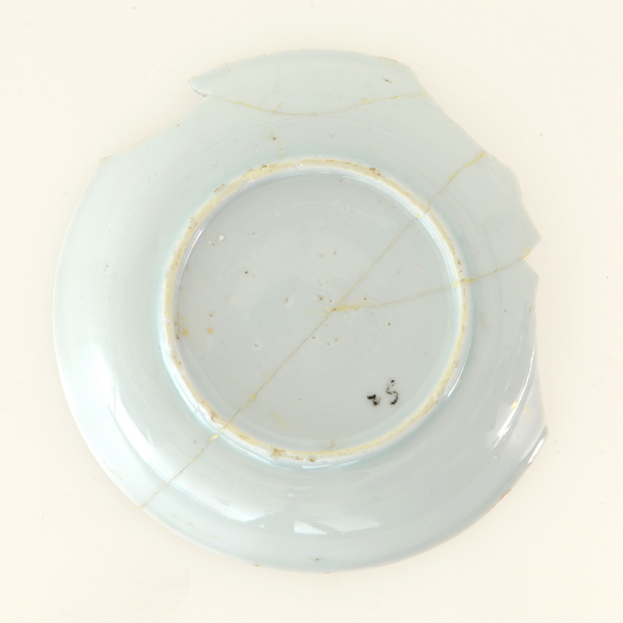 Bord; p-bor-1; klein diep bord zonder vlag met uitgebogen rand; porselein; veldspaatglazuur, onderglazuur blauw; sp: visser in rivierenlandschap, vl: visgraat; standring; herkomst: China