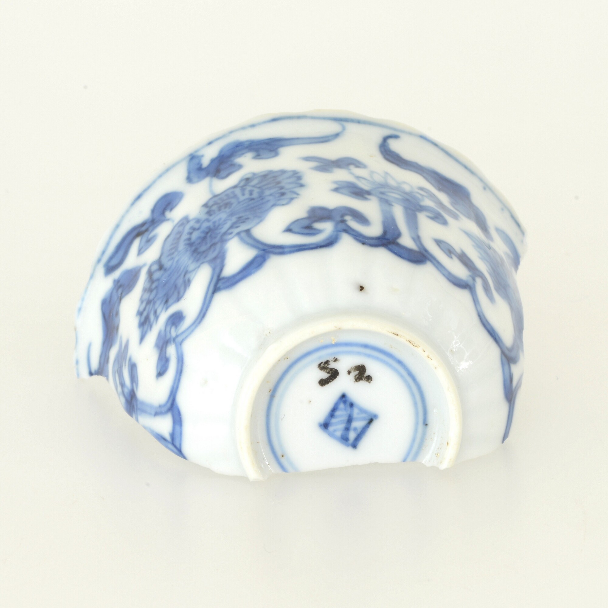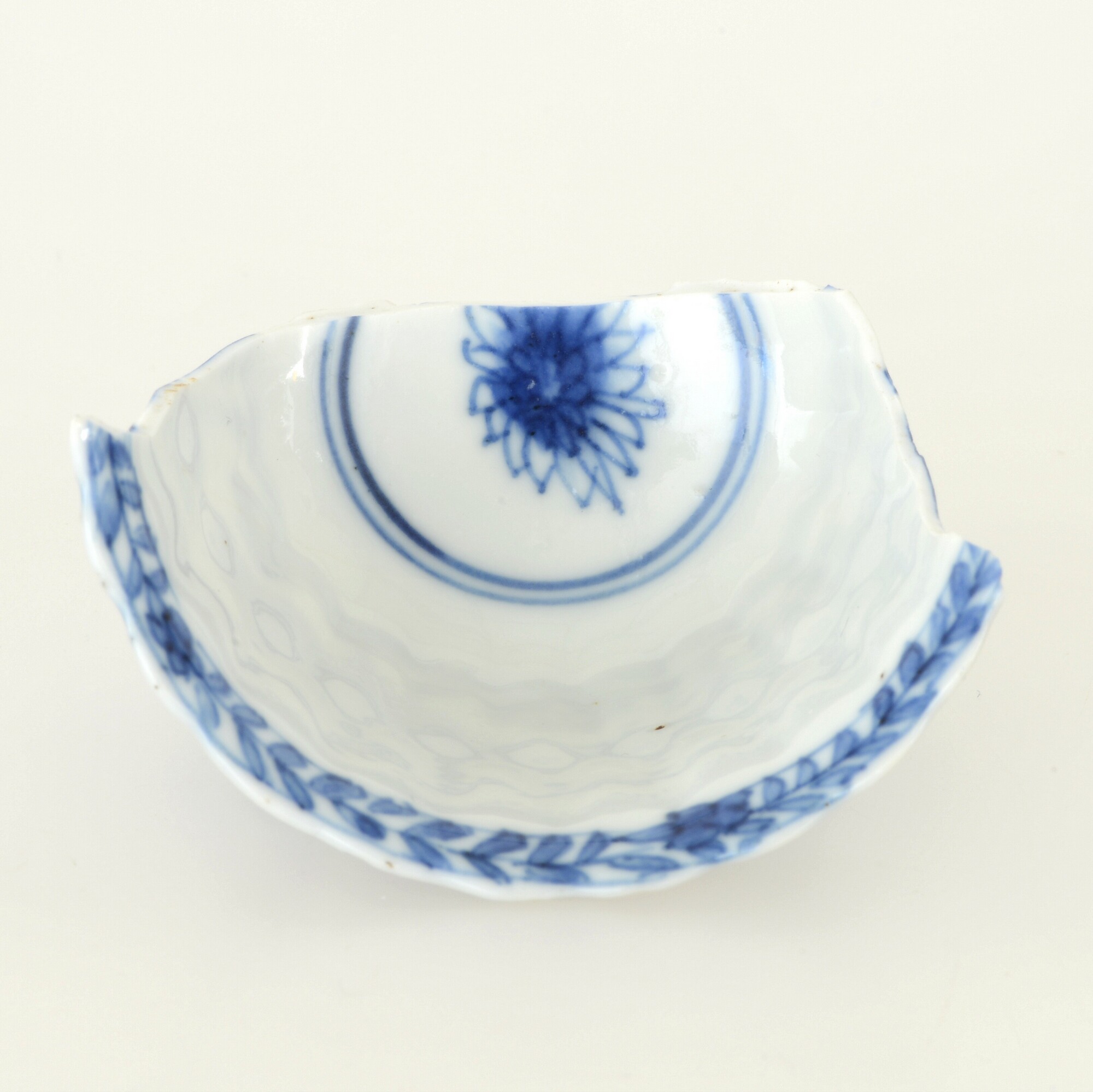 Kop; p-kop-5; in mal gevormde kop met reliefversierde wand en uitstaande rand; porselein; veldspaatglazuur, onderglazuur blauw; inw: chrysant, uitw: bloemen; standring; merkteken; herkomst: China