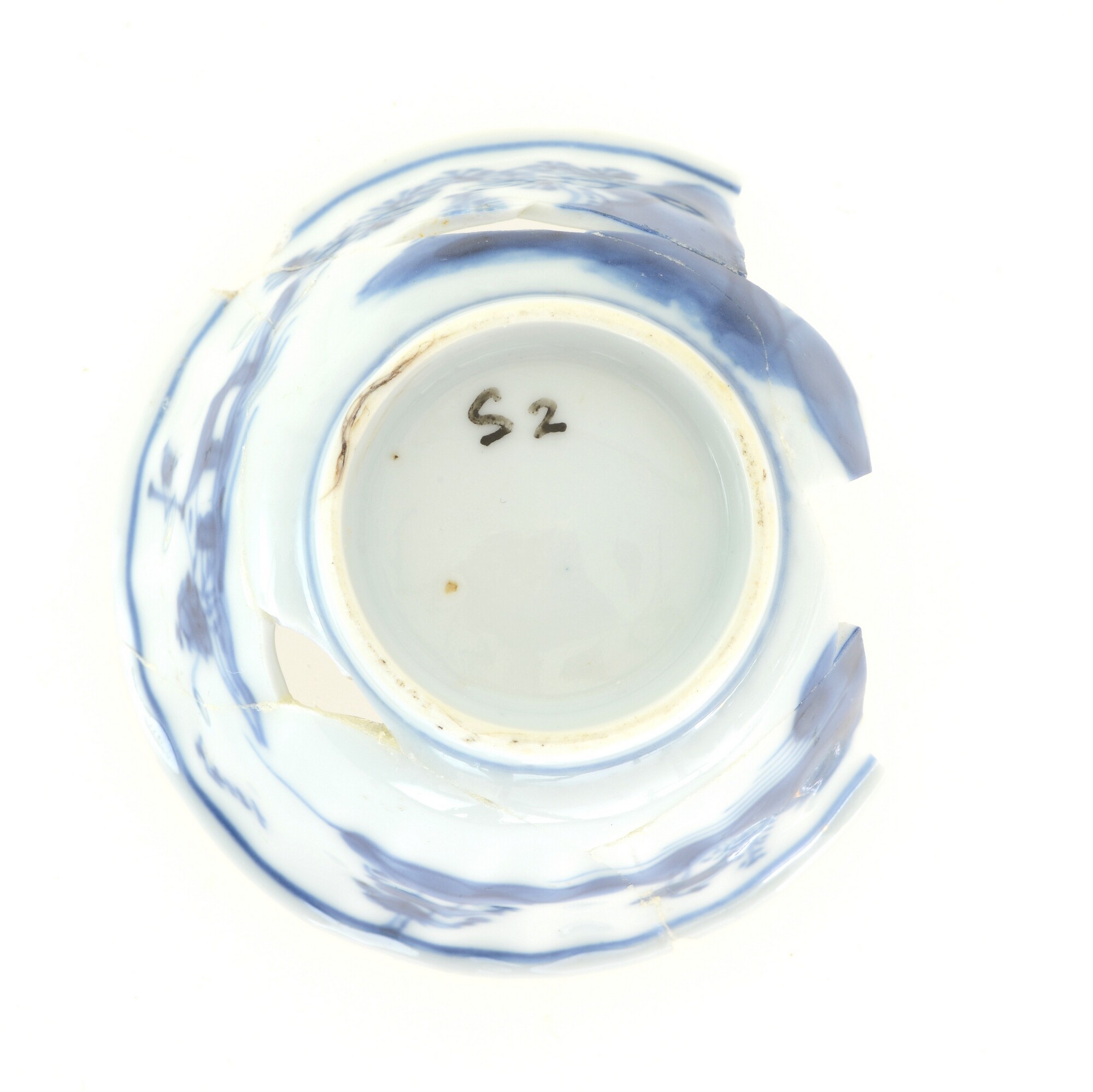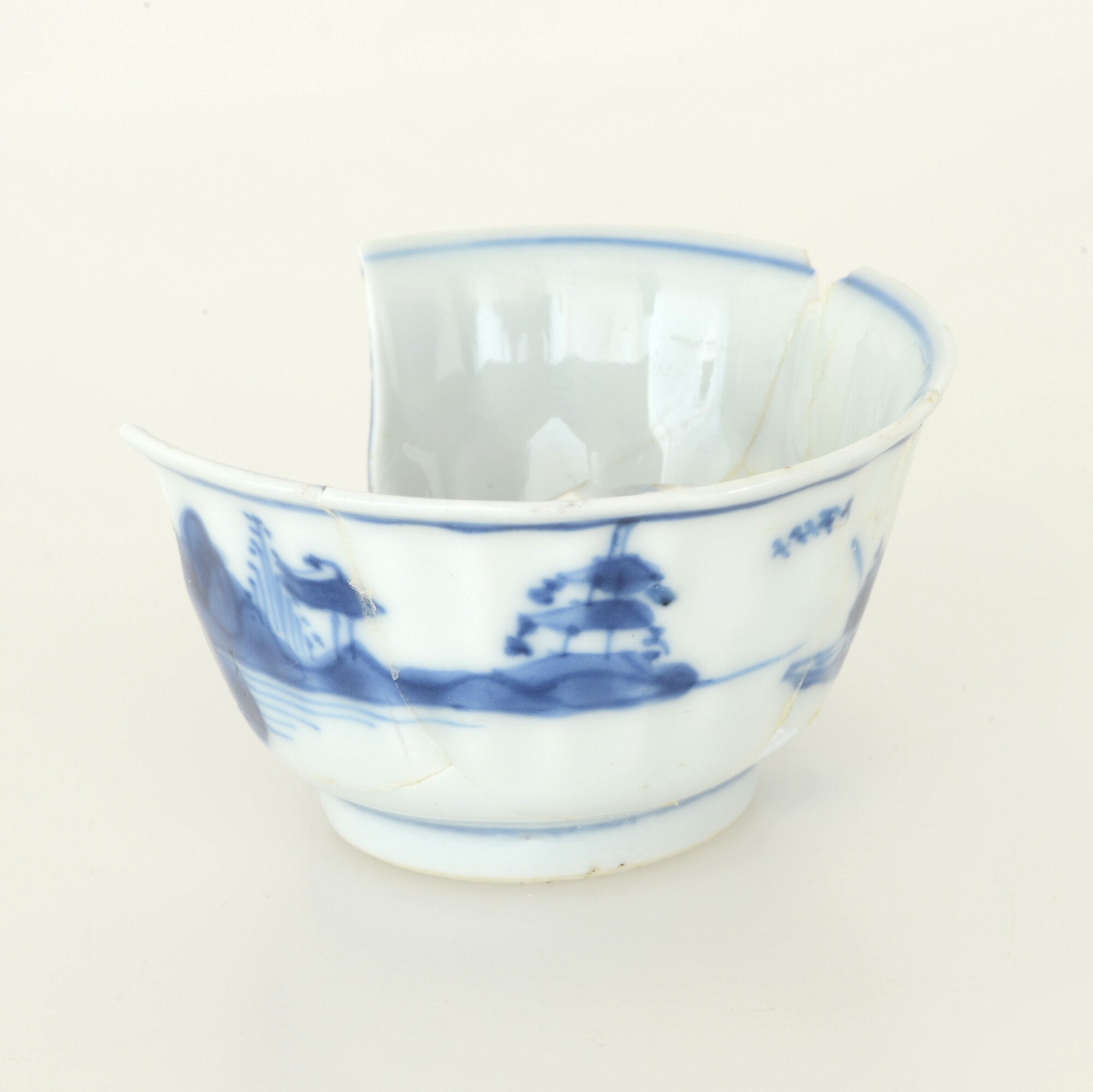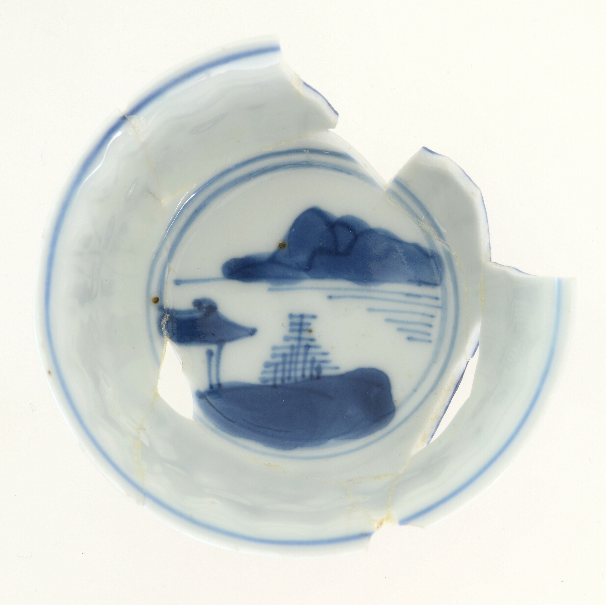 Kop; p-kop-5; in mal gevormde kop met reliefversierde wand en uitstaande rand; porselein; veldspaatglazuur, onderglazuur blauw; inw: landschap, uitw: rivierenlandschap; standring; herkomst: China