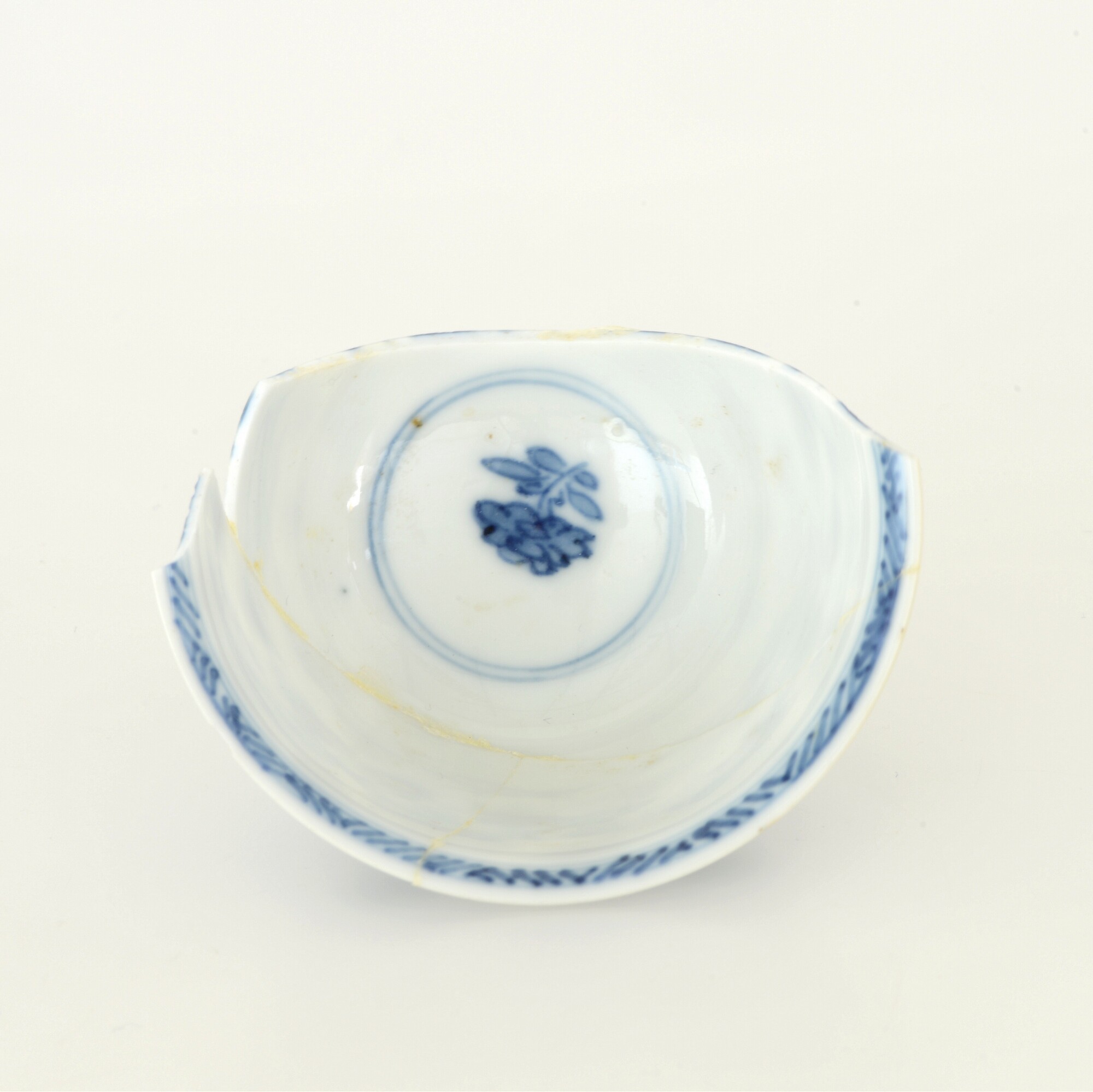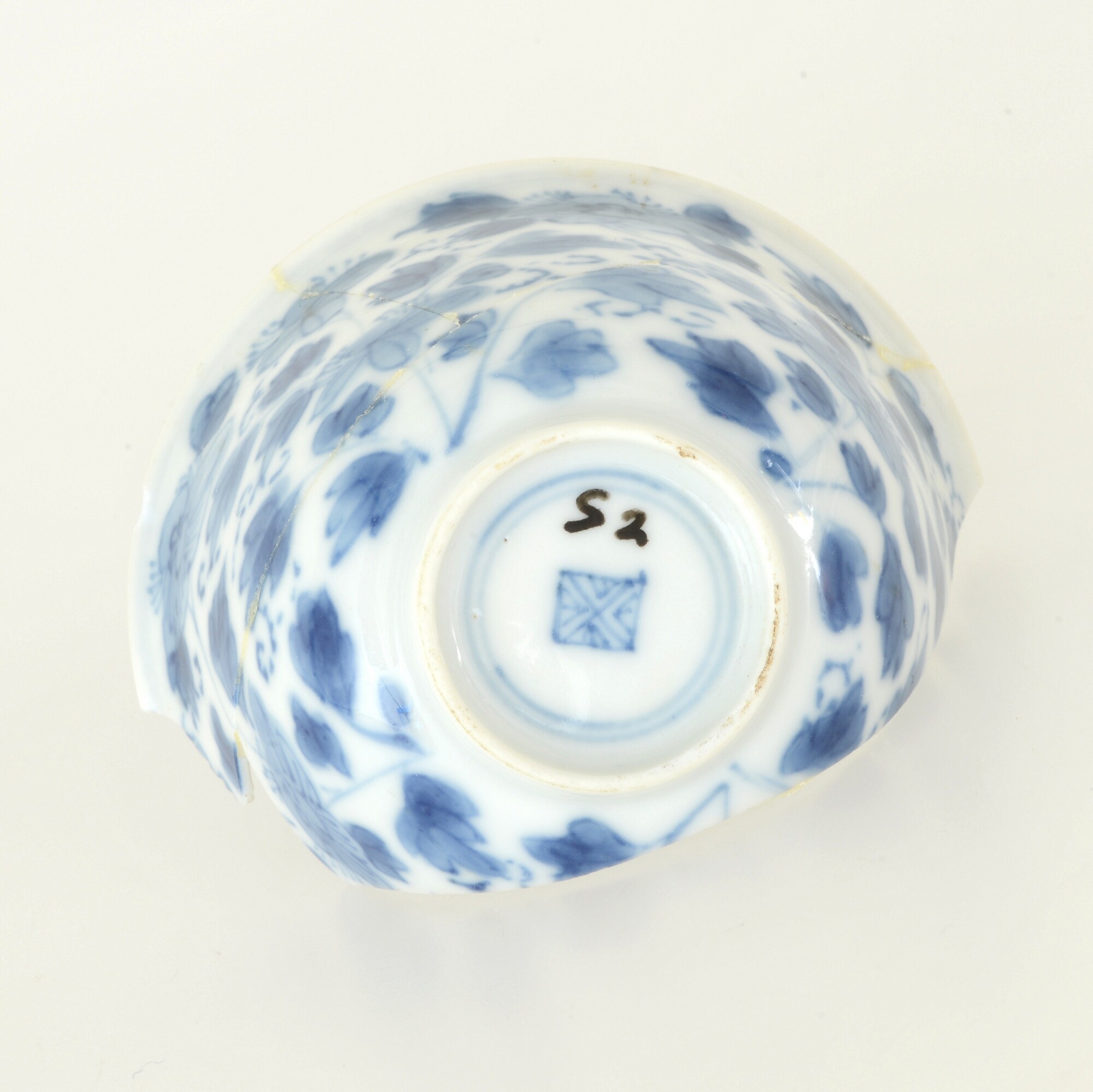 Kop; p-kop-1; kop met iets uitgebogen rand; porselein; veldspaatglazuur, onderglazuur blauw; inw: bloem, visgraat; uitw.: bloemen; standring; merkteken; herkomst: China