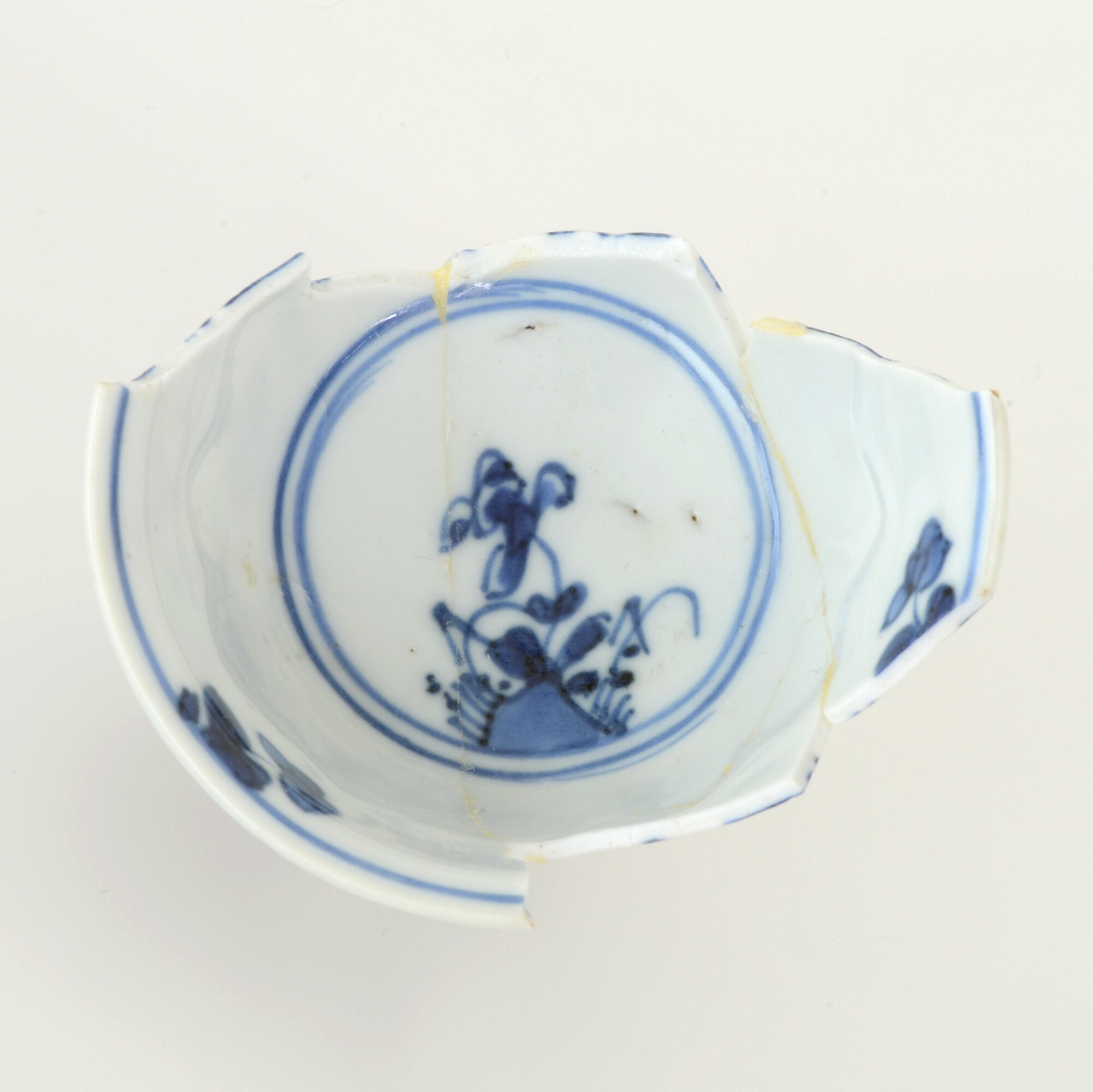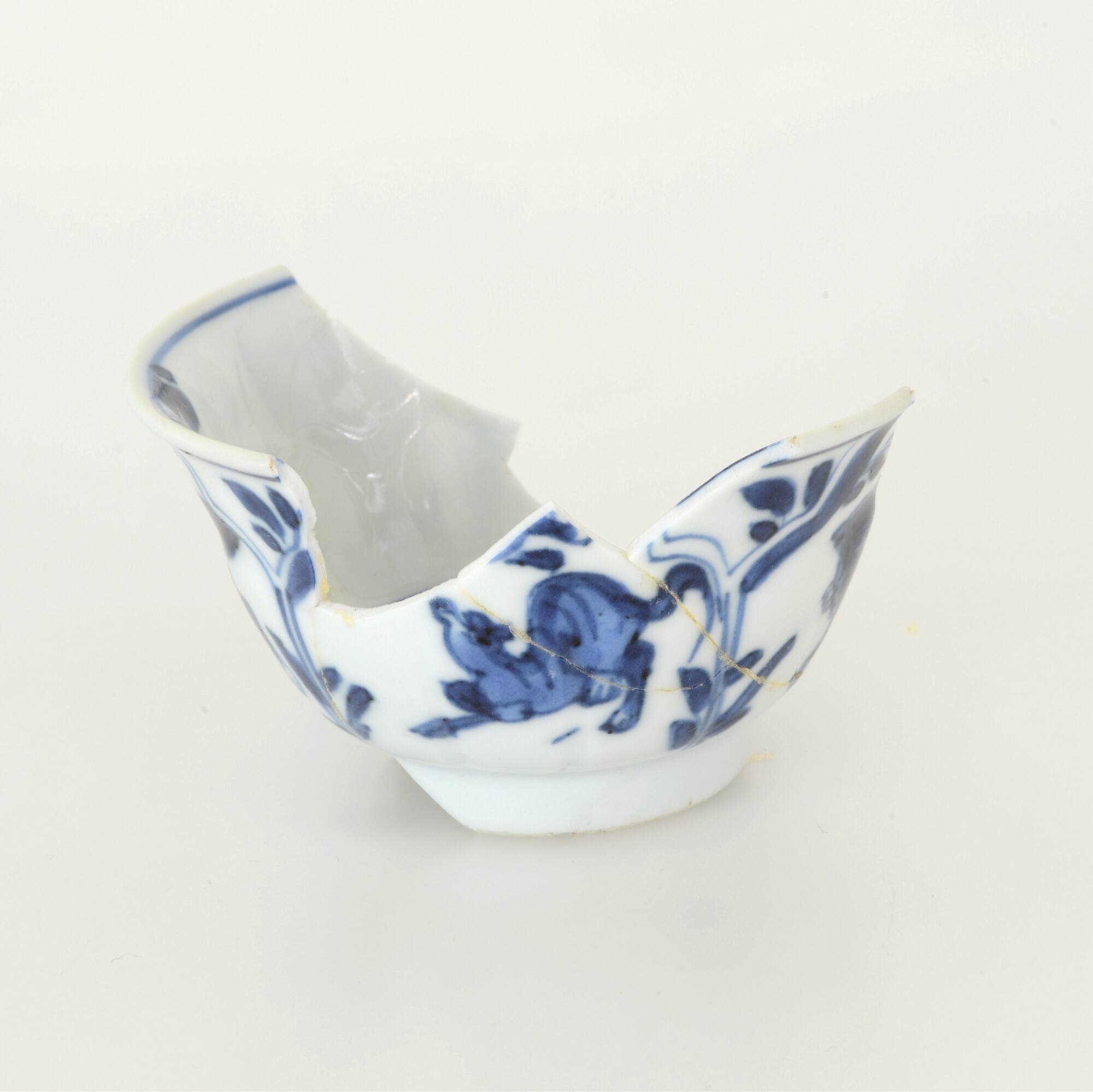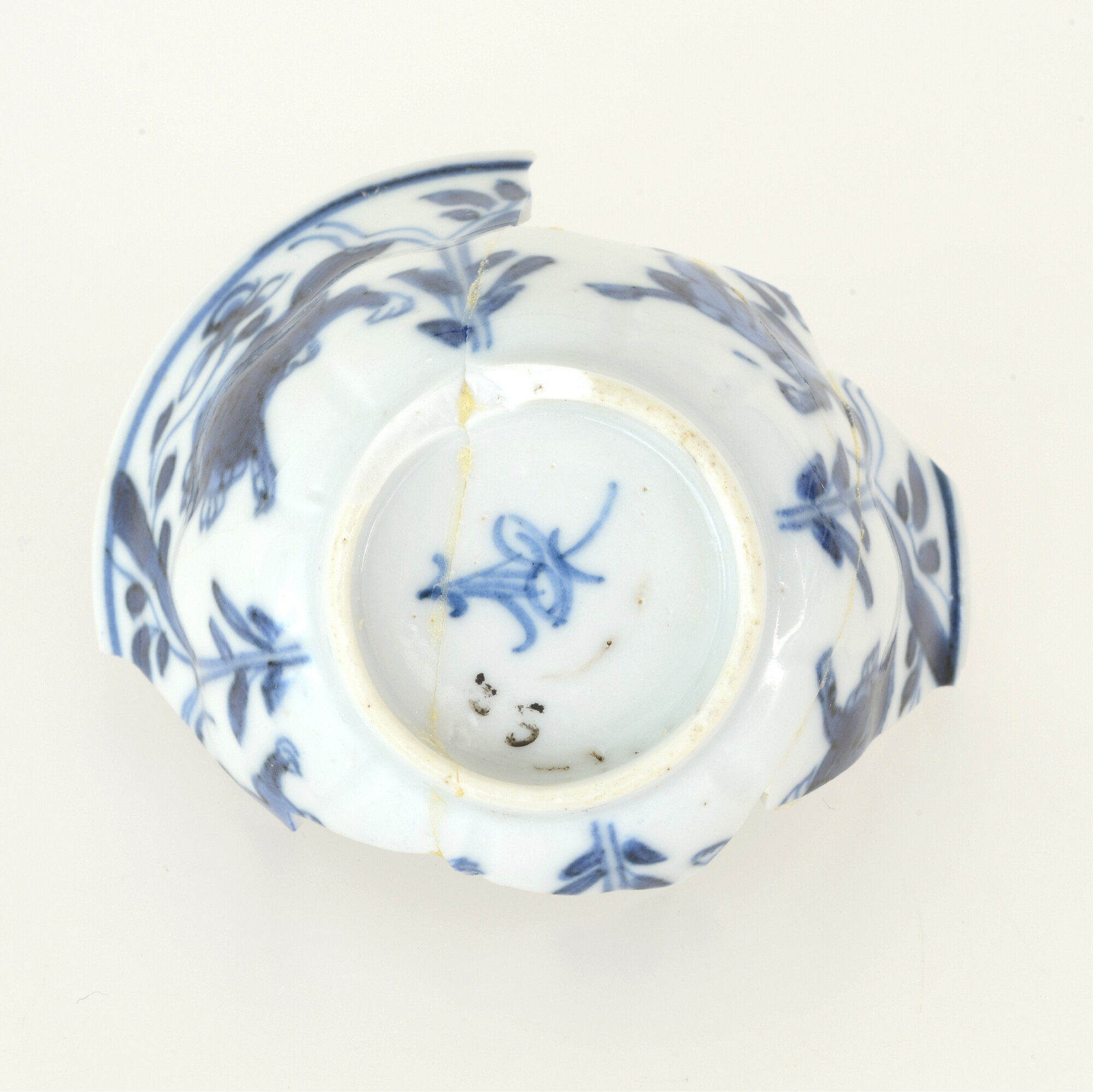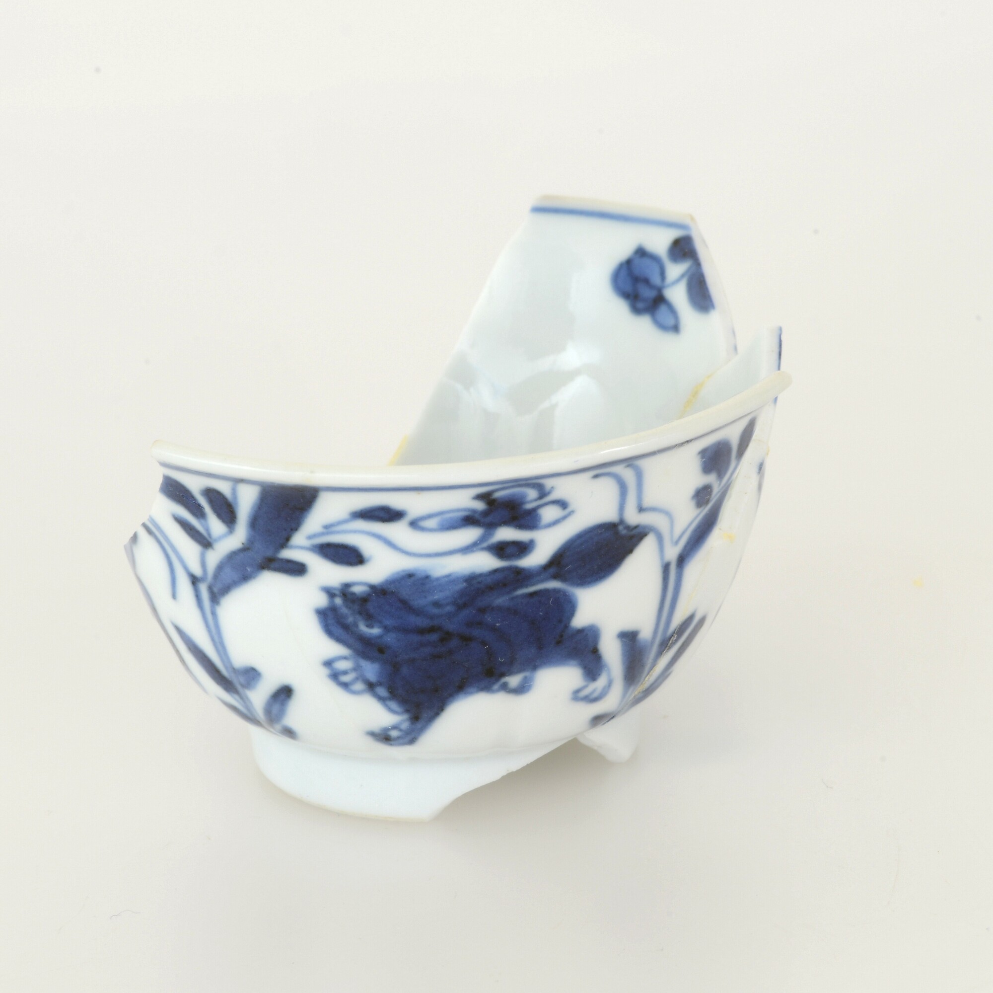Kop; p-kop-9; in mal gevormde kop met plooiwand en uitgebogen rand; veldspaatglazuur, onderglazuur blauw; inw.: bloem; uitw.: floraal motief en fu hond; standring; merkteken; herkomst: China