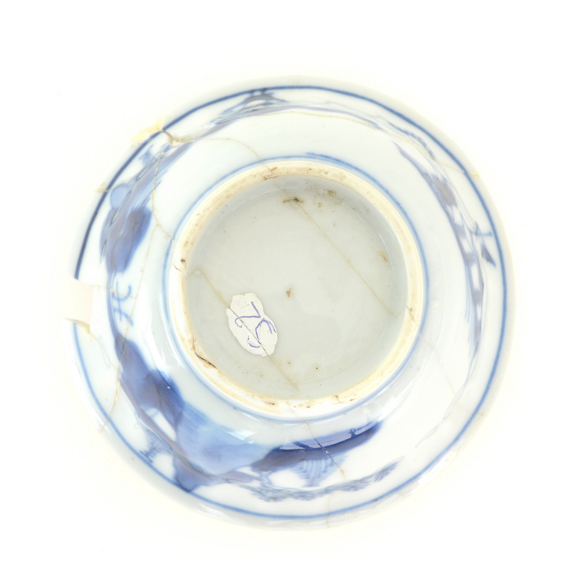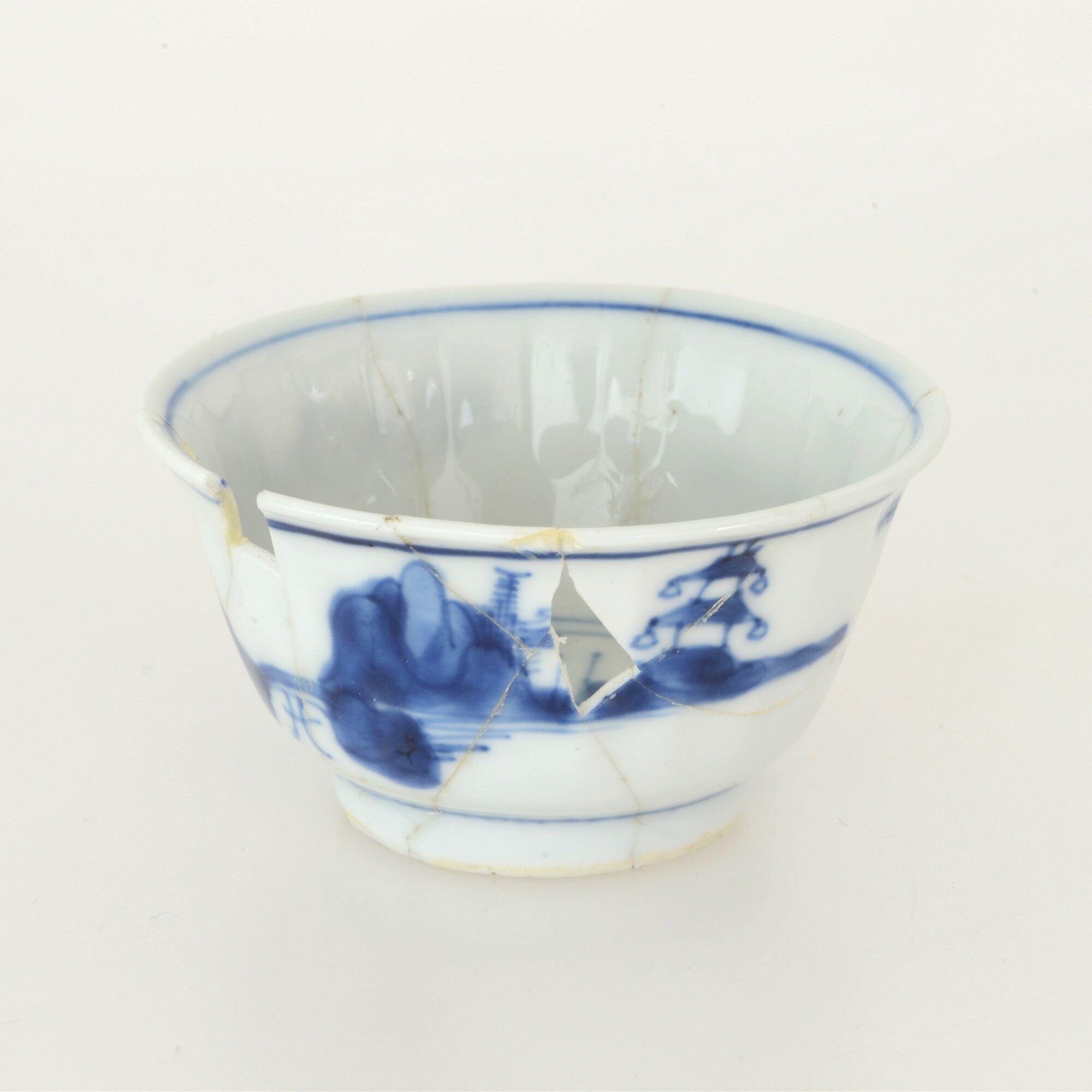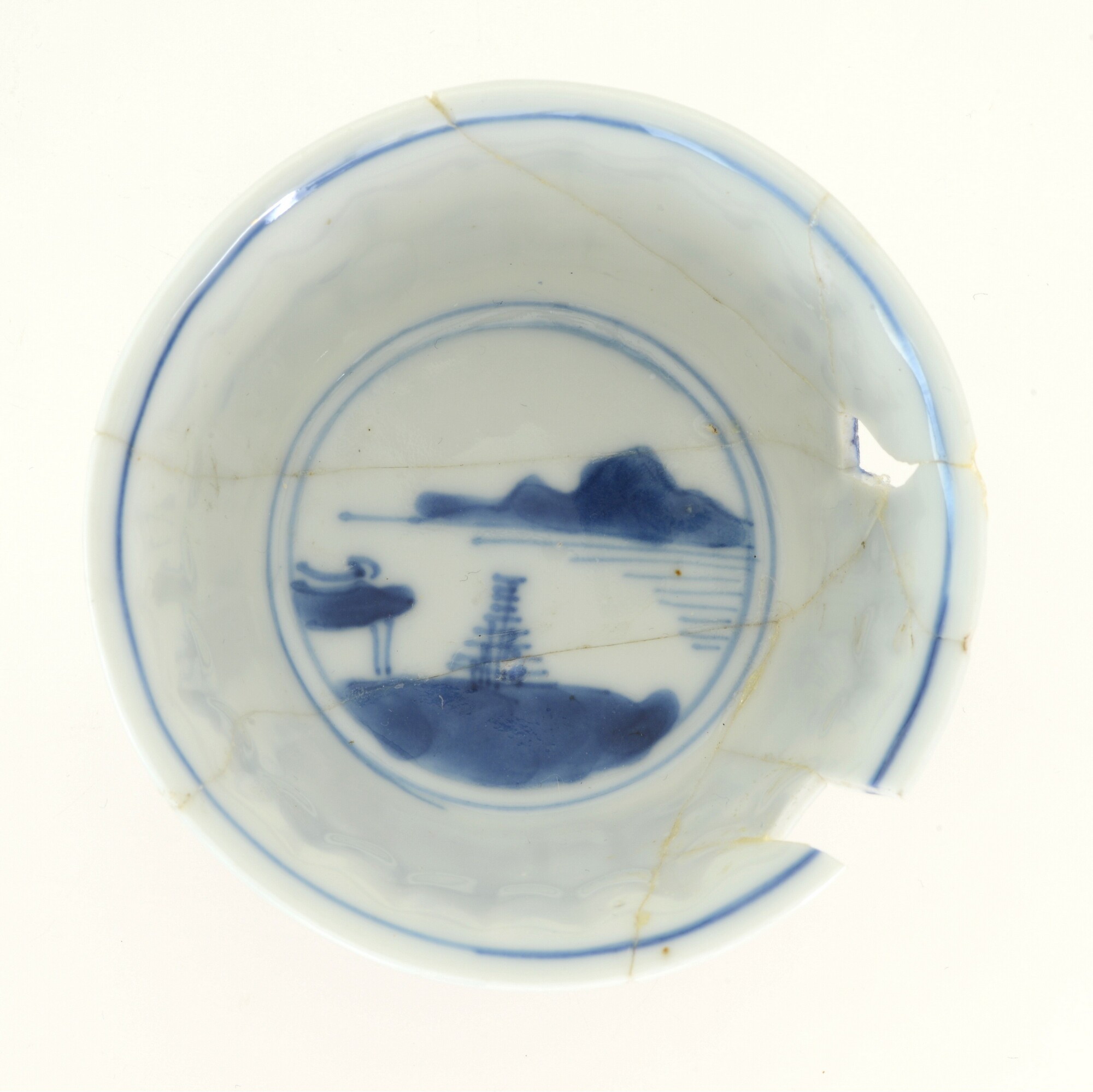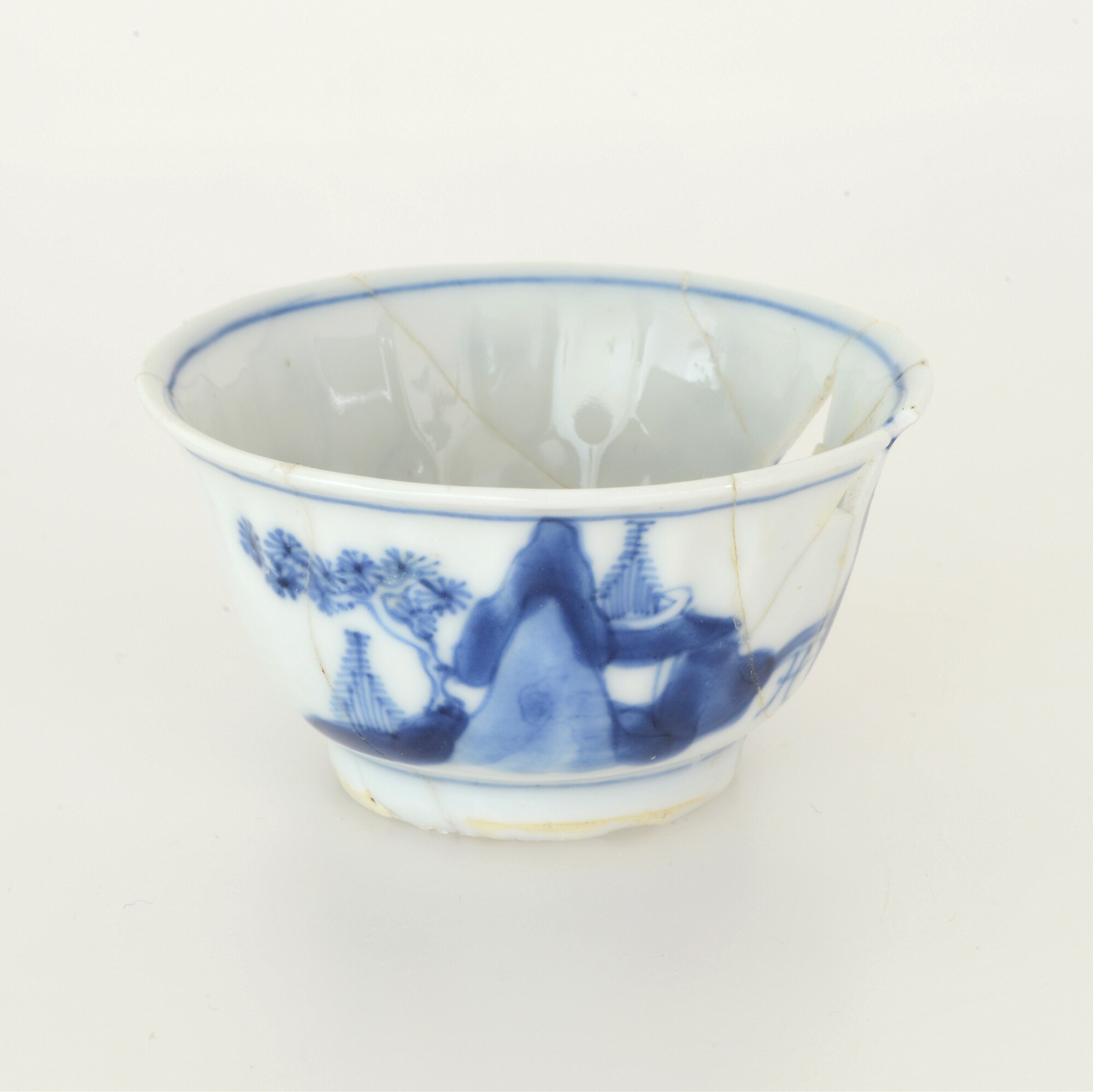 Kop; p-kop-5; in mal gevormde kop met reliefversierde wand en uitstaande rand; porselein; veldspaatglazuur, onderglazuur blauw; inw.: landschap binnen twee concentrische cirkels, uitw.: landschap; standring; herkomst: China