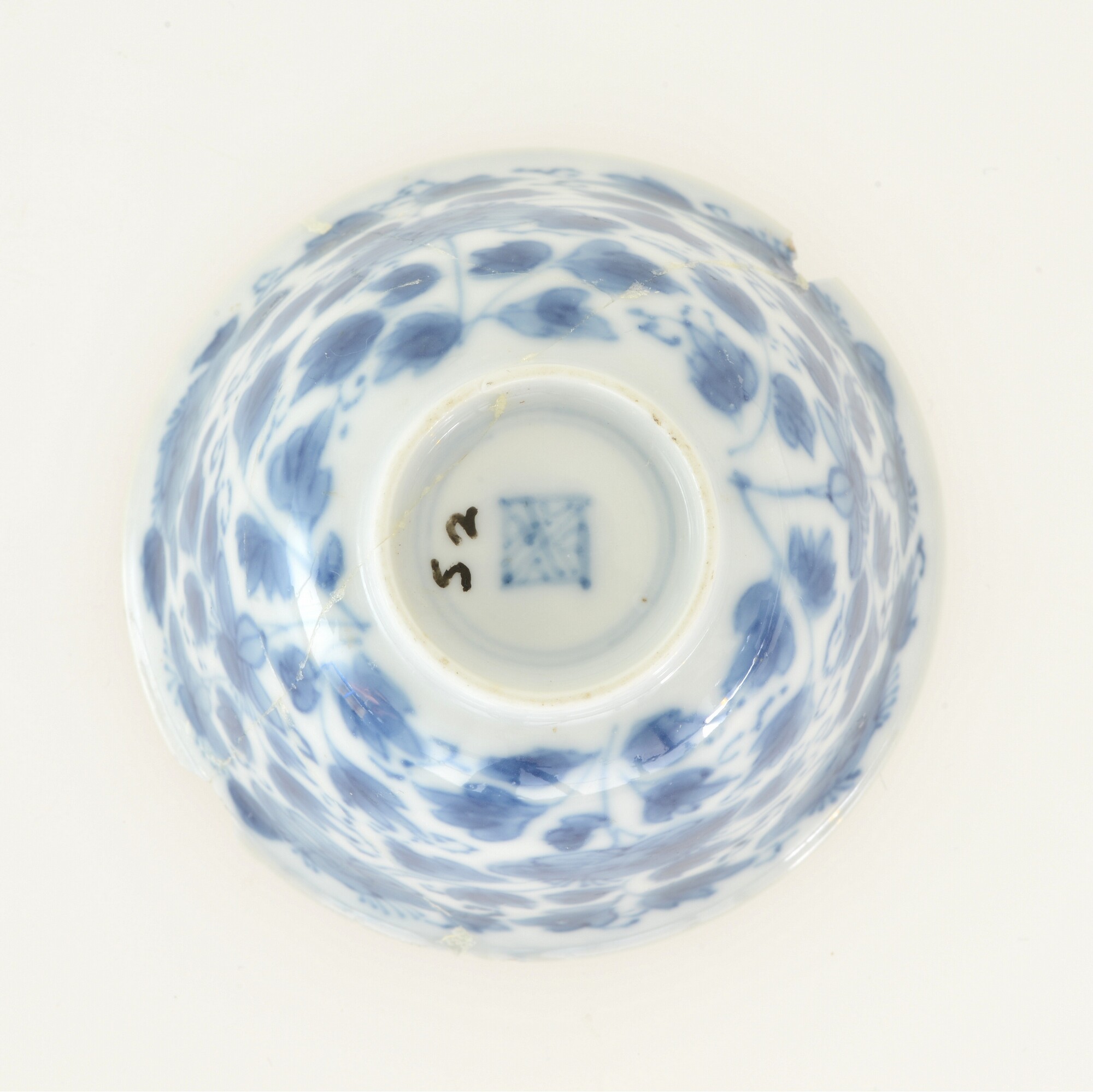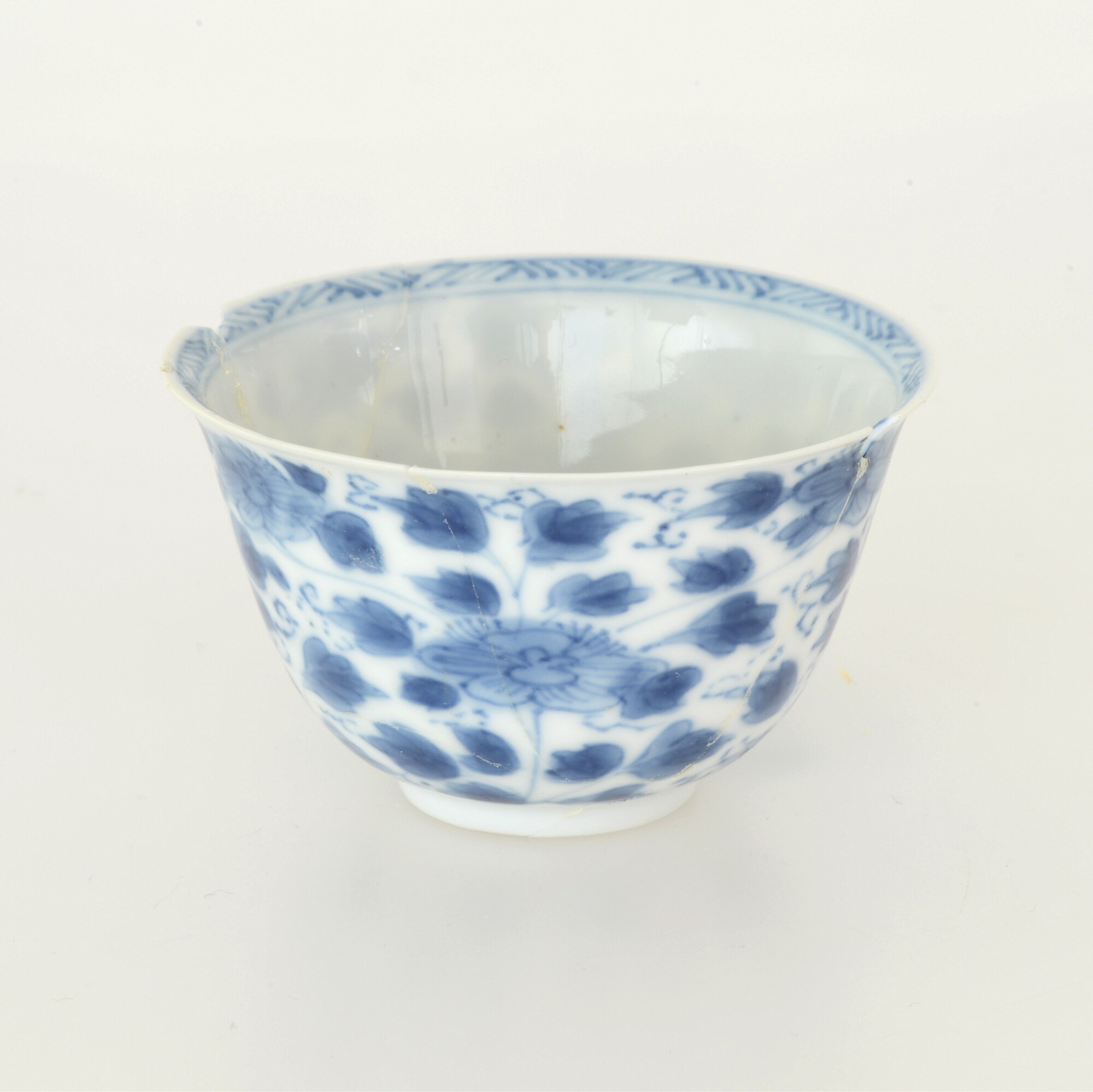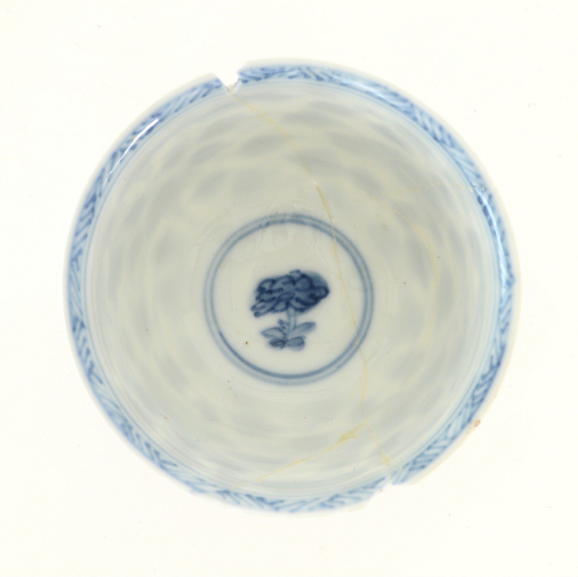 Kop; p-kop-1; kop met iets uitgebogen rand; porselein; veldspaatglazuur, onderglazuur blauw; inw.: bloem en visgraat, uitw.: bloemen; standring; merkteken; herkomst: China