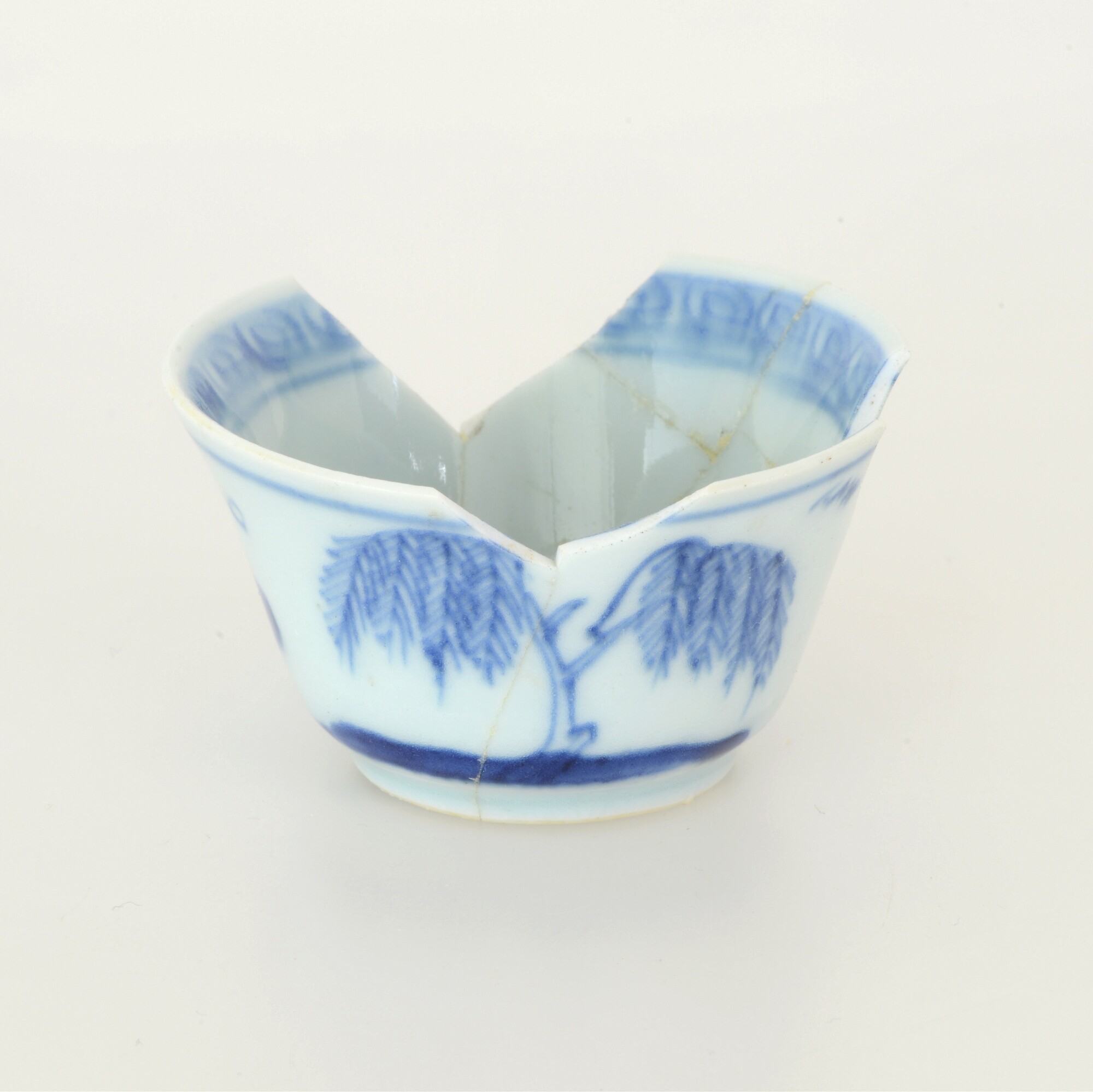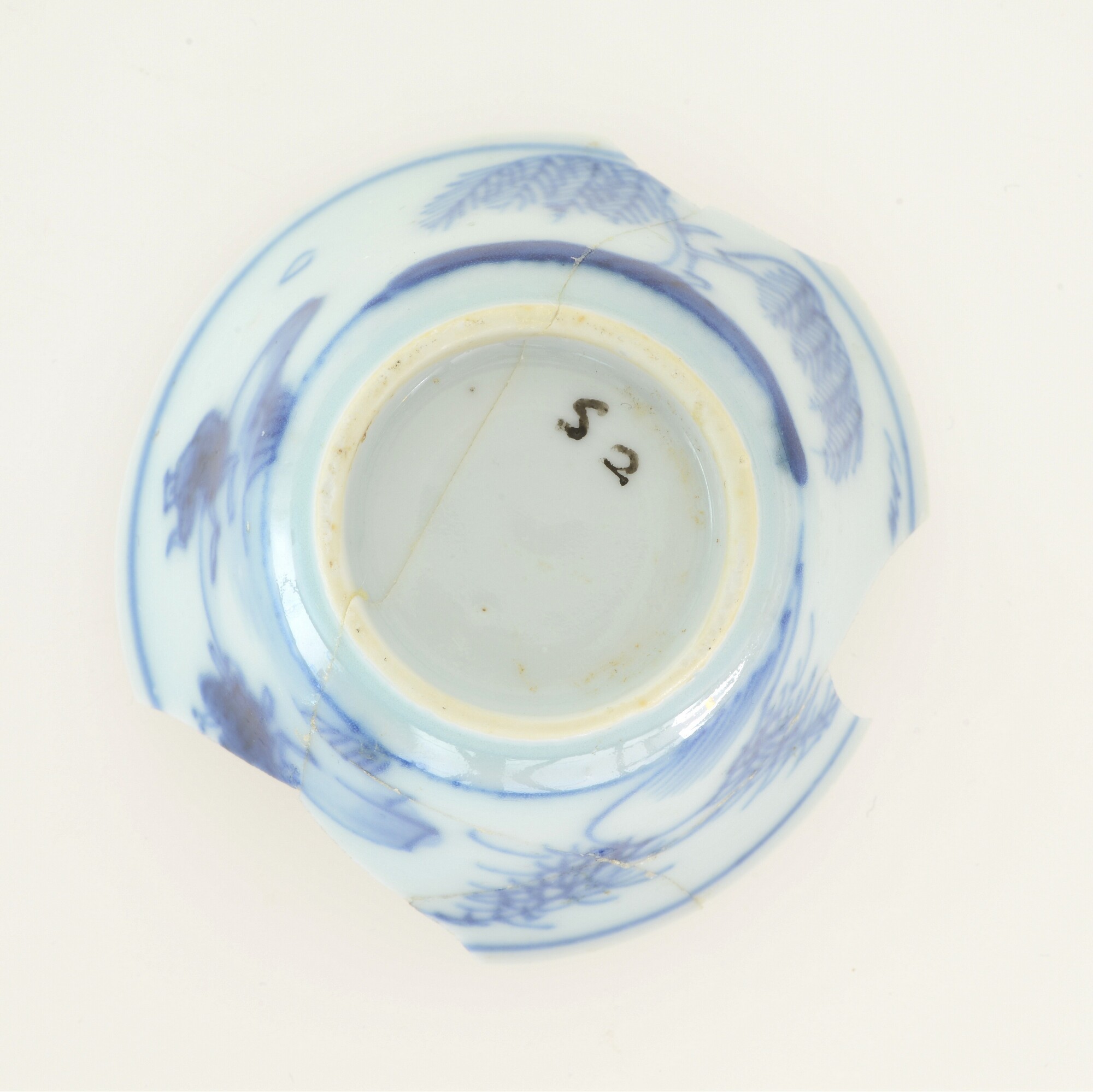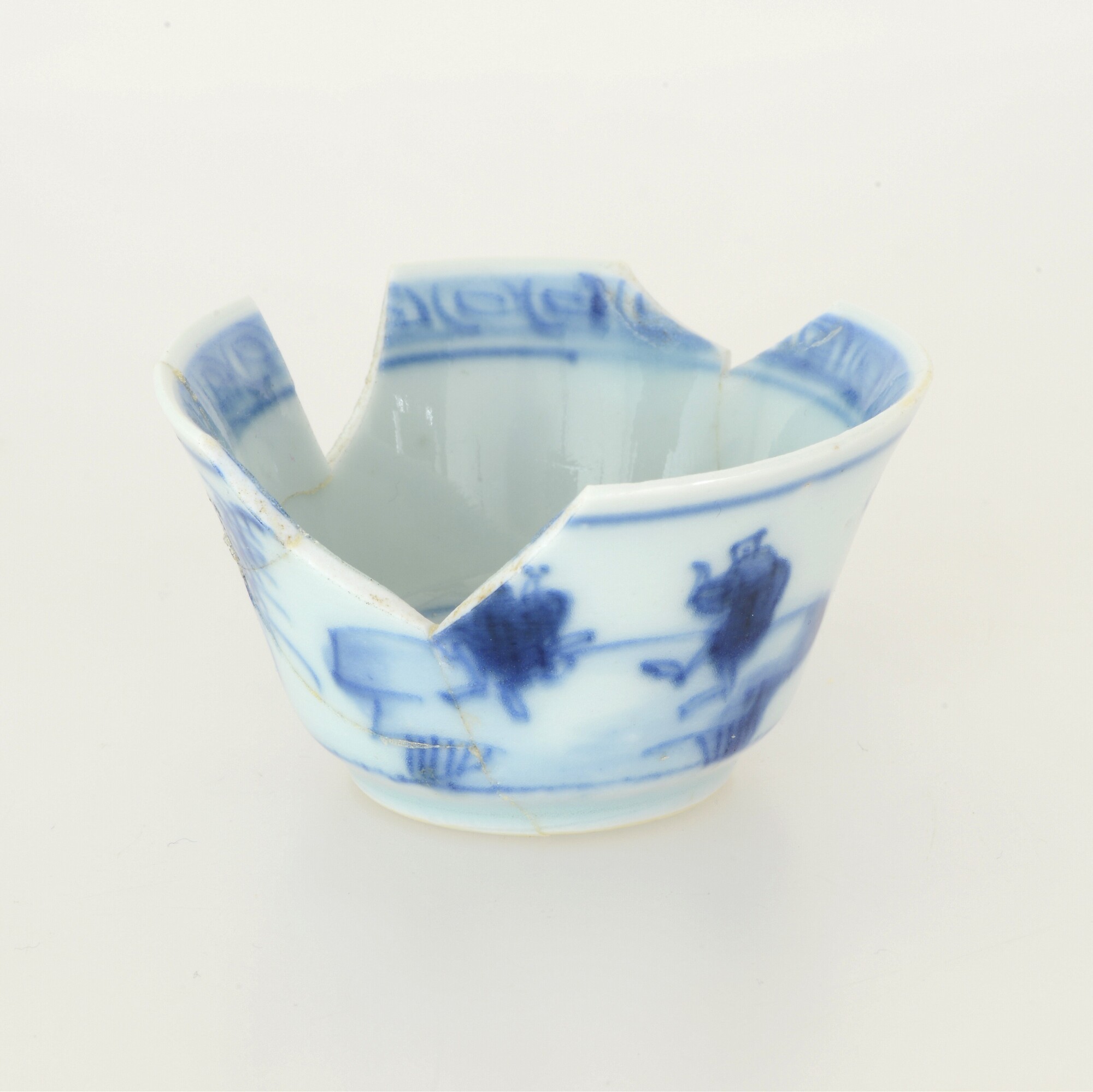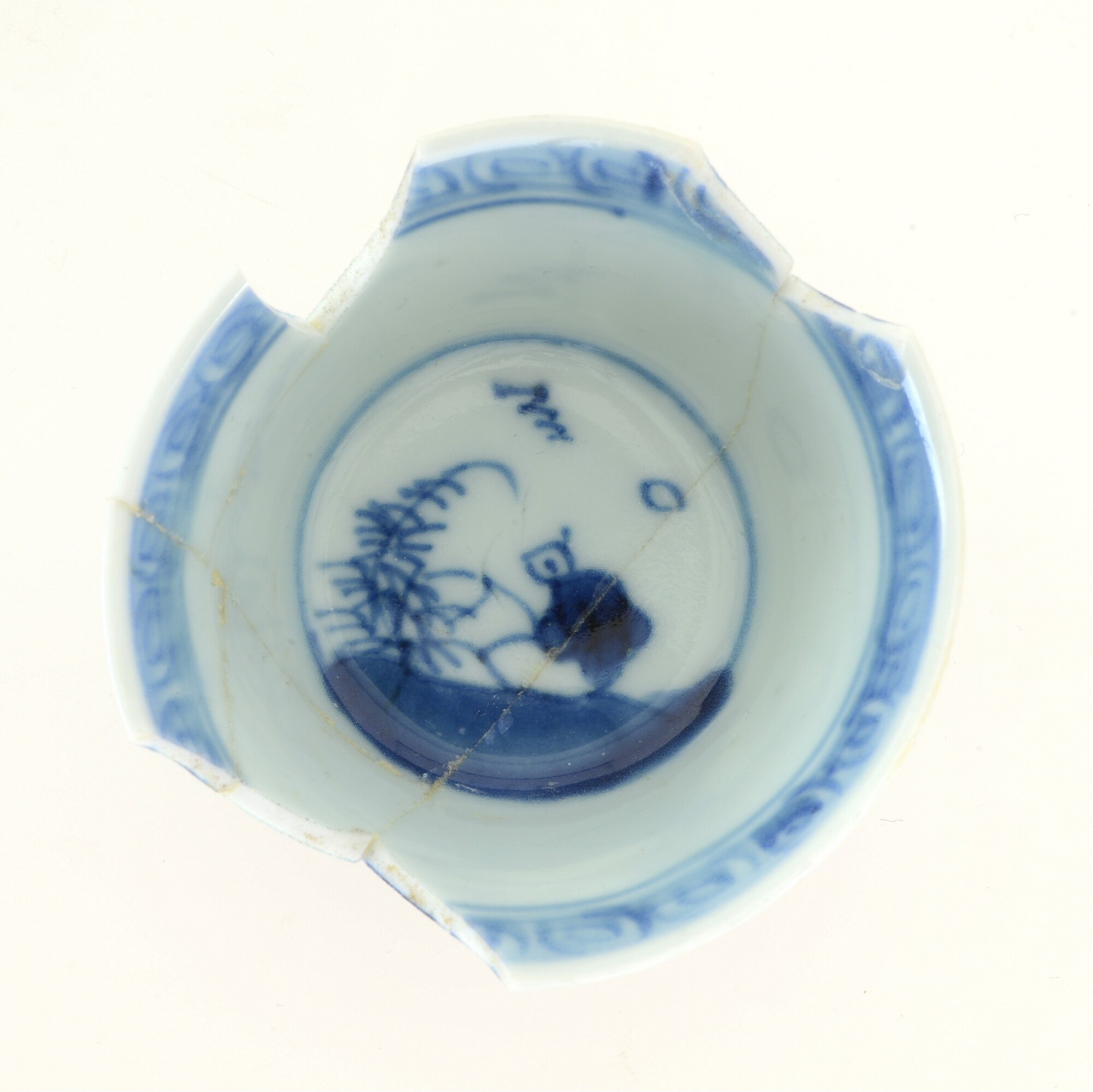 Kop; p-kop-4; afgeronde kop met rechte rand; porselein; veldspaatglazuur, onderglazuur blauw; inw.: landschap?, uitw.: twee zotjes (?) in landschap; standring; herkomst: China