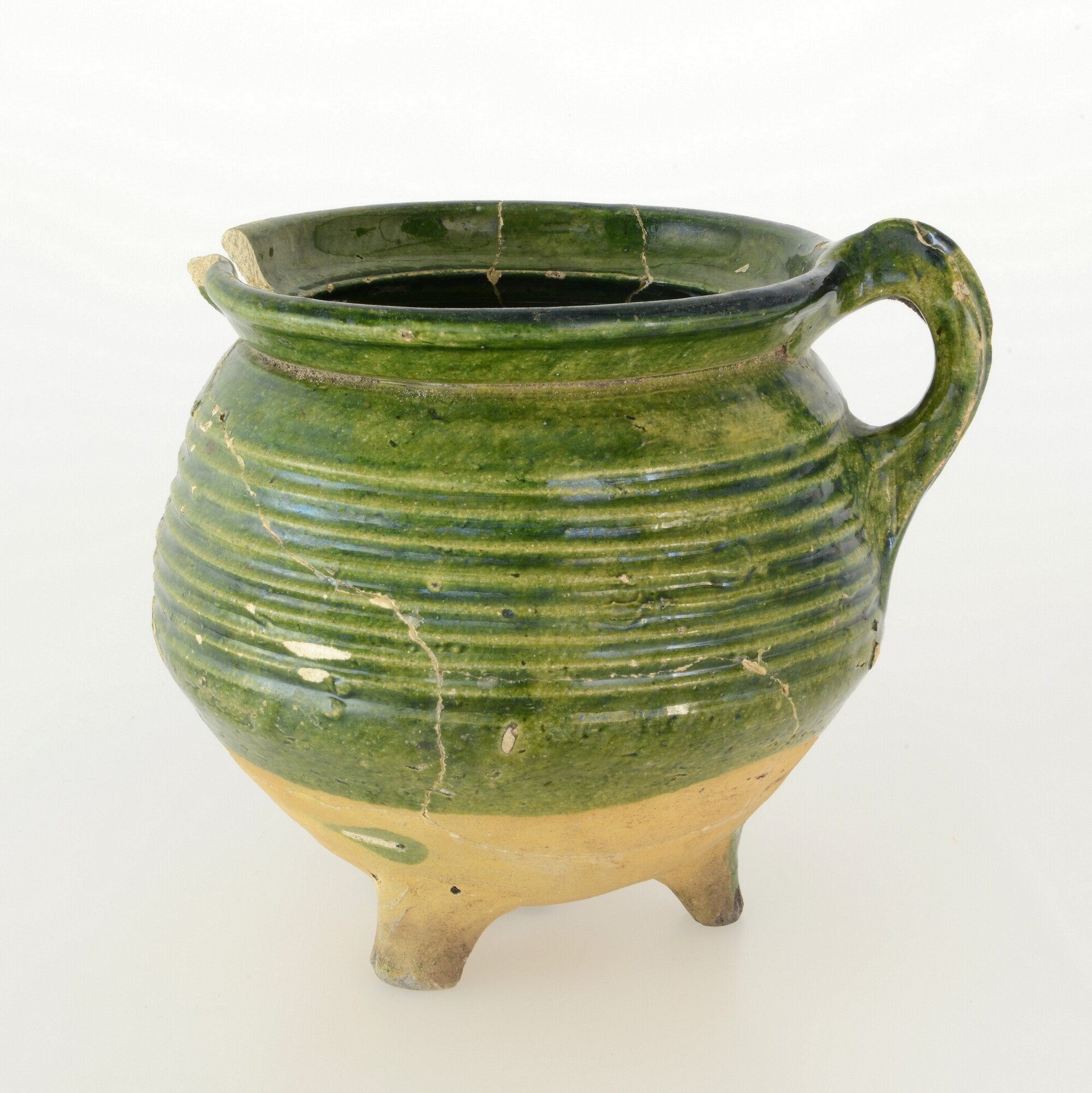Grape; w-gra-6; grape met scherpe buikknik en kraagrand; witbakkend aardewerk; in- en uitwendig loodglazuur met koperoxide; drie poten; verticaal lintoor; schenklip