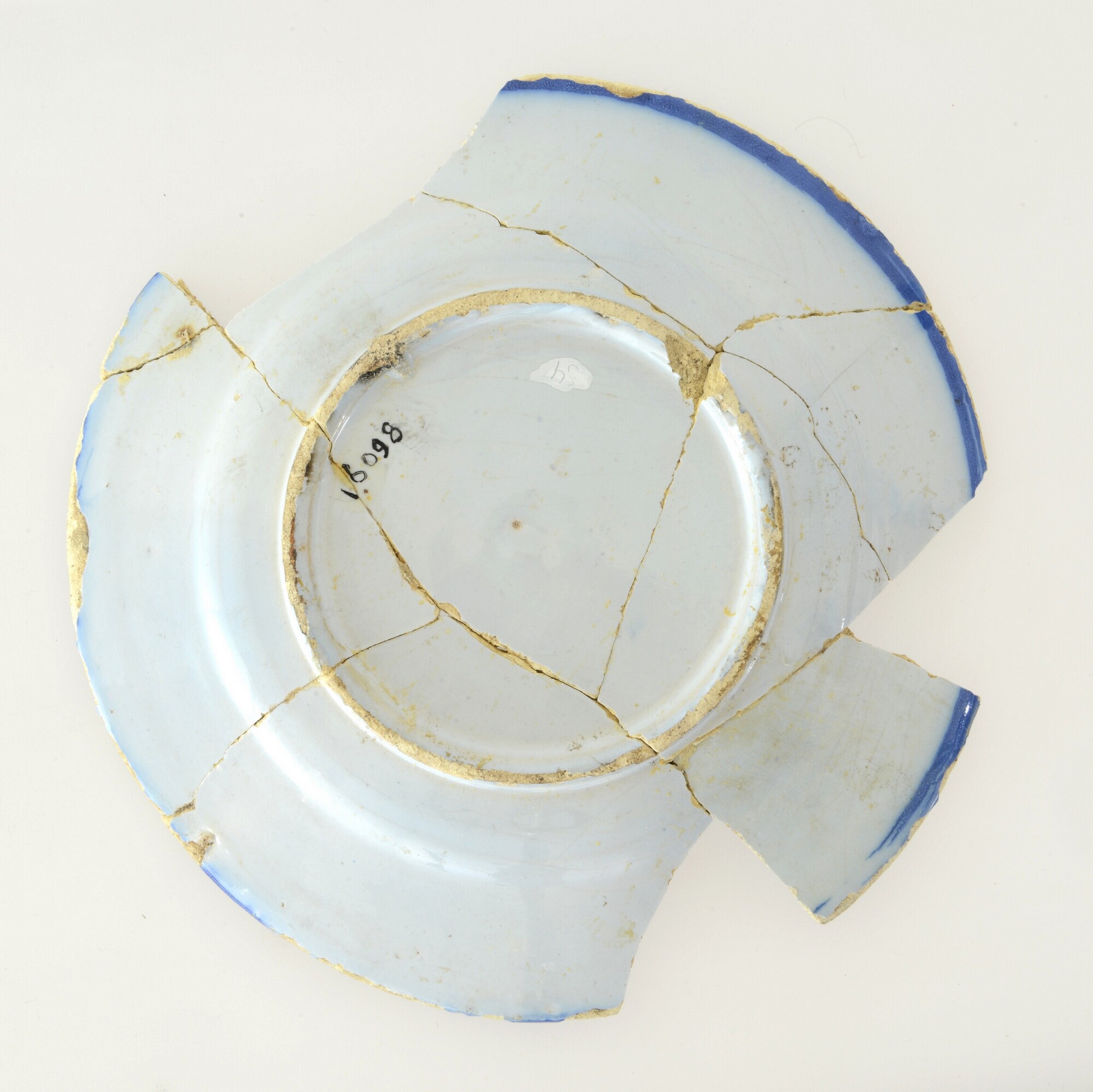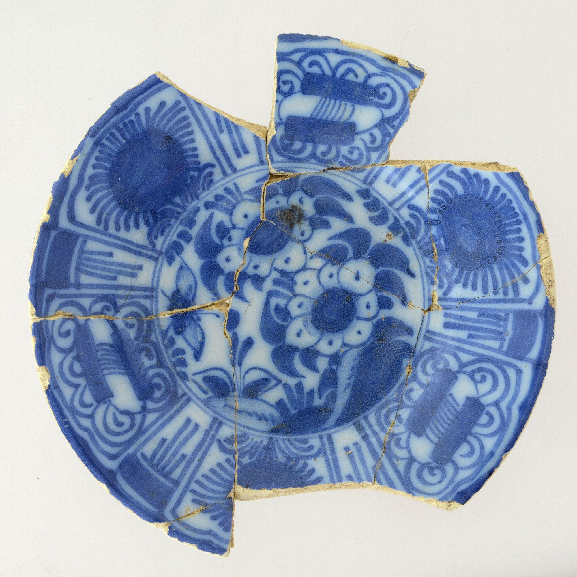 Bord; f-bor-1; bord met knik spiegel-vlag; Nederlandse faience; in- en uitwendig tinglazuur; blauwe beschildering, sp: bloemen, vl: Wanli-decoratie; standring (secundaire doorboring); herkomst: Delft?