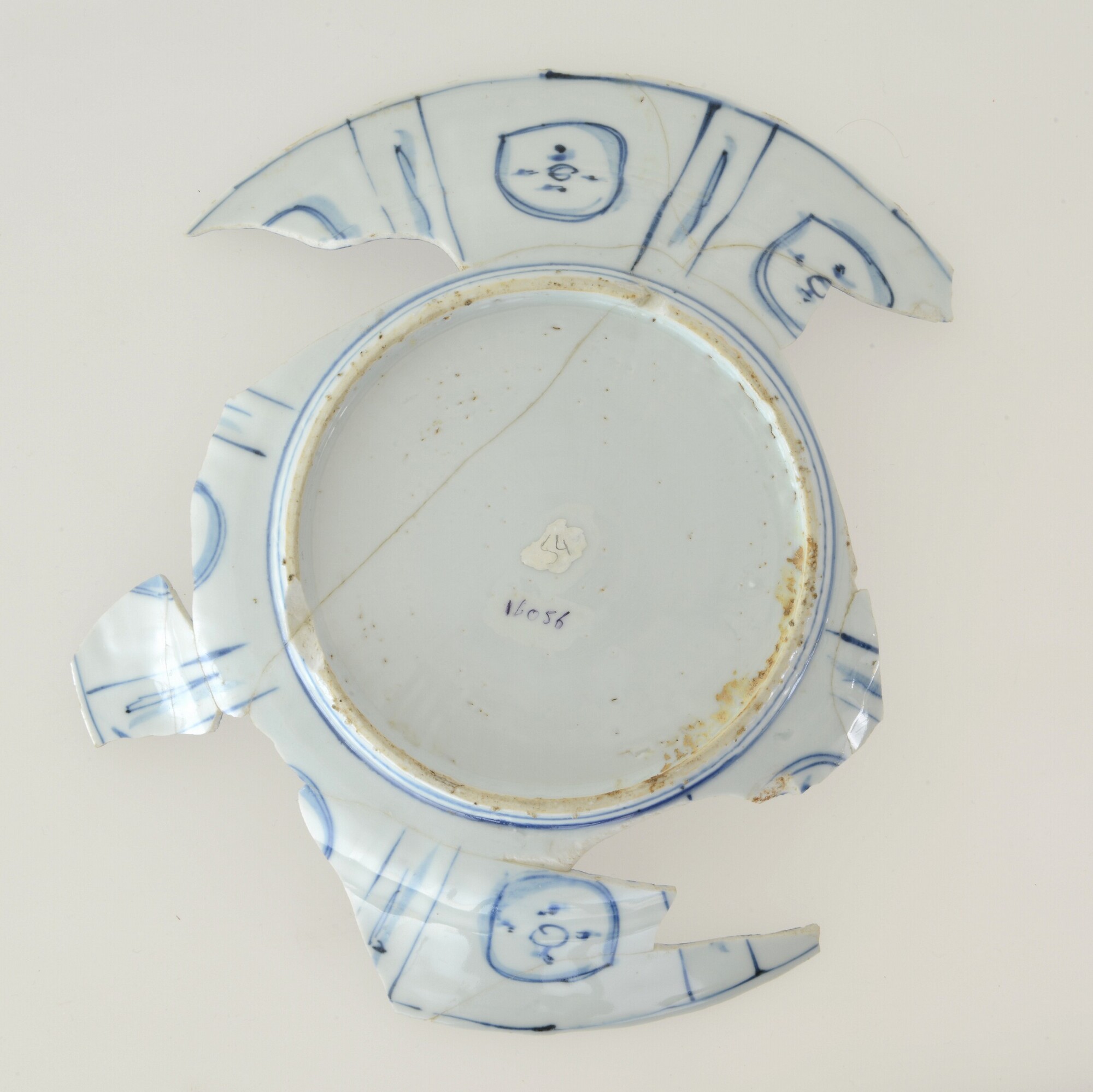 Bord; p-bor-8; in mal gevormd bord met vlakke spiegel en naar buiten geknikte platte vlag, rechte rand; veldspaatglazuur, onderglazuur blauw; rots en bloementuin met sprinkhaan en vlinder; sp: vl.: panelen met florale schilderingen, onderzijde.: 'IOIO' motief in blauw; standring; herkomst: China