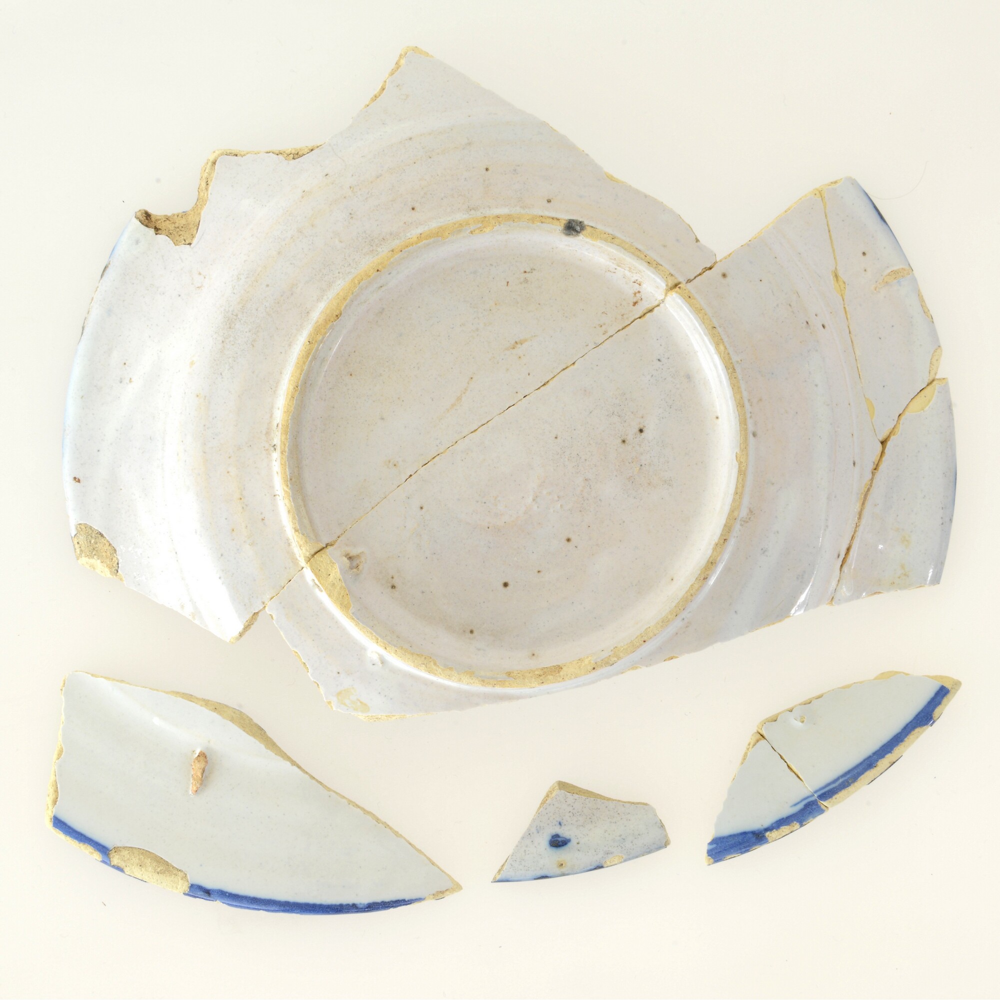 Bord; f-bor-1; bord met knik spiegel-vlag; Nederlandse faience; in- en uitwendig tinglazuur; blauwe beschildering; sp: bloemen binnen dubbele cirkel, sp: wanli-decoratie; standring (secundaire doorboring); herkomst: Delft?