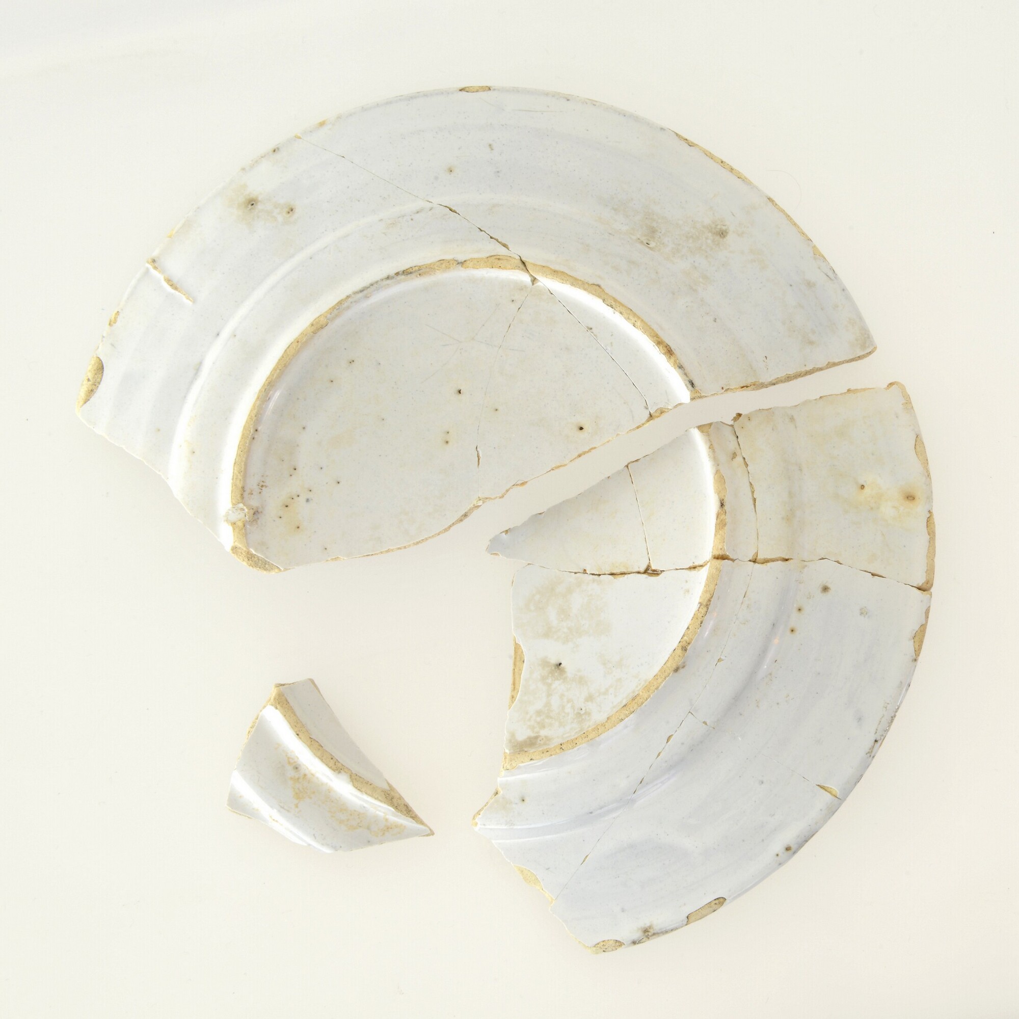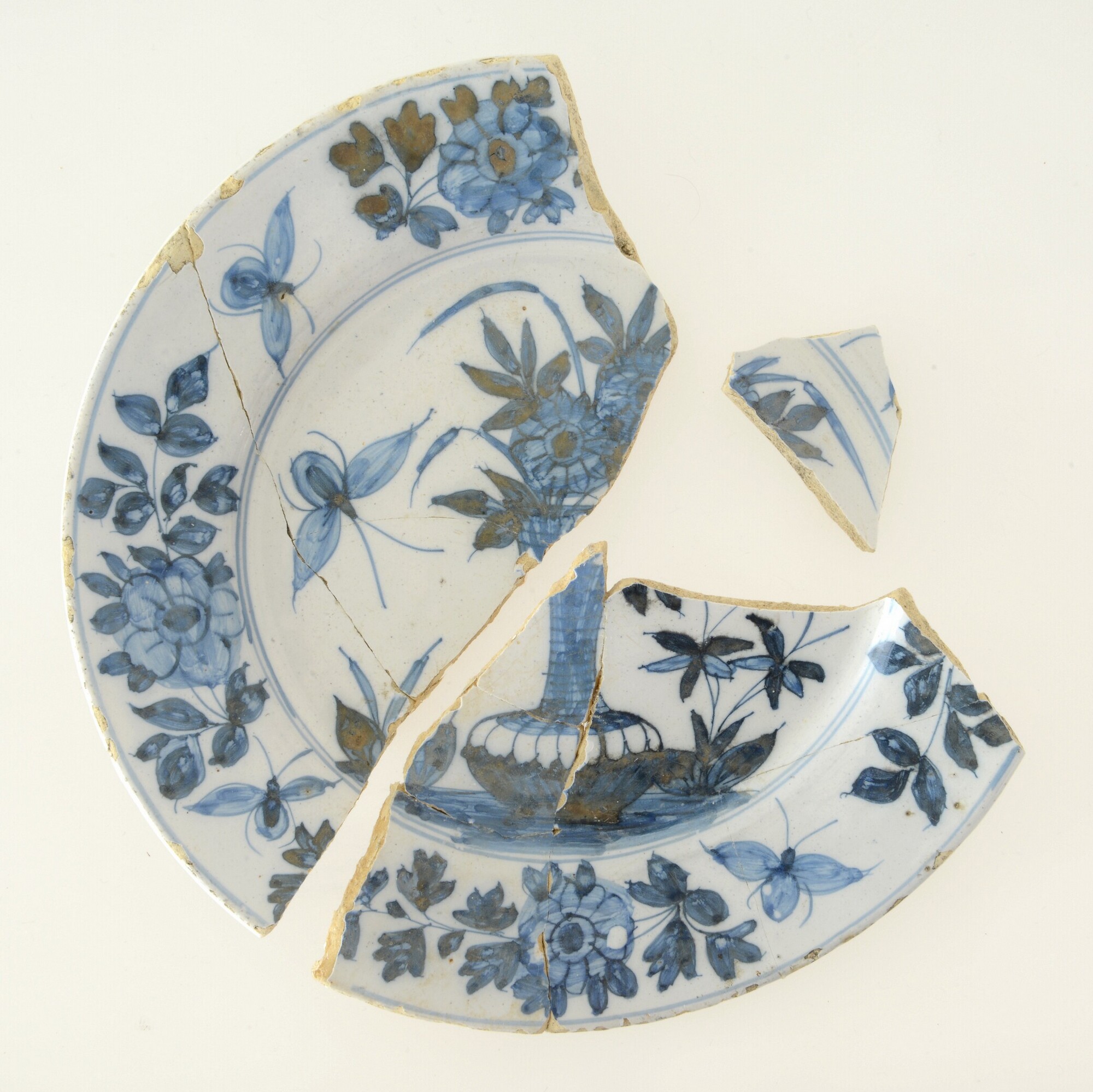 Bord; f-bor-nieuw; diep bord met holle spiegel, knik spiegel-vlag, brede vlag; Nederlandse faience; in- en uitwendig tinglazuur; blauwe beschildering, sp: bloemenvaas, insect en planten, vl: bloemen en insecten; standring; herkomst: West-Nederland