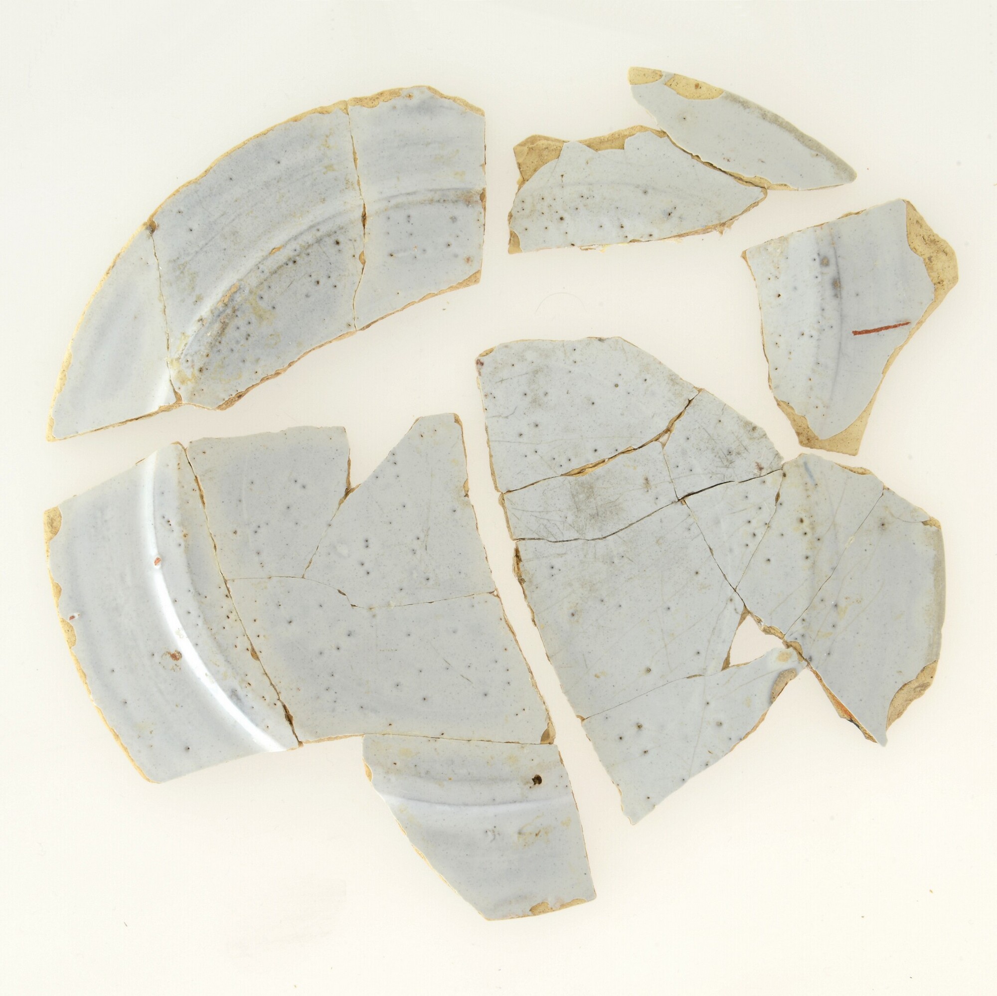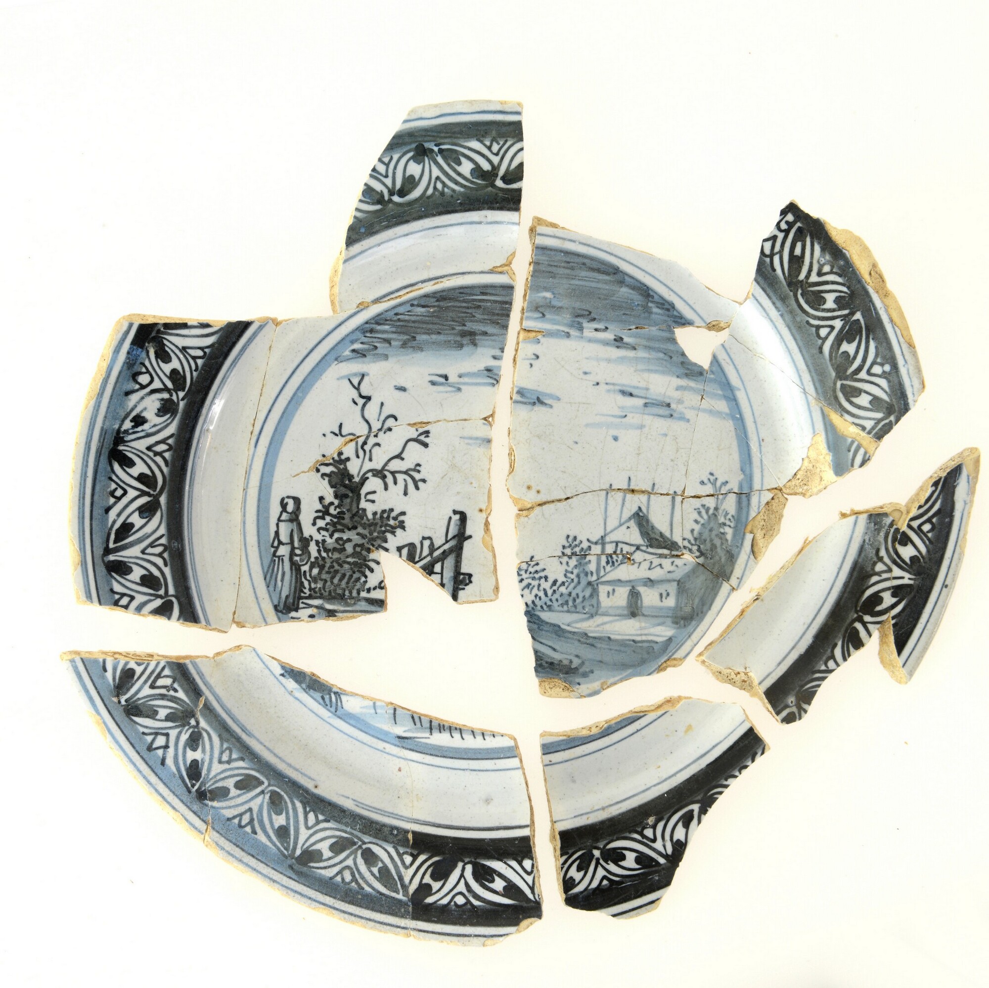 Bord; f-bor-2; plat bord met platte spiegel, platte vlag inwendig met knik afgezet; Nederlandse faience; in- en uitwendig tinglazuur; licht- en donkerblauwe beschildering, sp: landschap met boerderij, boerin (?) en struikgewas, vl: gestileerde bladranken; standvlak; herkomst: Haarlem
