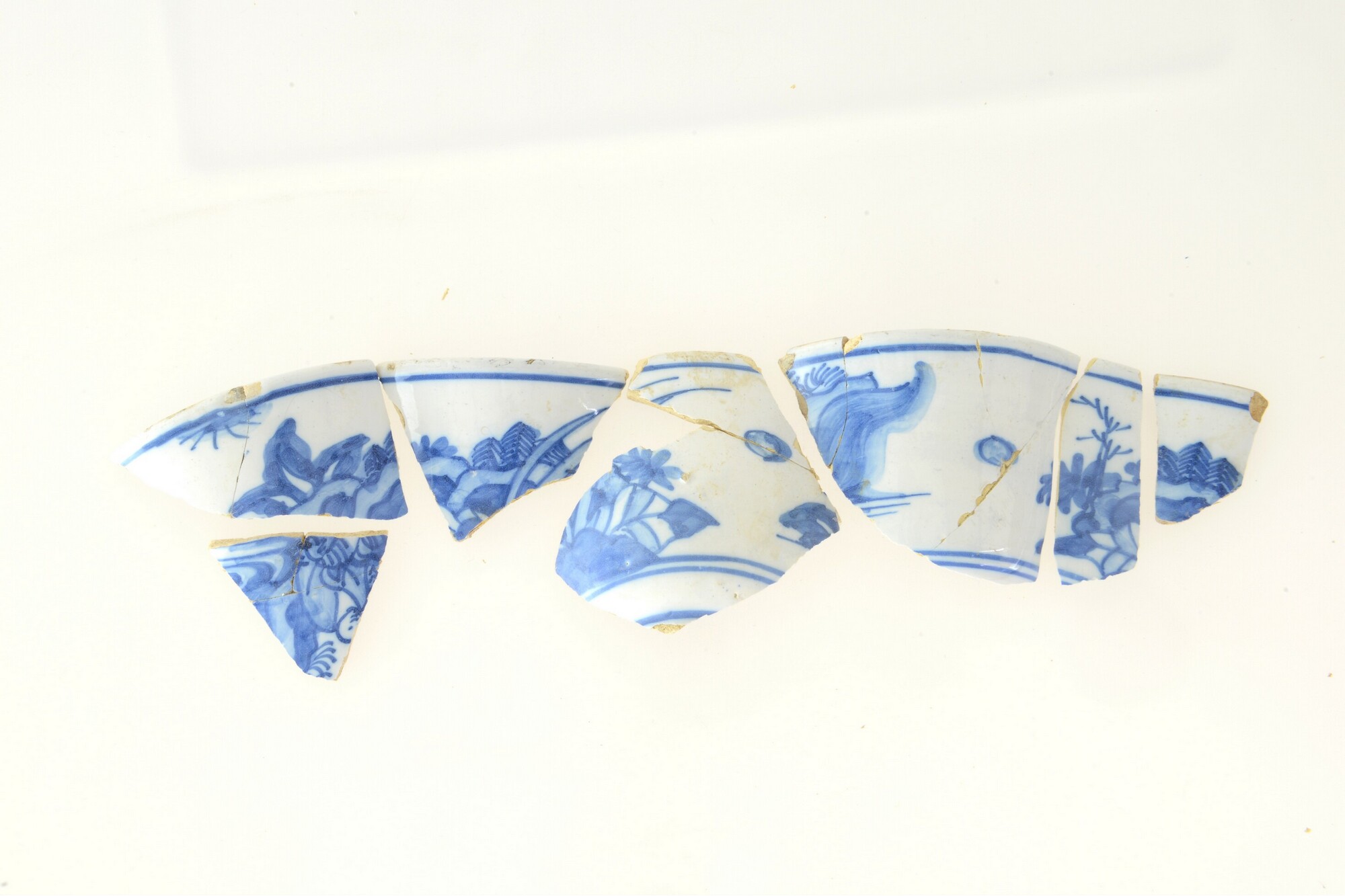 Kom; f-kom-1; afgeronde kom met licht uitgebogen rand; Nederlandse faience; in- en uitwendig tinglazuur; blauwe beschildering, inw.: drie concentrische cirkels, uitw.: landschap met Chinees zotje; standring (ontbreekt)