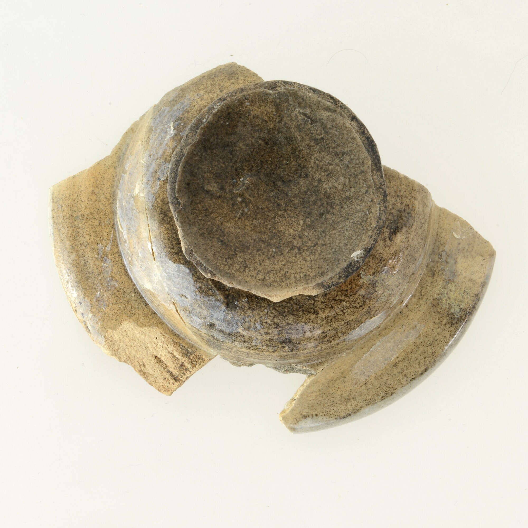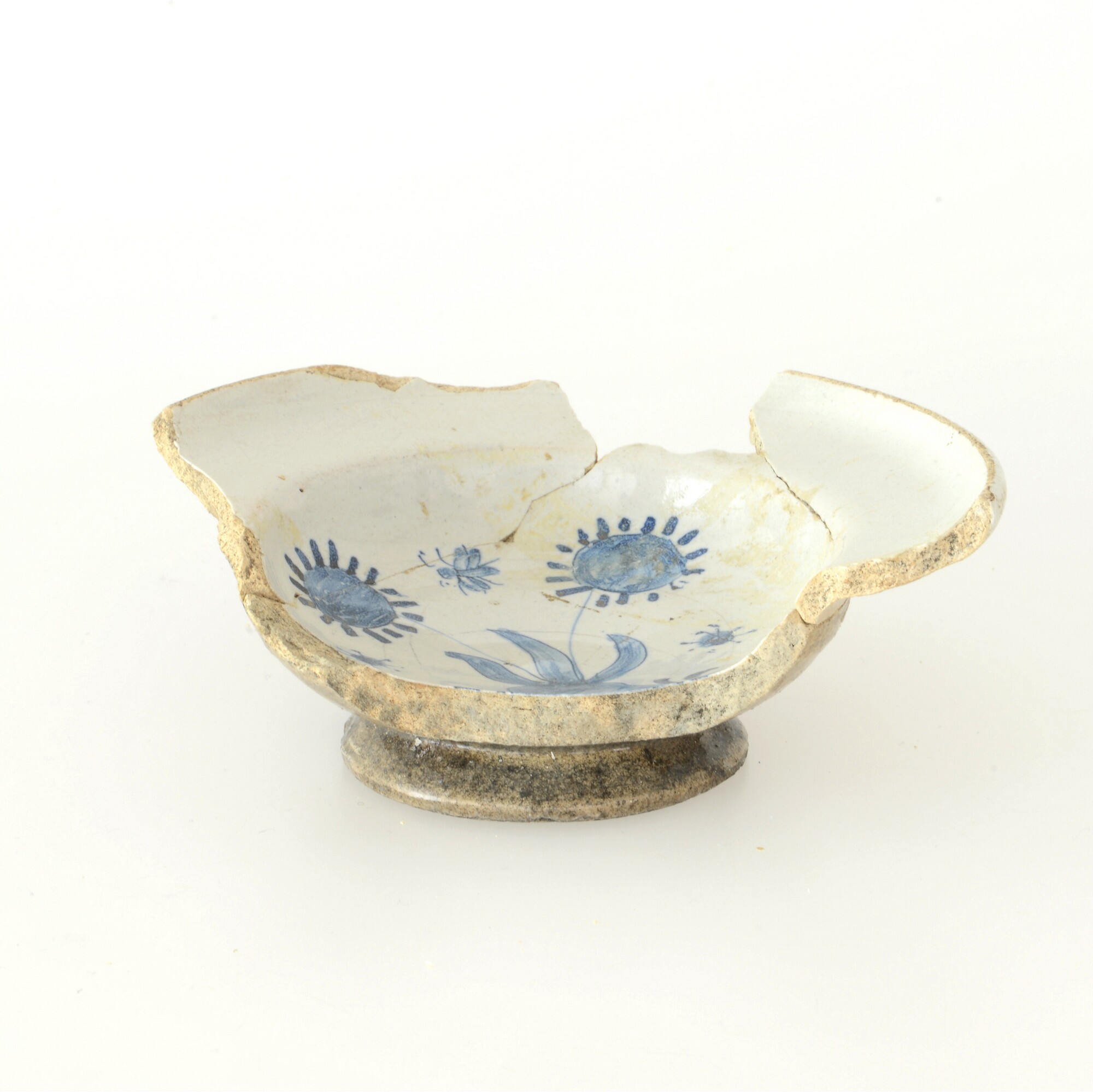 Kom; m-bor-17; Nederlandse majolica; inwendig tinglazuur, uitwendig loodglazuur; blauwe beschildering, sp: bloemen en insect; standvoet