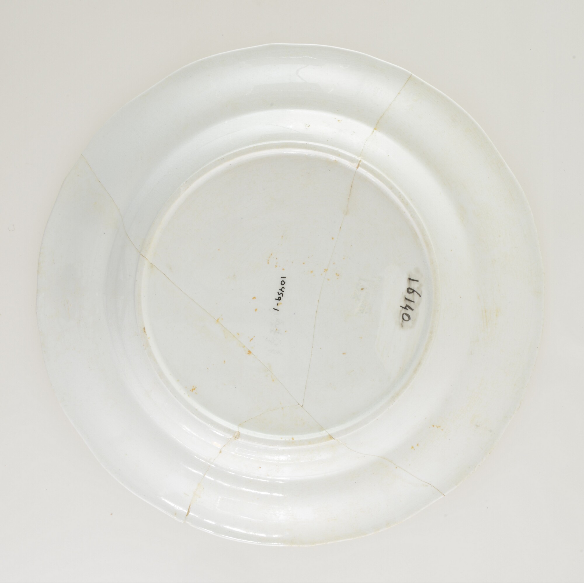 Bord; iw-bor-6; bord met naar buiten geknikte platte vlag; witgoed; loodglazuur; golfrand; standring; blindmerk; herkomst: Maastricht