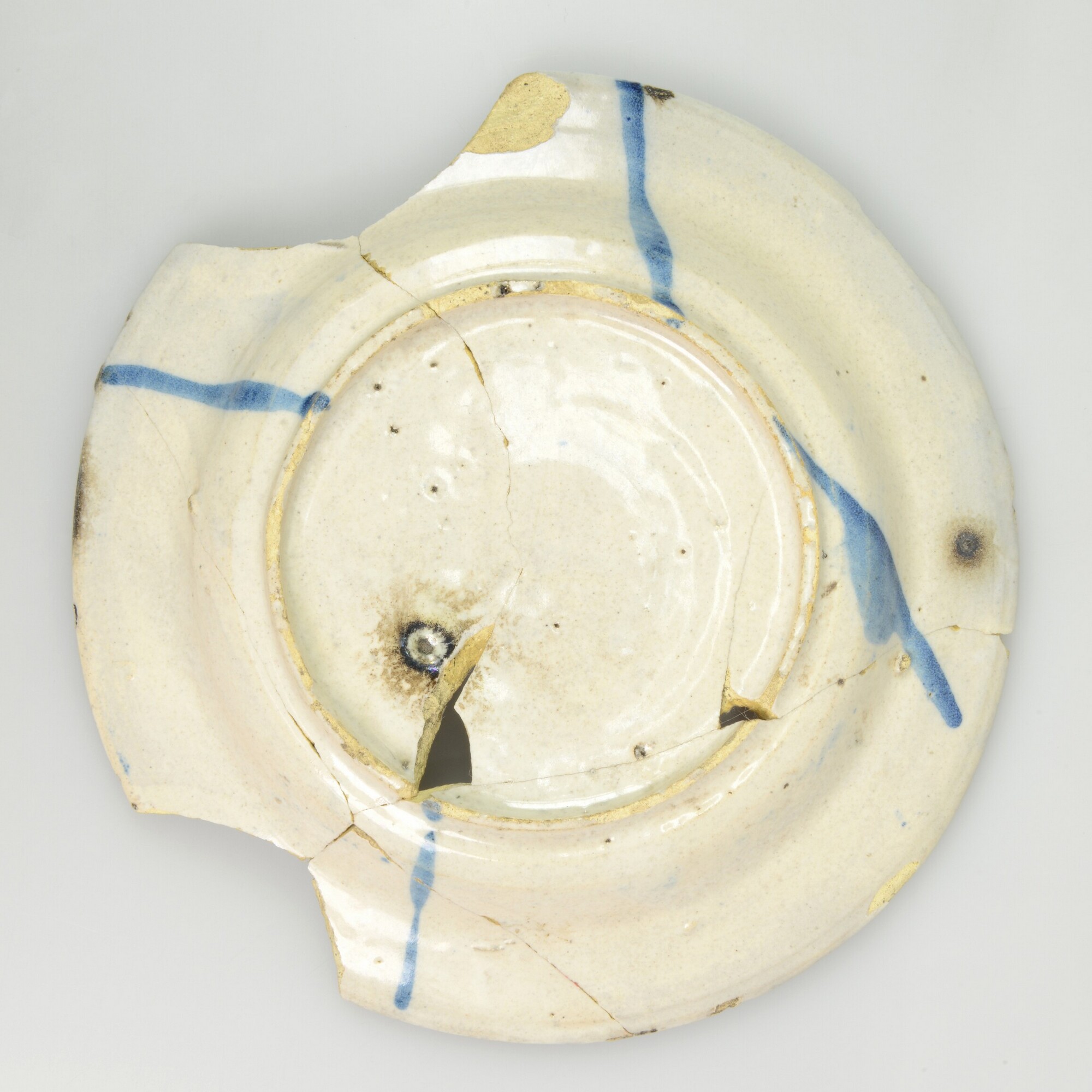 Bord; po-bor-3; bord met naar buiten geknikte vlag; Portugees tinglazuuraardewerk; boven- en onderzijde tinglazuur; blauwe beschildering; voorzijde: granaatappel en repeterend bibberpatroon, achterzijde: vier strepen; standring; herkomst: Portugal