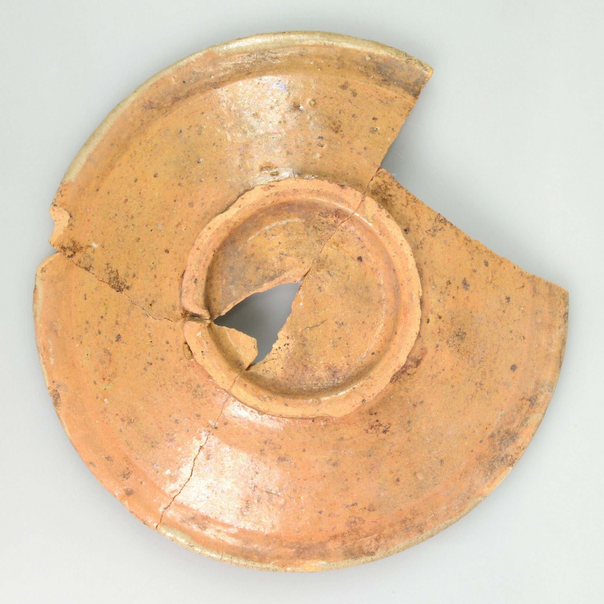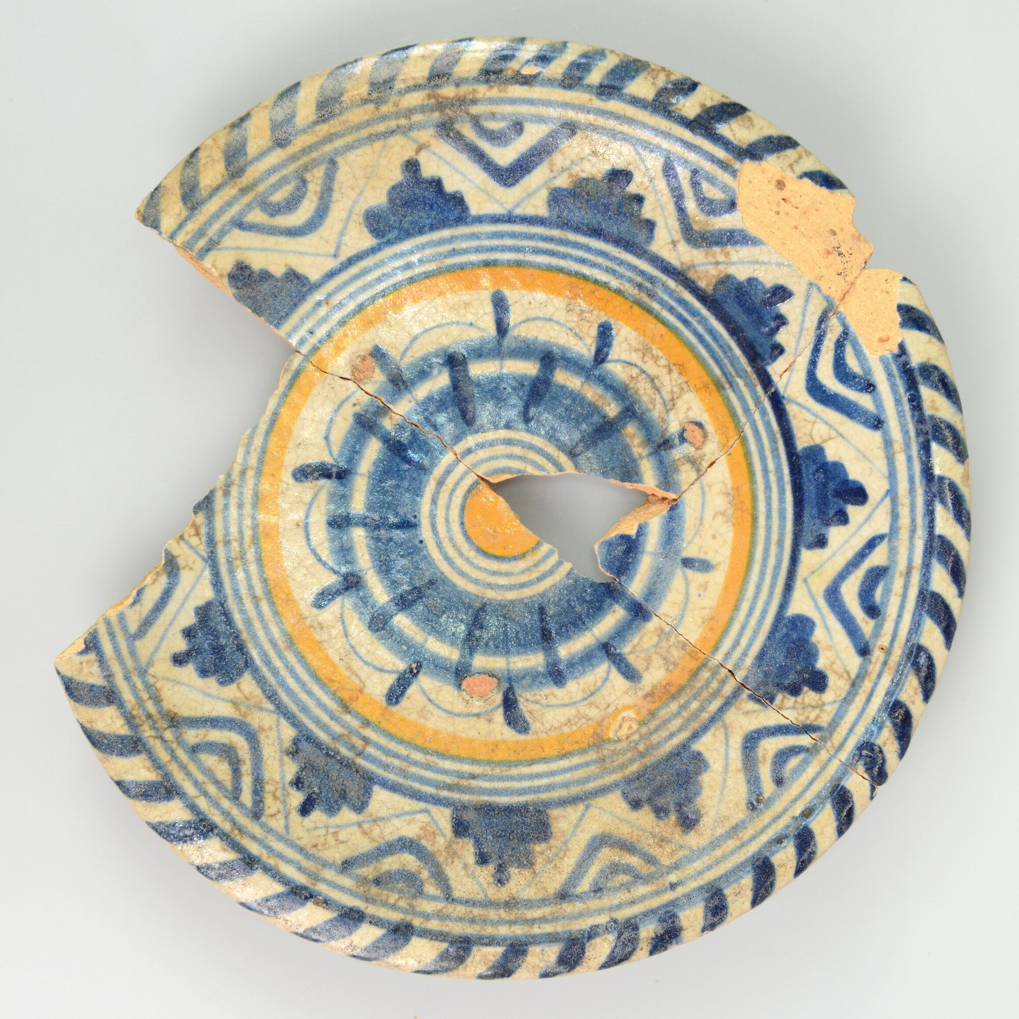 Bord; m-bor-5; bord met vloeiende overgang spiegel naar vlag en iets uitgebogen rand; Nederlandse majolica; bovenzijde tinglazuur, onderzijde loodglazuur; beschildering in blauw en geel; spiegel: rozet, vlag: repeterend motief, kabelrand; standring (secundair doorboord)