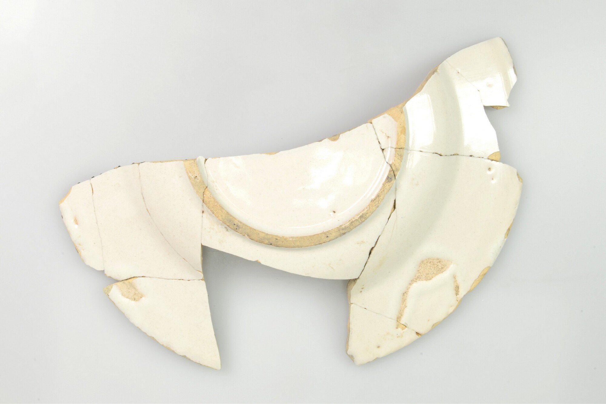 Bord; i-bor-1; bord met platte vlag; Italiaanse faience; boven- en onderzijde tinglazuur; beschildering in blauw, geel en oker; spiegel: putto, vlag: aigretterand; herkomst: Italië, Ligurië