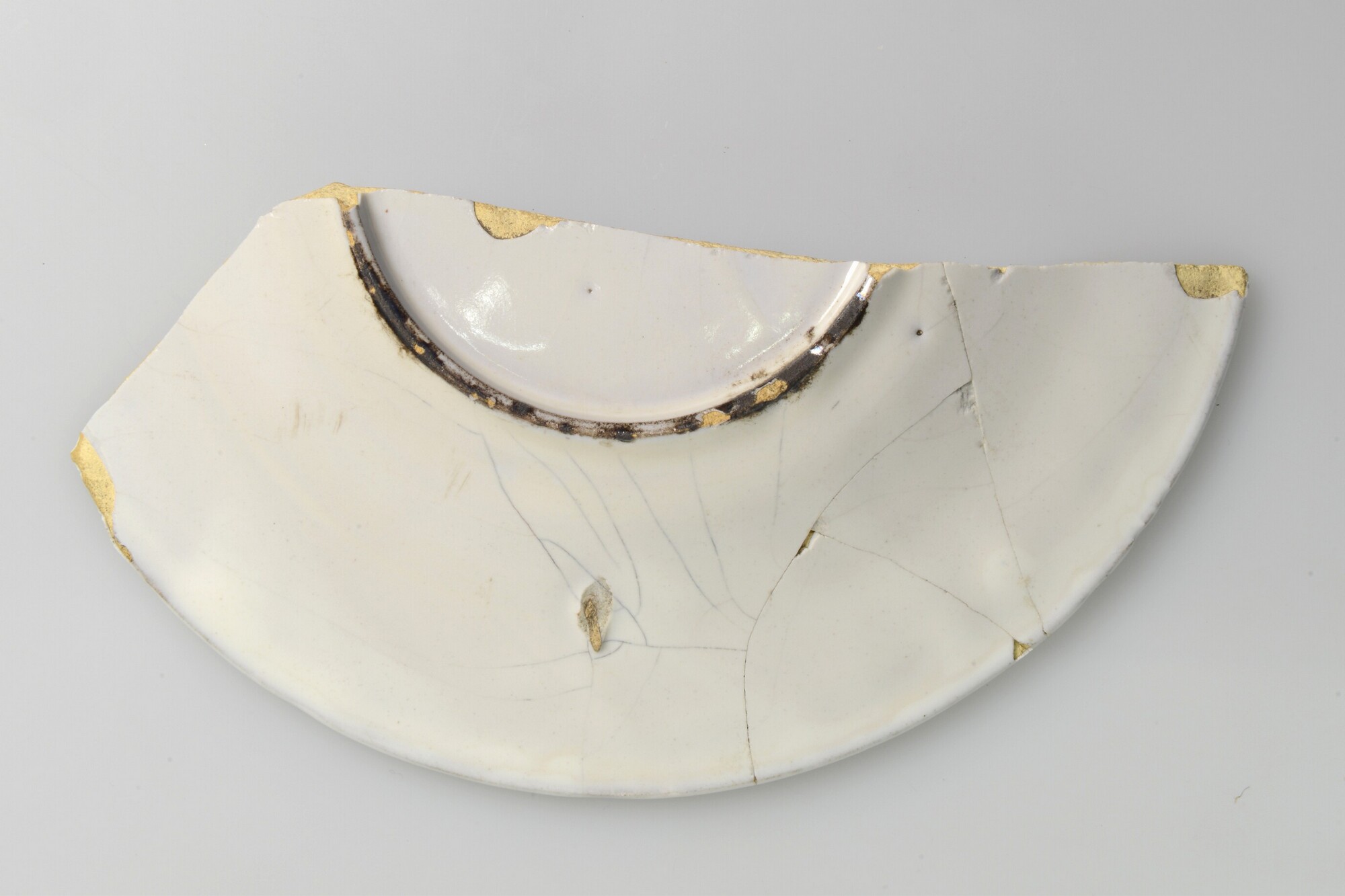 Bord; i-bor-1; bord met platte vlag; Italiaans tinglazuuraardewerk; boven- en onderzijde tinglazuur; beschildering in blauw, geel, groen en oker; spiegel: vogel, vlag: aigretterand; standring; herkomst: Italië, Ligurië
