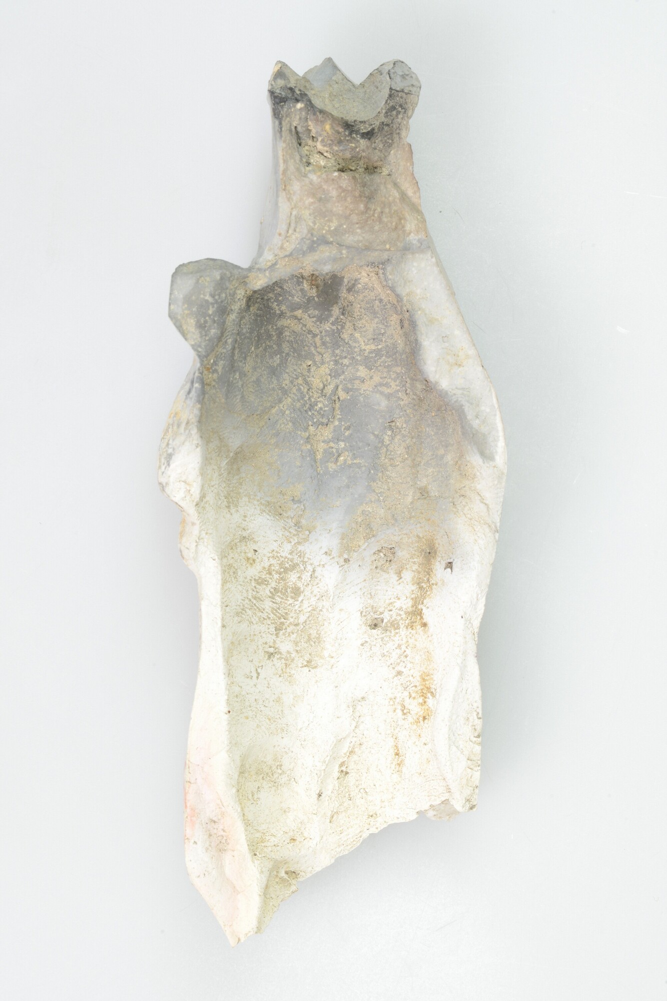Beeld; py-bee; fragment van beeld van pijpaarde van Maria met Kind met resten rode polychromie