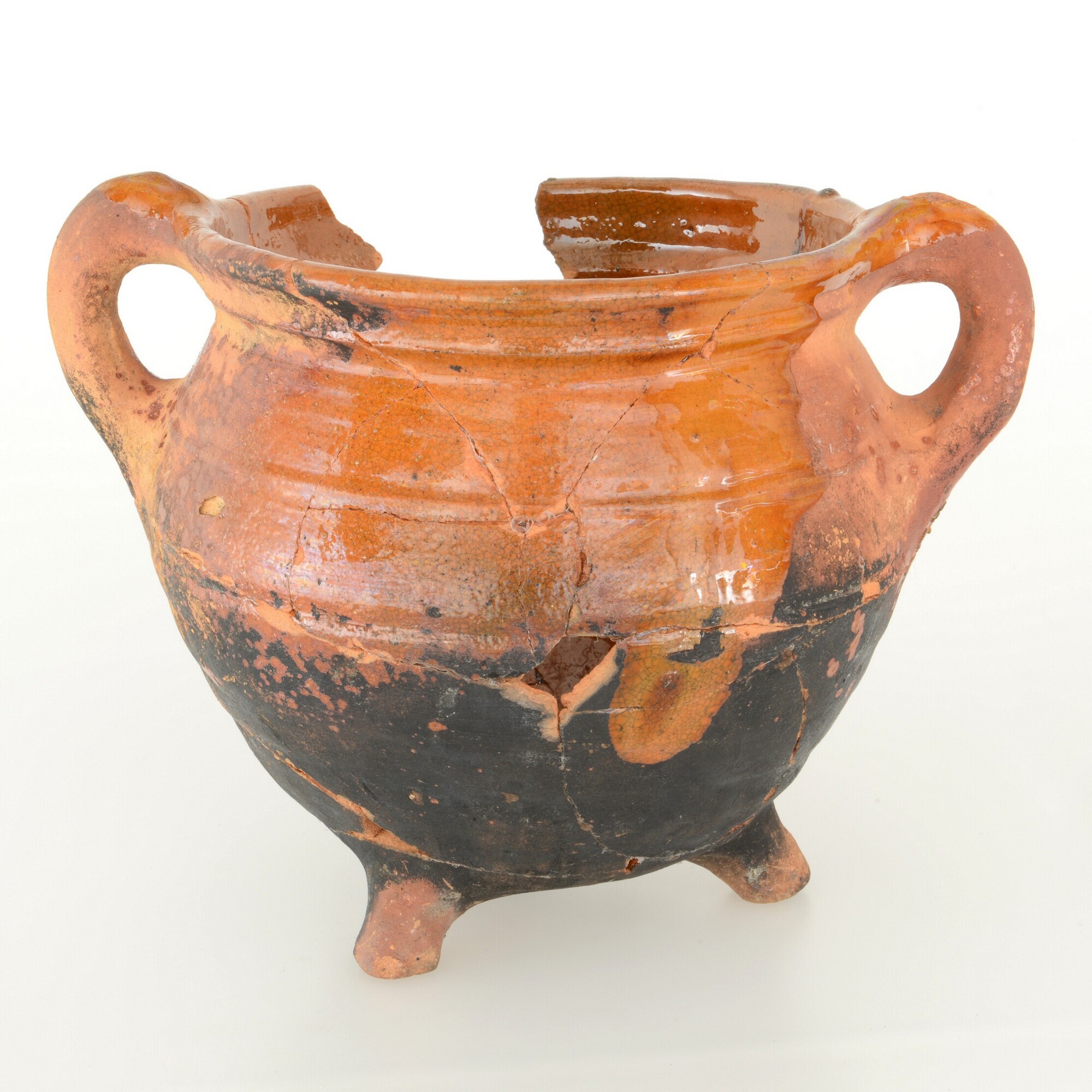 Grape; r-gra-34; grape met scherpe buikknik, ribbel op schouder en kraagrand; roodbakkend aardewerk; inwendig loodglazuur, uitwendig loodglazuur op schouder aan schenkkant; drie poten; twee worstoren; uitwendig beroet