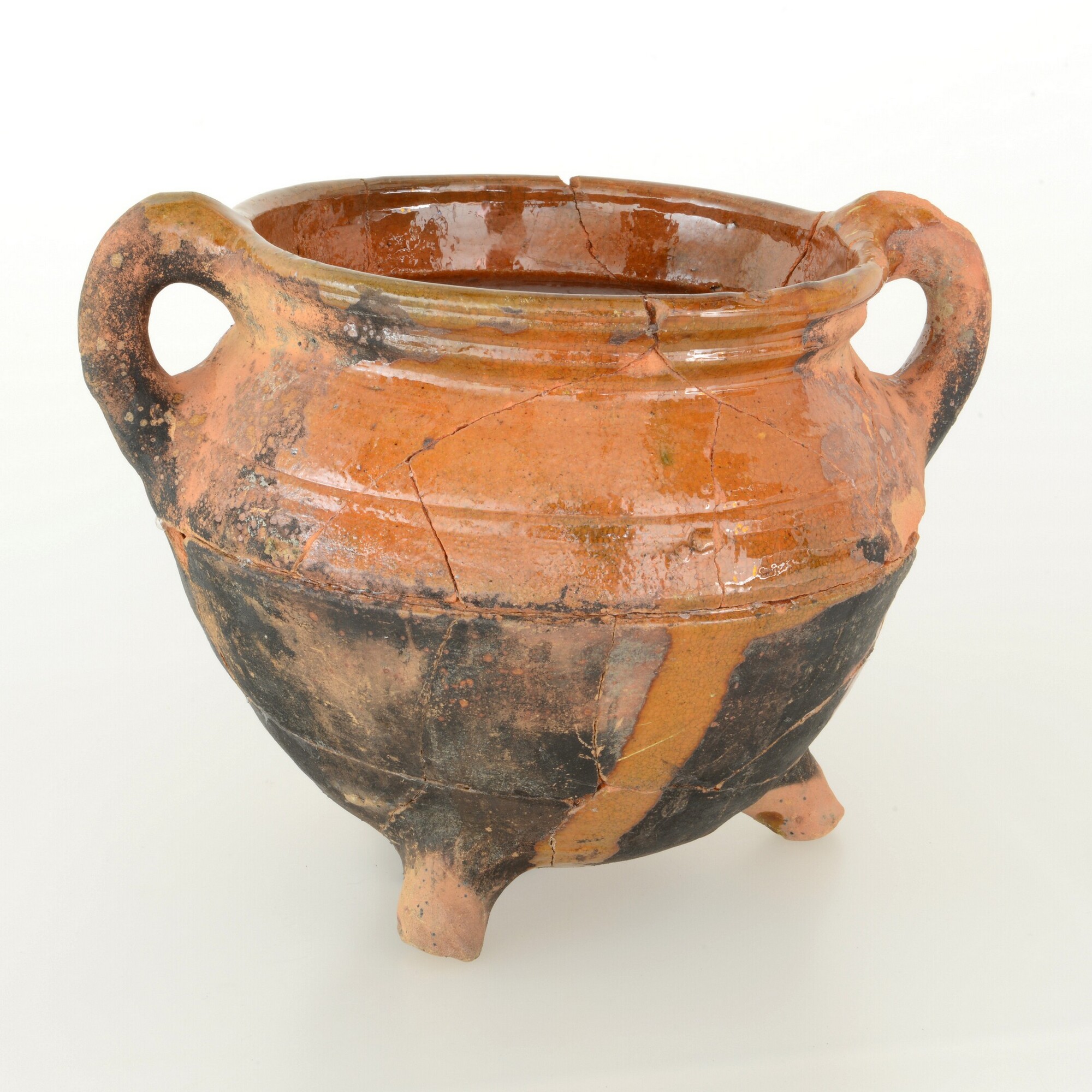 Grape; r-gra-34; grape met scherpe buikknik, ribbel op schouder en kraagrand; roodbakkend aardewerk; inwendig loodglazuur, uitwendig loodglazuur op schouder aan schenkkant; drie poten; twee worstoren; uitwendig beroet