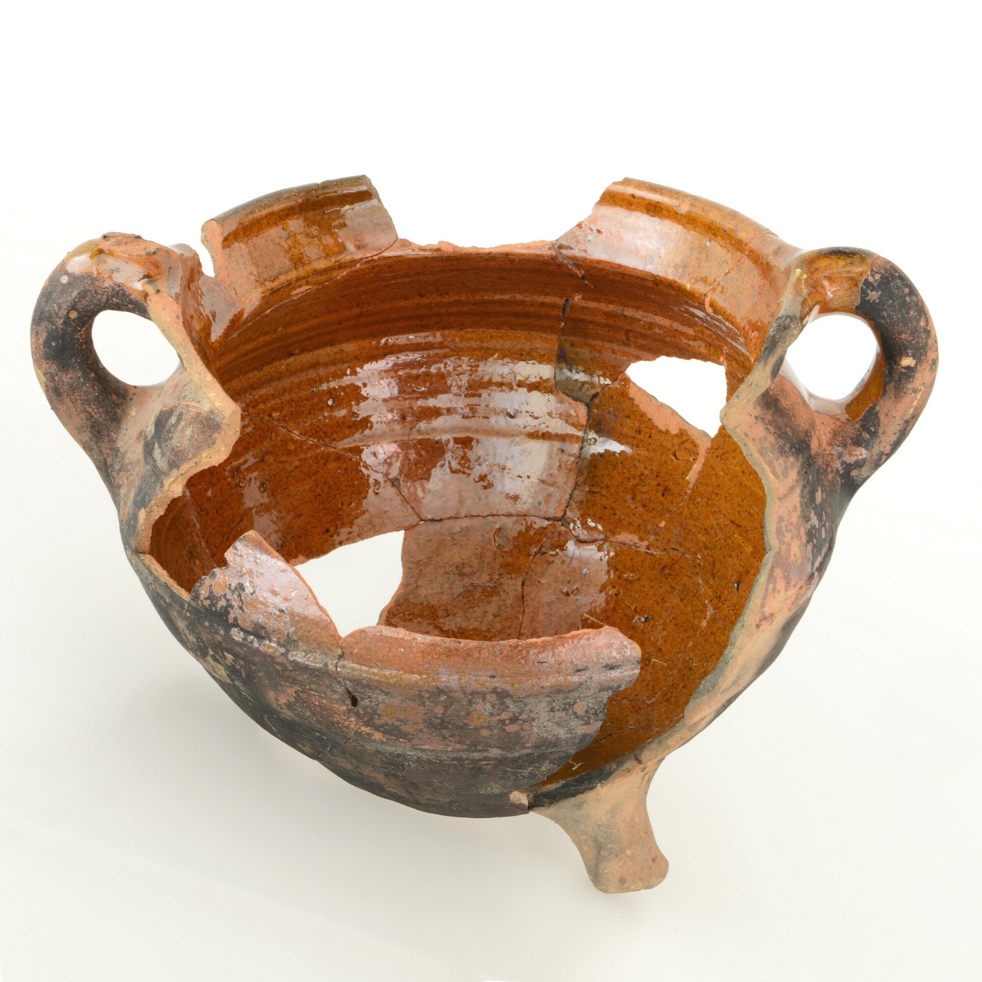 Grape; r-gra-34; grape met scherpe buikknik, ribbel op schouder en kraagrand; roodbakkend aardewerk; inwendig loodglazuur, uitwendig loodglazuur op schouder aan schenkkant; drie poten; twee worstoren; uitwendig beroet