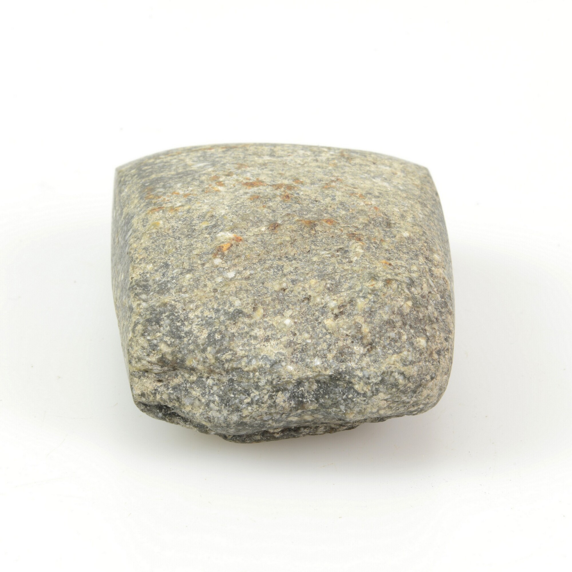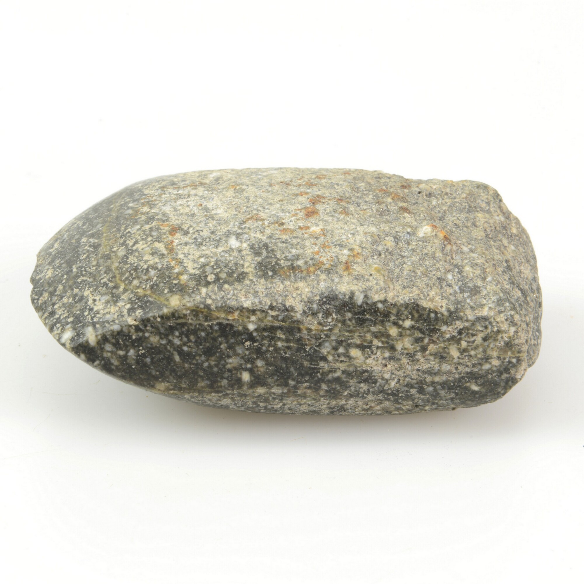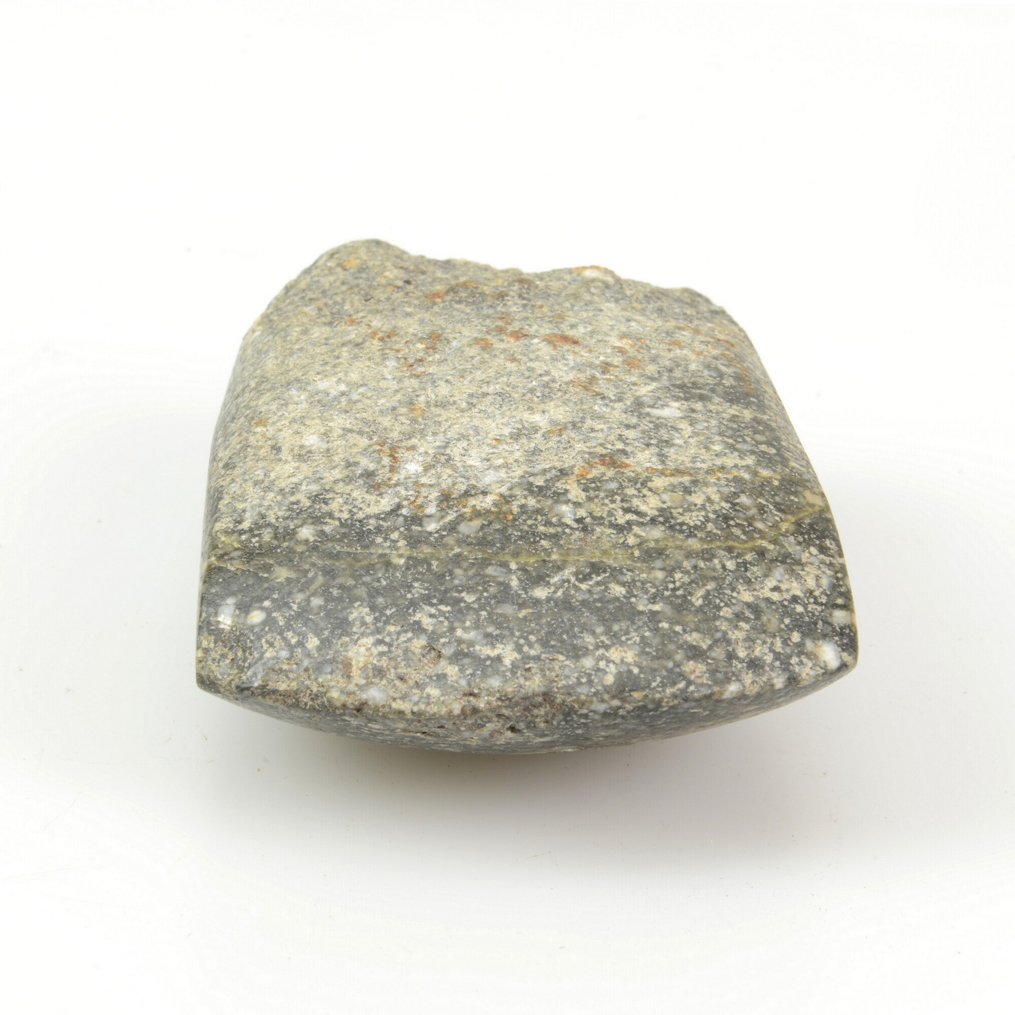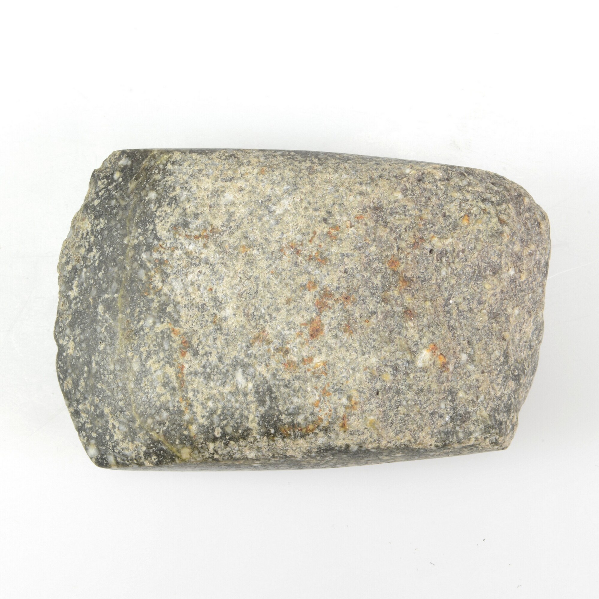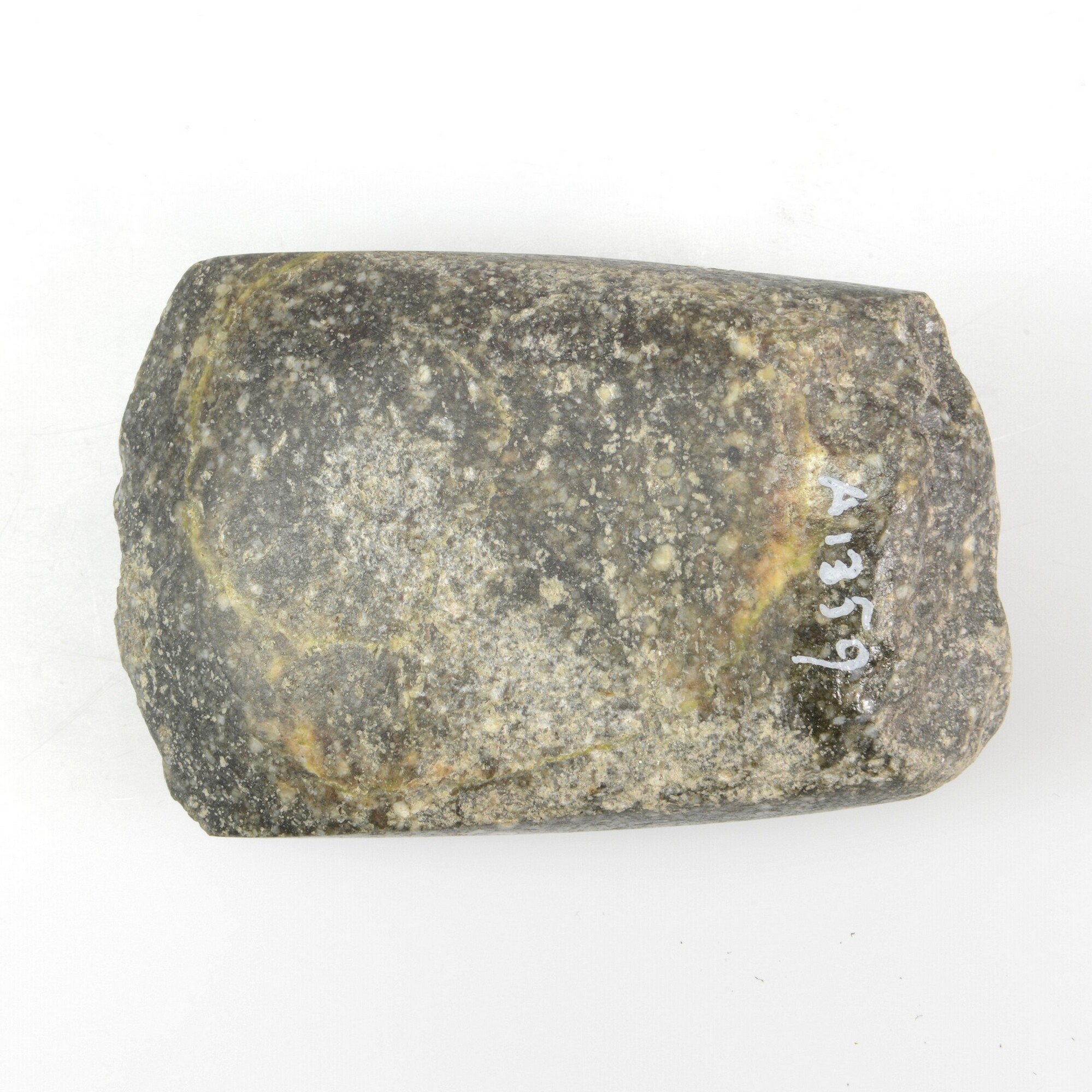 Bijl; Fels-Rechteckbeil; zowel klop- als slijpsporen; zijkanten intensiever geslepen dan brede vlakken; deel van butssporen dateert van na het slijpen, mogelijk bij reshaping nadat bijl is gebroken; snede is stomp en gebutst (sporen van gebruik); noordelijke zwerfsteen: Småland; vondstomstandigheden: A1359, vindplaats 11; akkervondst op gerooid tulpenland, mogelijk uit de verharding van een verdwenen/gerooid pad dat ...
