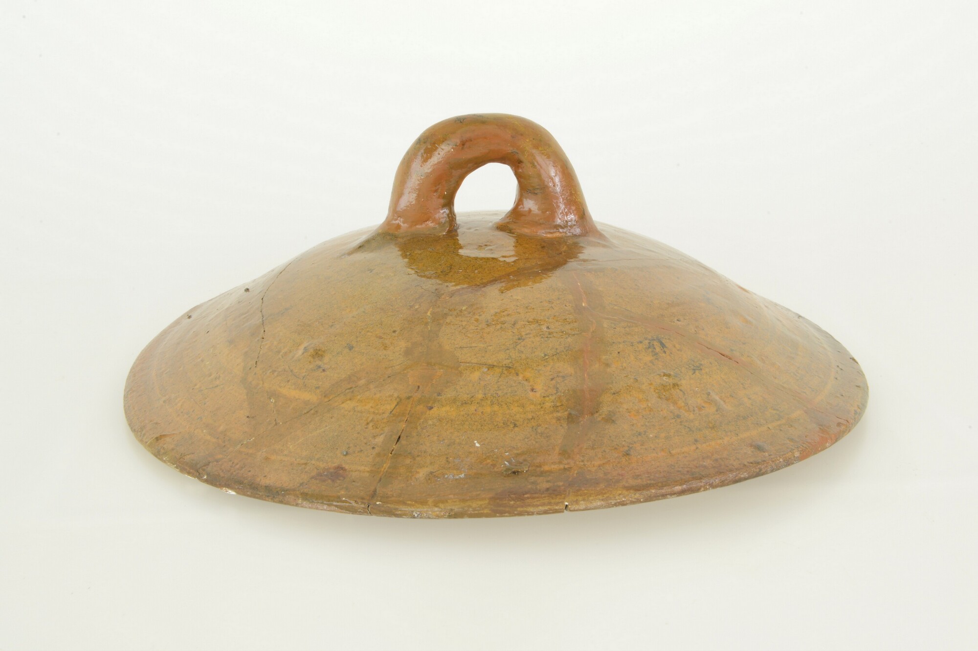 Deksel; r-dek-19; roodbakkend aardewerk; uitwendig loodglazuur; bol deksel met naar binnen geknikte rand, met (aangevuld) worstoor; de rand is beroet; herkomst: Nederland