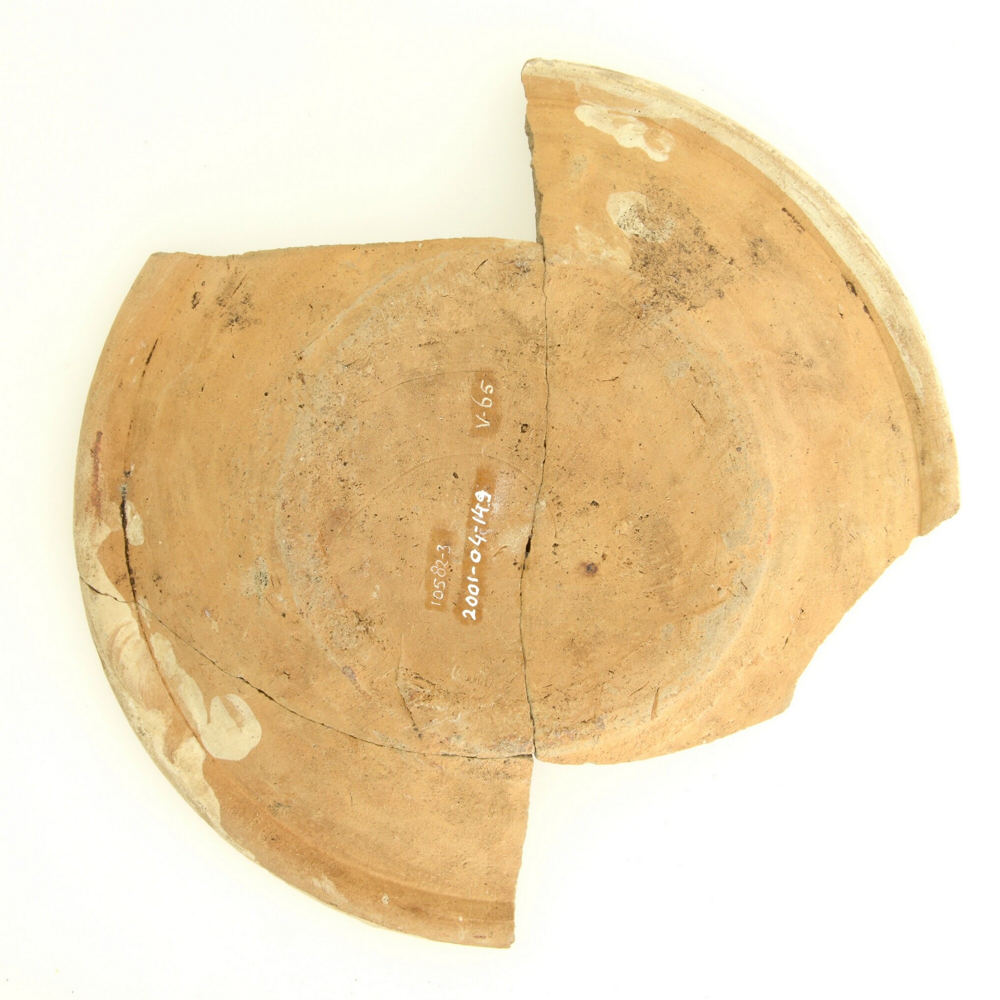 Bord; r-bor-10; roodbakkend aardewerk; loodglazuur bovenzijde; diep bord met platte bodem en verdikte rand met lip aan de binnenzijde; standvlak; slibdecoratie: gemarmerd; herkomst: Nederrijns gebied