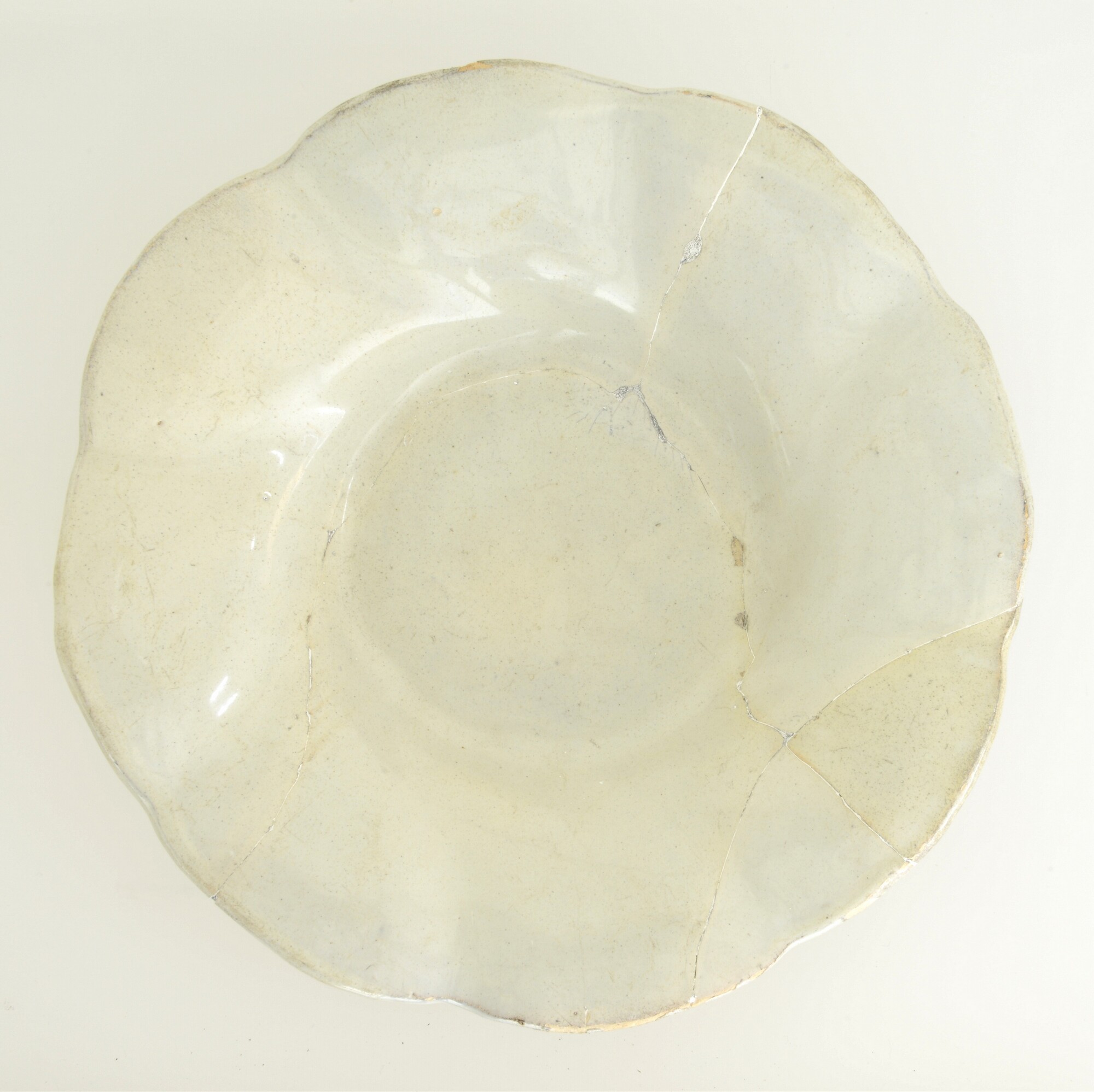 Plooischotel; f-plo-3; Nederlandse faience; tinglazuur; platte spiegel en grof geplooide vlag; scherpe knik spiegel-vlag; standring; herkomst: West-Nederland