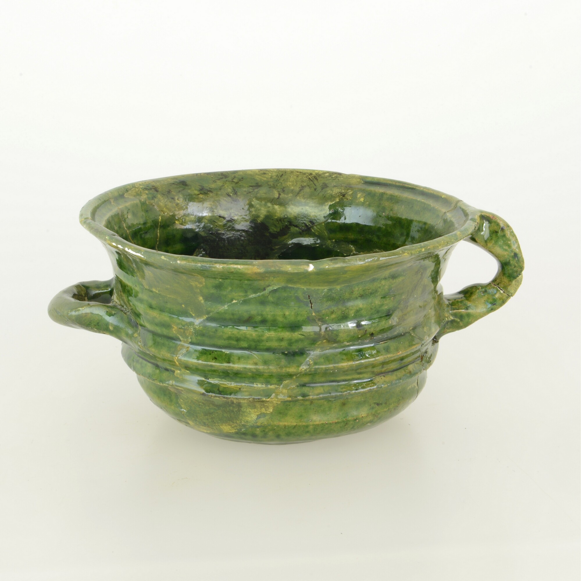 Kop; papkom; w-kop-14; witbakkend aardewerk; groen; diepe bolle kop met rechte wand, naar buiten geknikte lip; platte bodem; horizontaal en verticaal samengeknepen worstoor; herkomst: West-Nederland