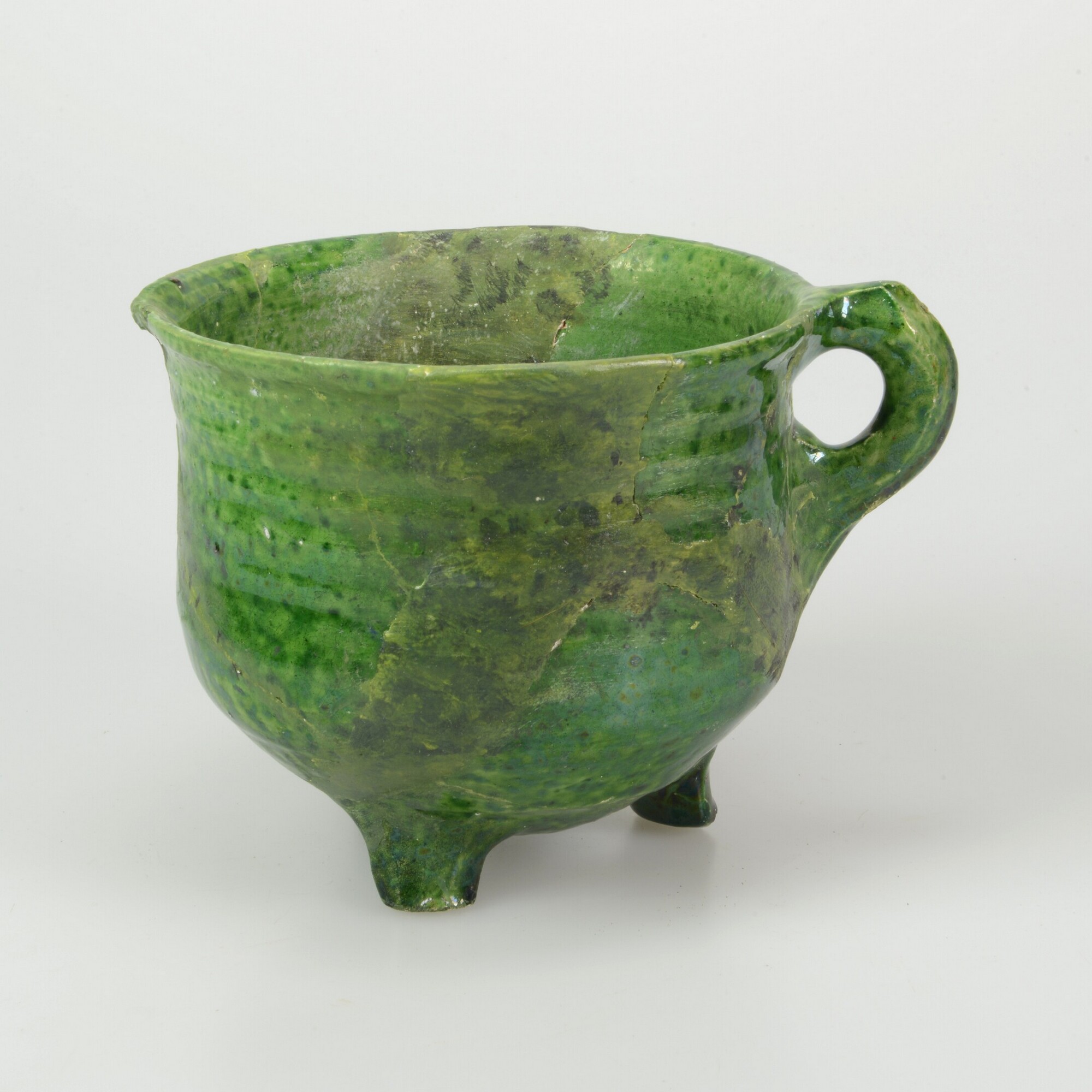 Grape; w-gra-22a; witbakkend aardewerk; geheel loodglazuur met koperoxide; hoge en wijde grape met afgeronde buikknik, vrijwel verticale schouder en licht uitgebogen rand; drie poten; één toegeknepen worstoor; schenklip; herkomst: West-Nederland