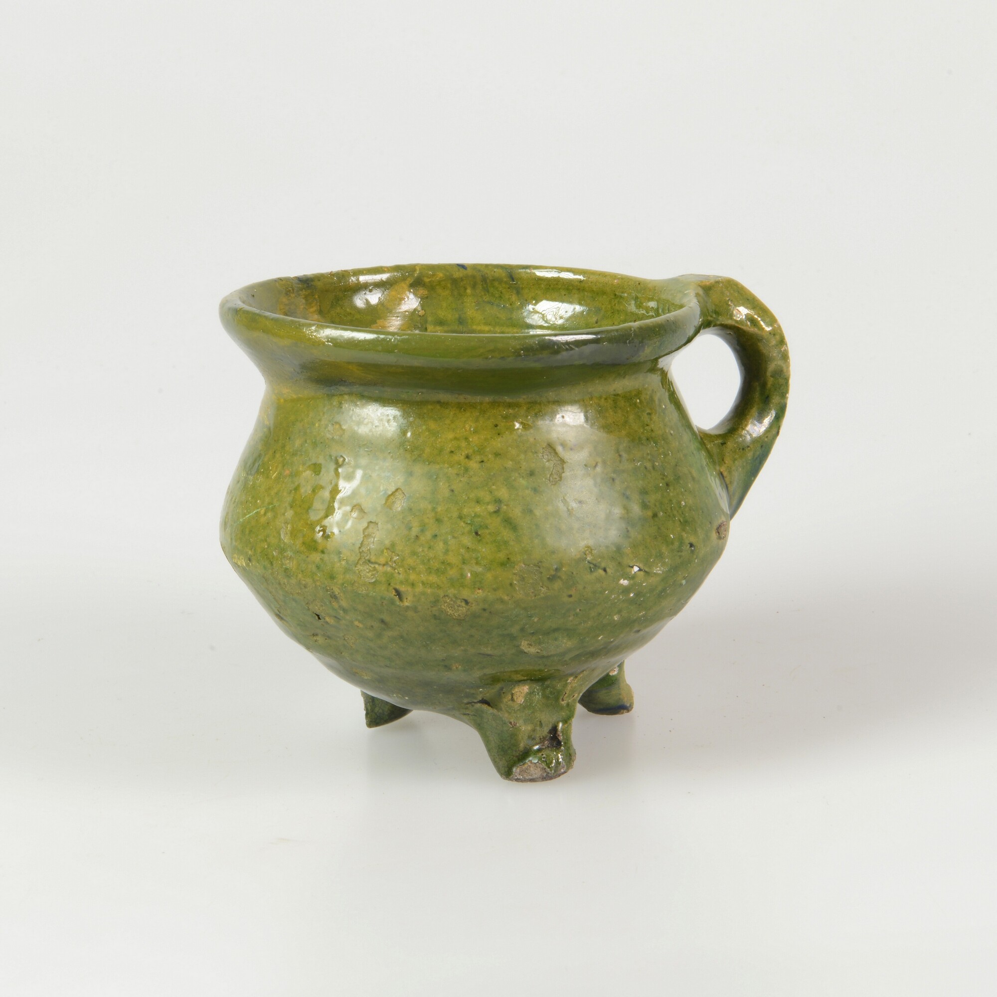 Grape; w-gra-26a; witbakkend aardewerk; geheel loodglazuur met koperoxide; afgeronde buikknik en hoge afgeronde kraagrand met dekselgeul; drie poten; één toegeknepen worstoor; schenklip; herkomst: West-Nederland