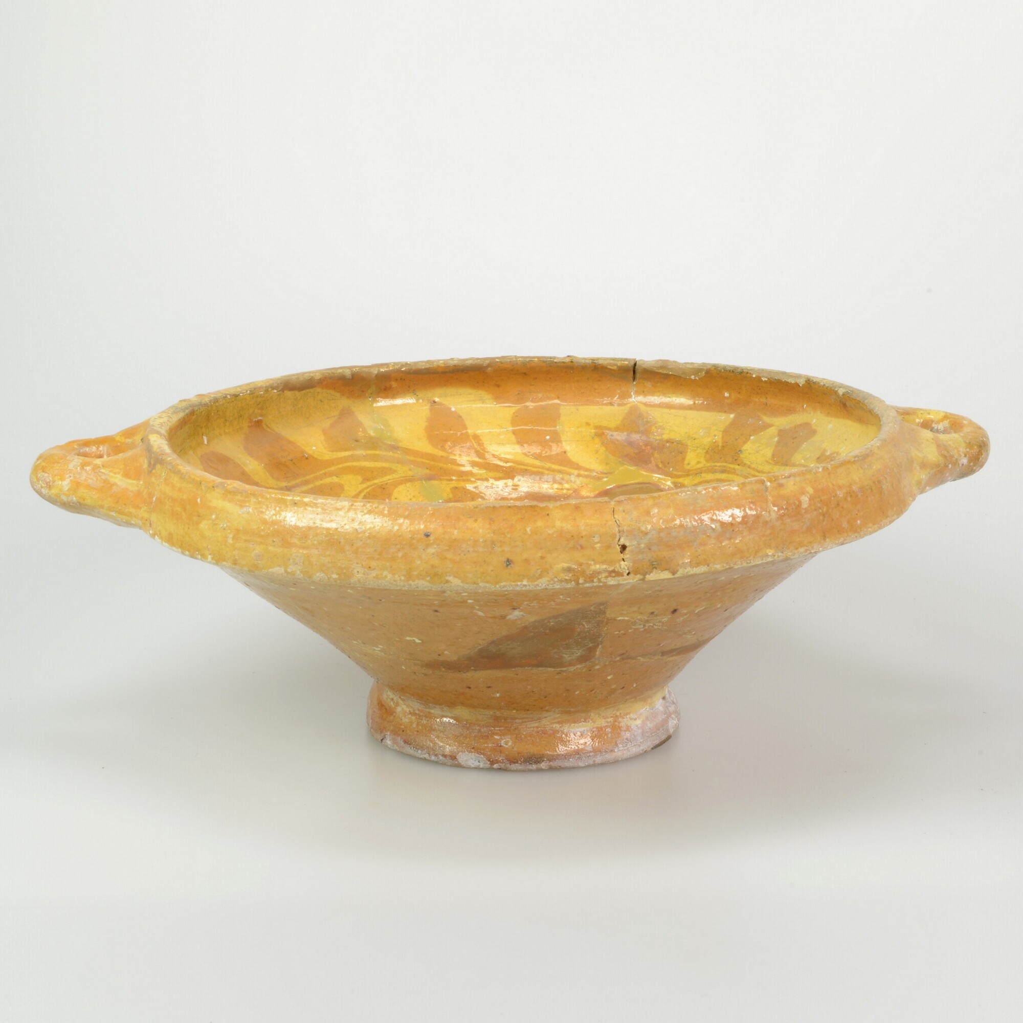 Kom; r-kom-8; roodbakkend aardewerk; geheel loodglazuur; inwendig witte sliblaag met spiraal in doorlooptechniek; afgeronde kom met afgeronde kraagrand; standring; twee horizontale worstoren; herkomst: Nederland