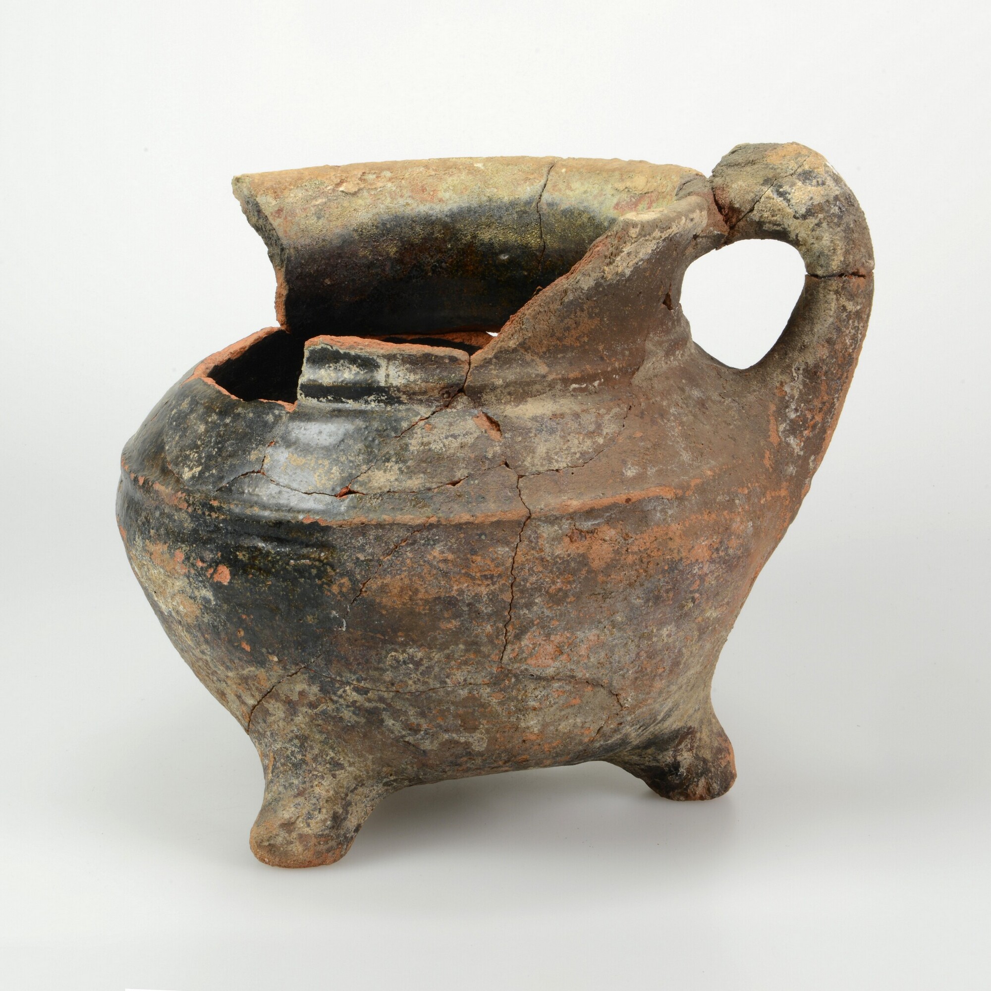 Grape/aspot; r-gra-19a; roodbakkend aardewerk; inwendig geheel loodglazuur, uitwendig spaarzaam loodglazuur; scherpe buikknik, ribbel op halsaanzet, uitgebogen rand; worstoor; driepoot; rand kapot gestookt