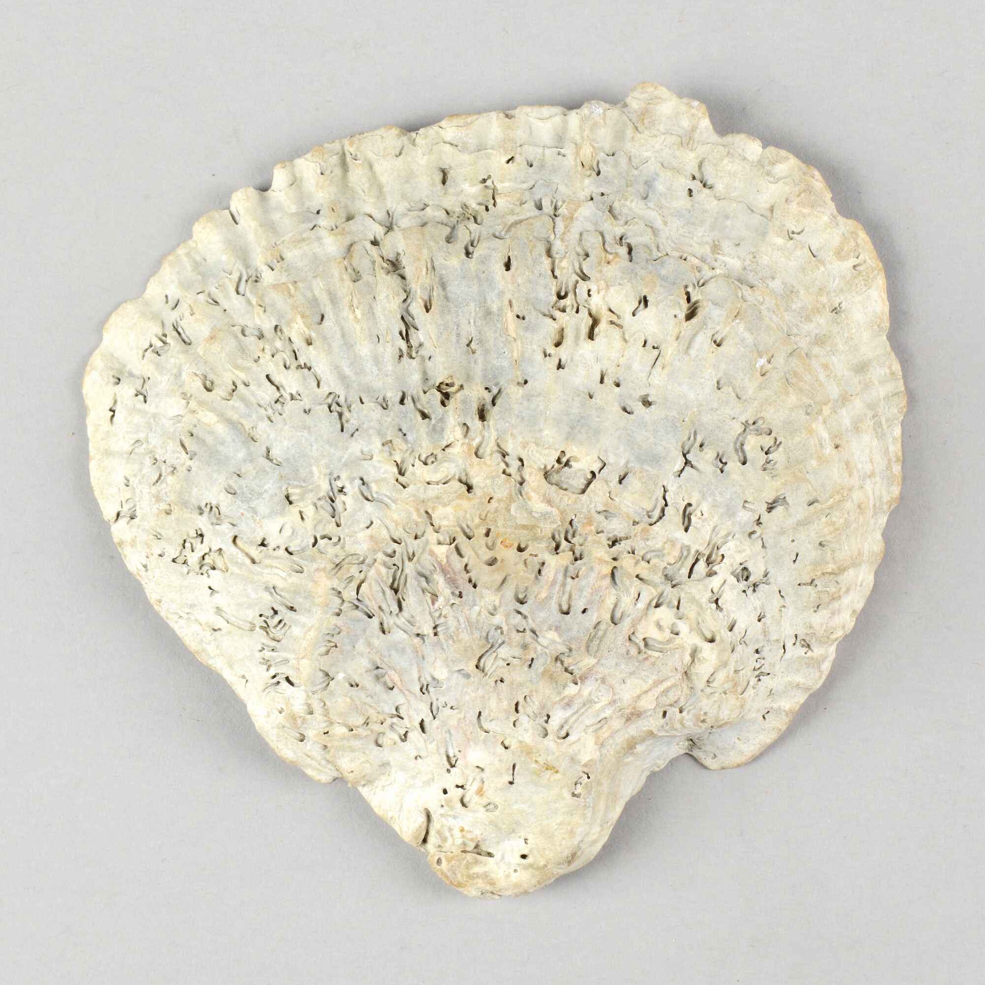 Gewone oester (Ostrea edulis); boorgangen, waarschijnlijk gemaakt door een boorspons; herkomst: Europa; vondstomstandigheden: Westerwijk