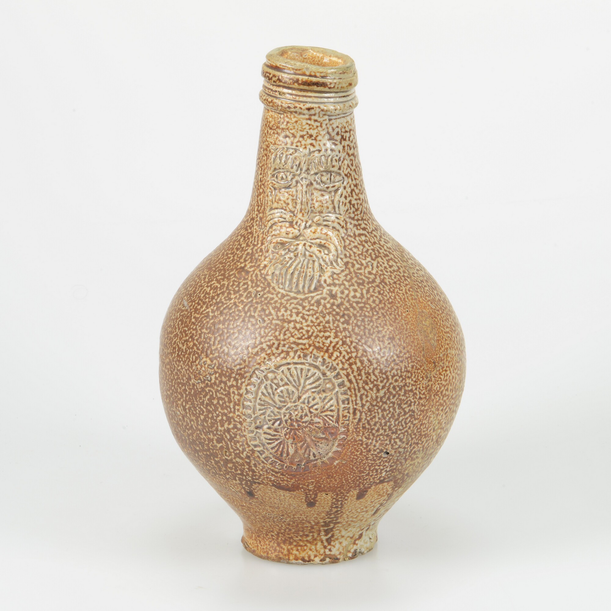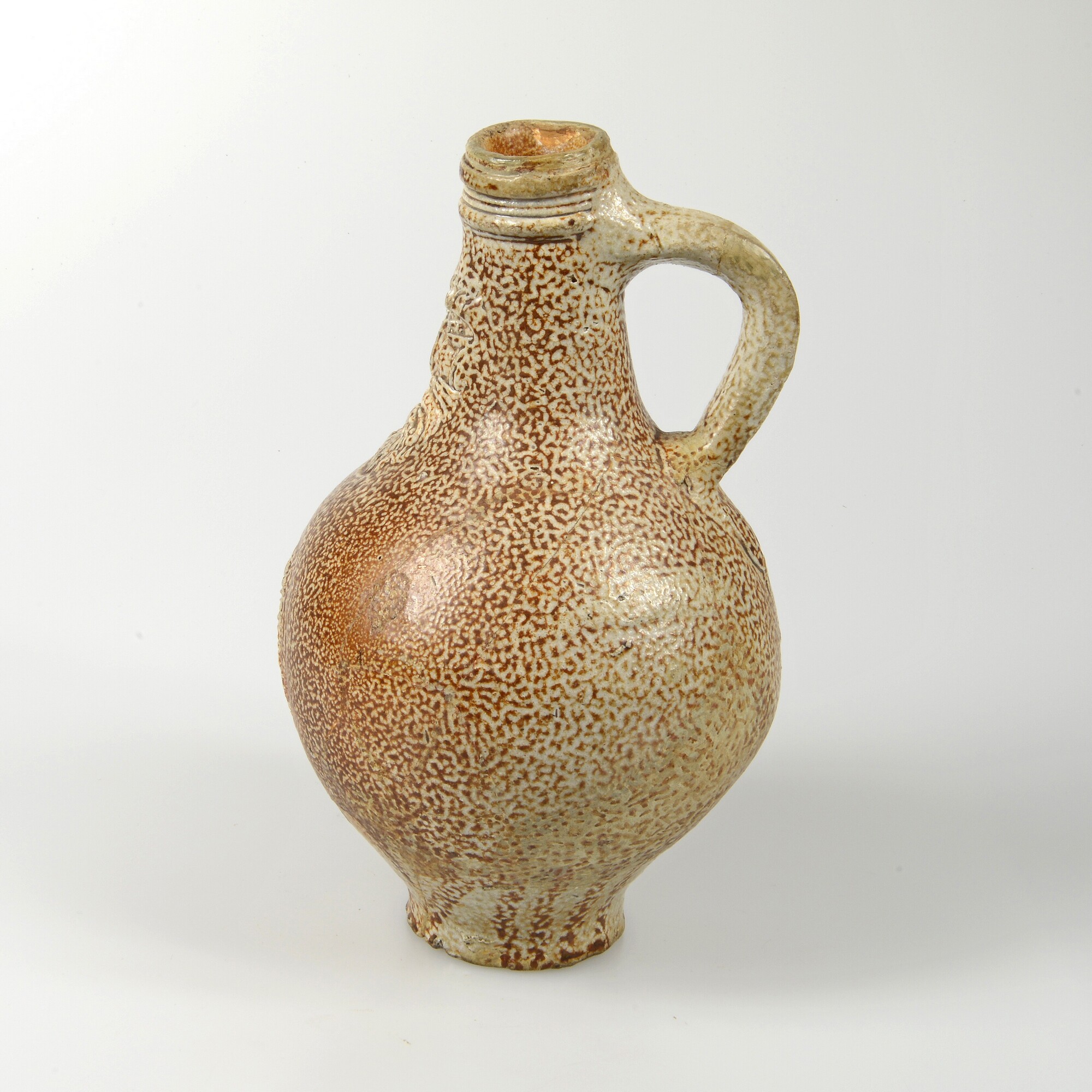 Baardmankruik; kan; s2-kan-32; bolle kan met schouder overgaand in hoge hals met geribbelde kraagrand; steengoed met zoutglazuur, ijzerengobe; baardman op hals, rozet op buik; standvlak; één worstoor; productieplaats: Frechen