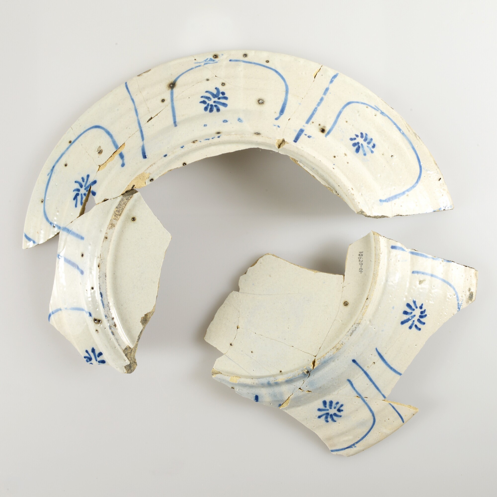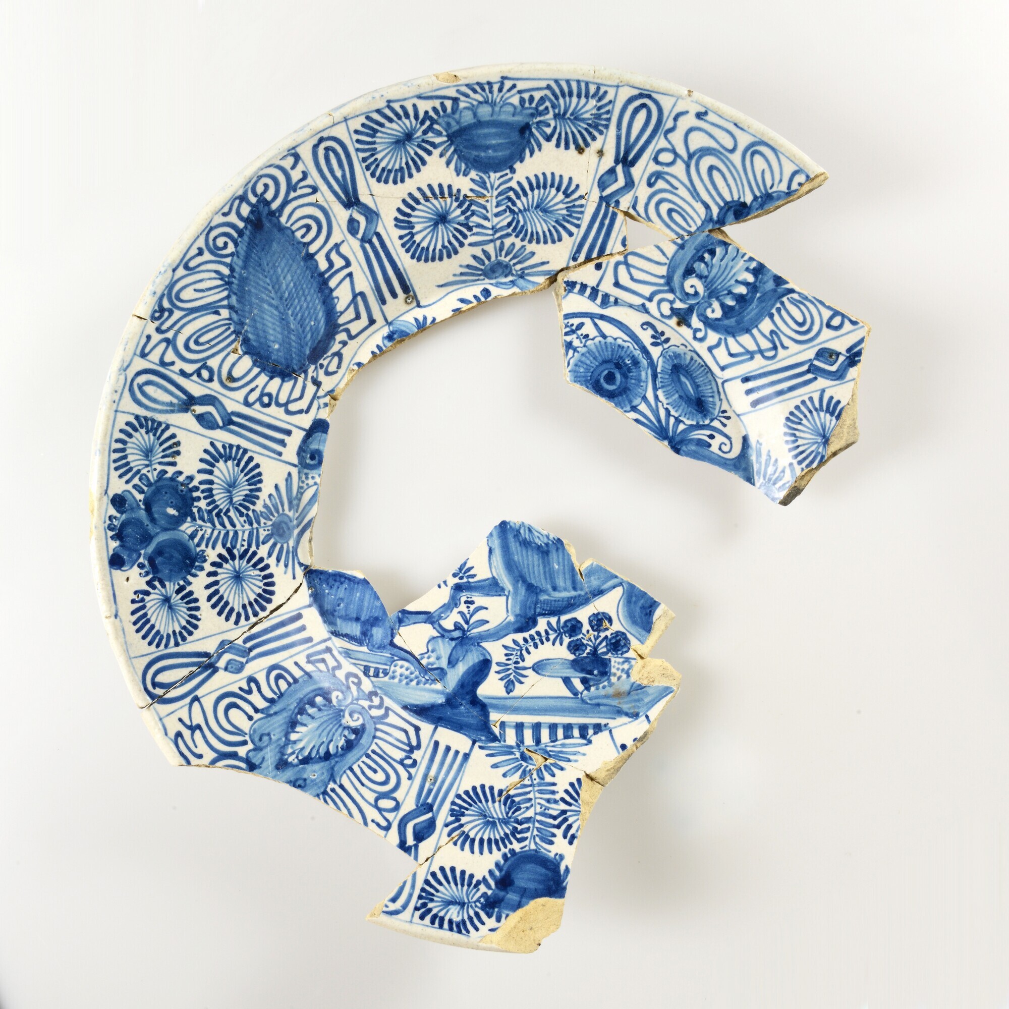 Bord; po-bor-3; bord met naar buiten geknikte vlag; Portugese faience; tinglazuur; blauwe beschildering: spiegel: twee herten in landschap, vlag: Wanli-rand, achterzijde bogen, sterren en lijnen; standring; herkomst: Portugal