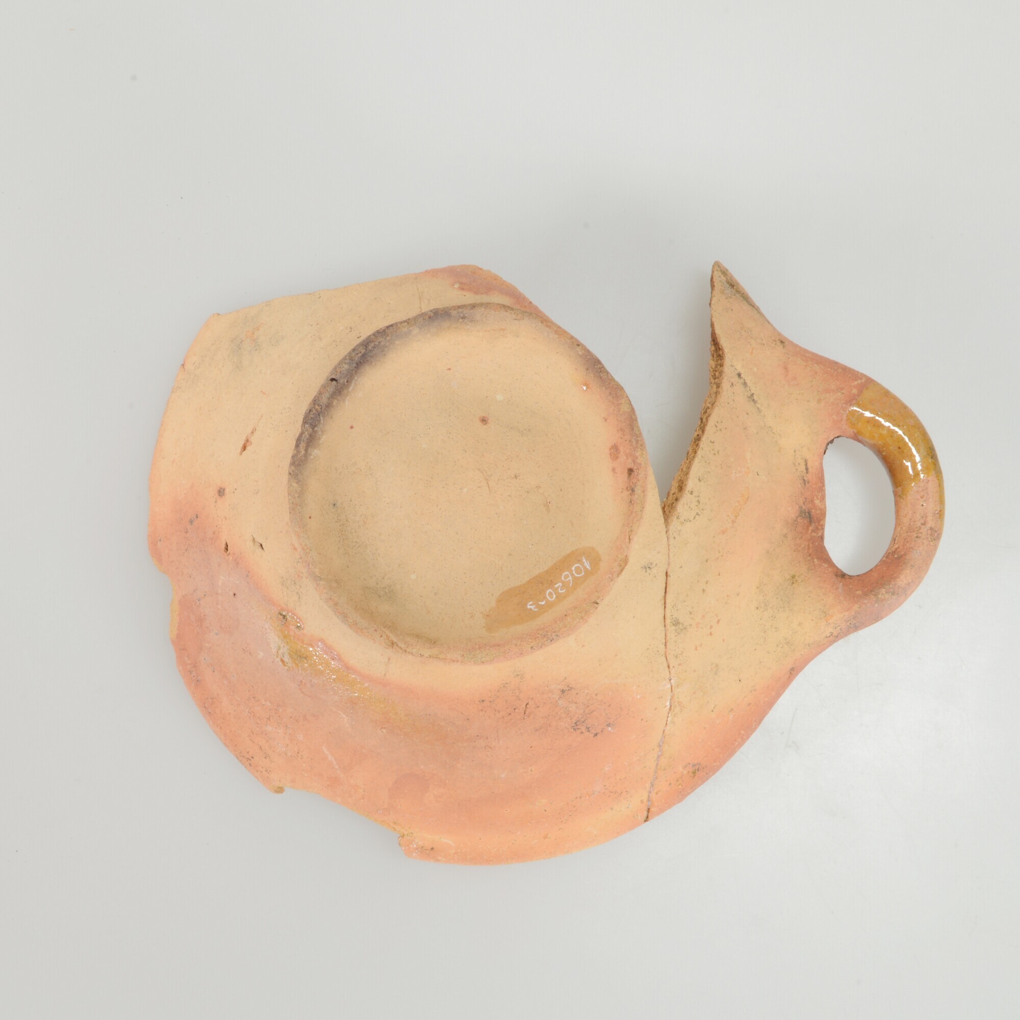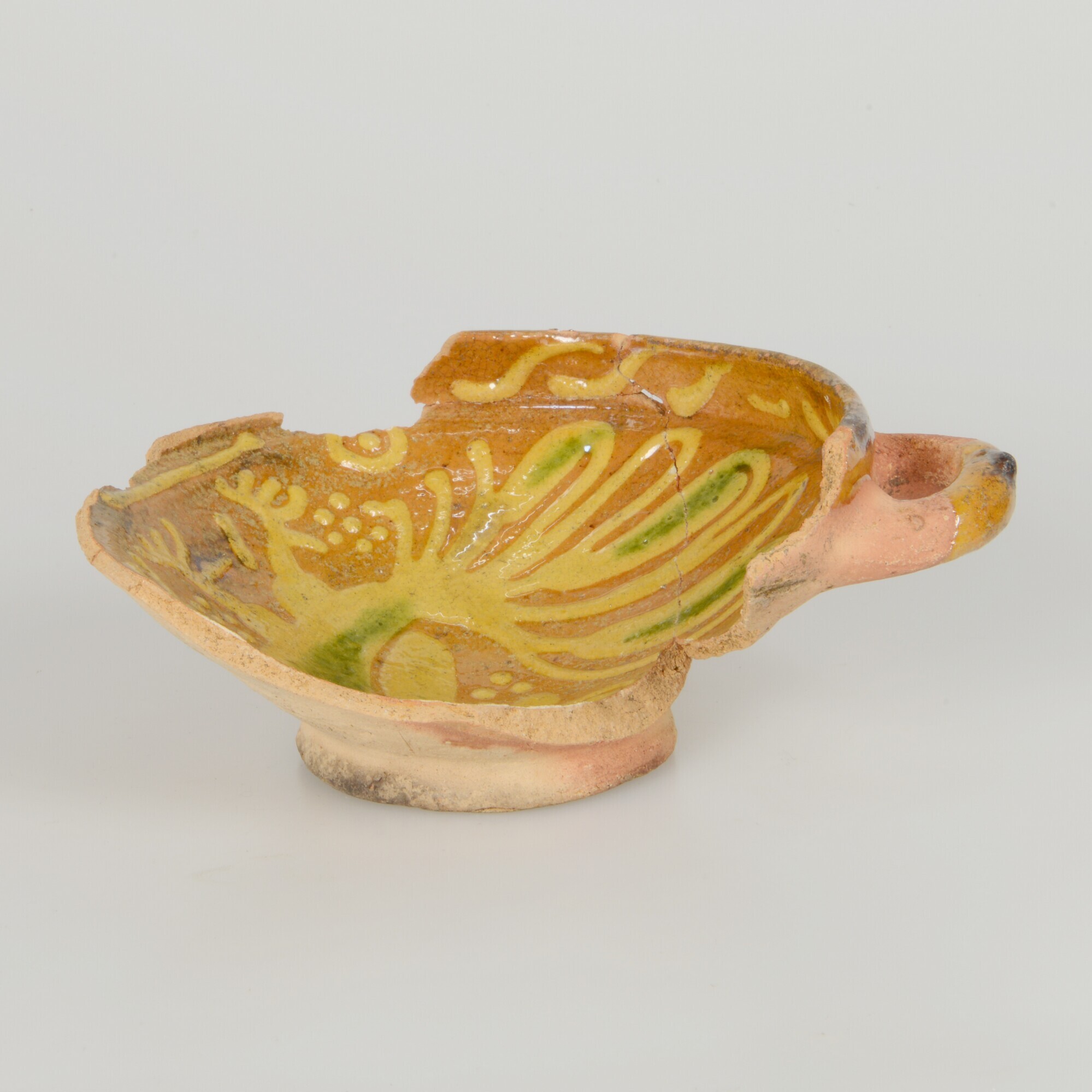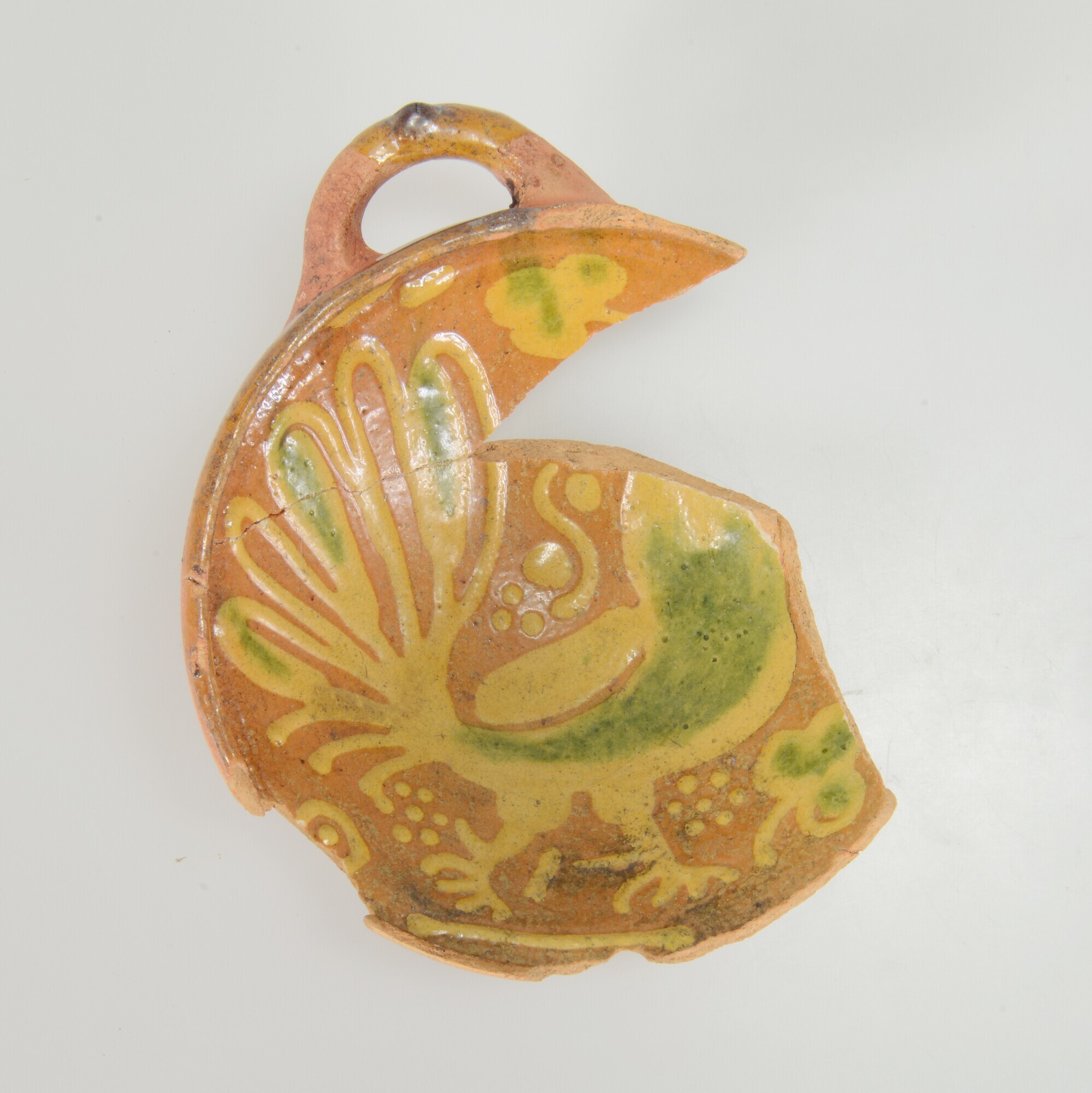 Kop; r-kop-11; wijde kop met naar binnen gebogen rand; roodbakkend aardewerk; inwendig loodglazuur; inwendige slibversiering: haan; standring; horizontaal worstoor