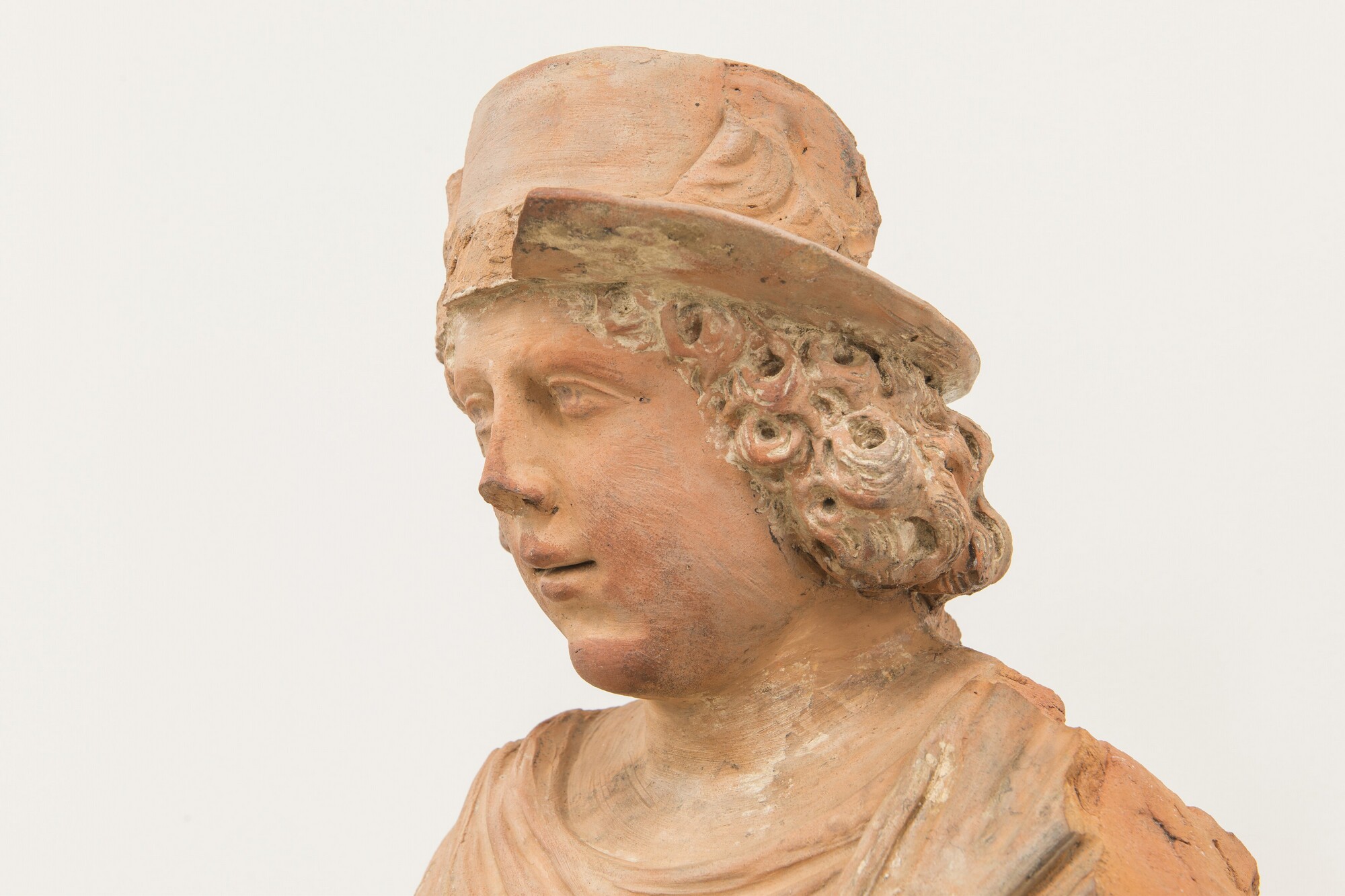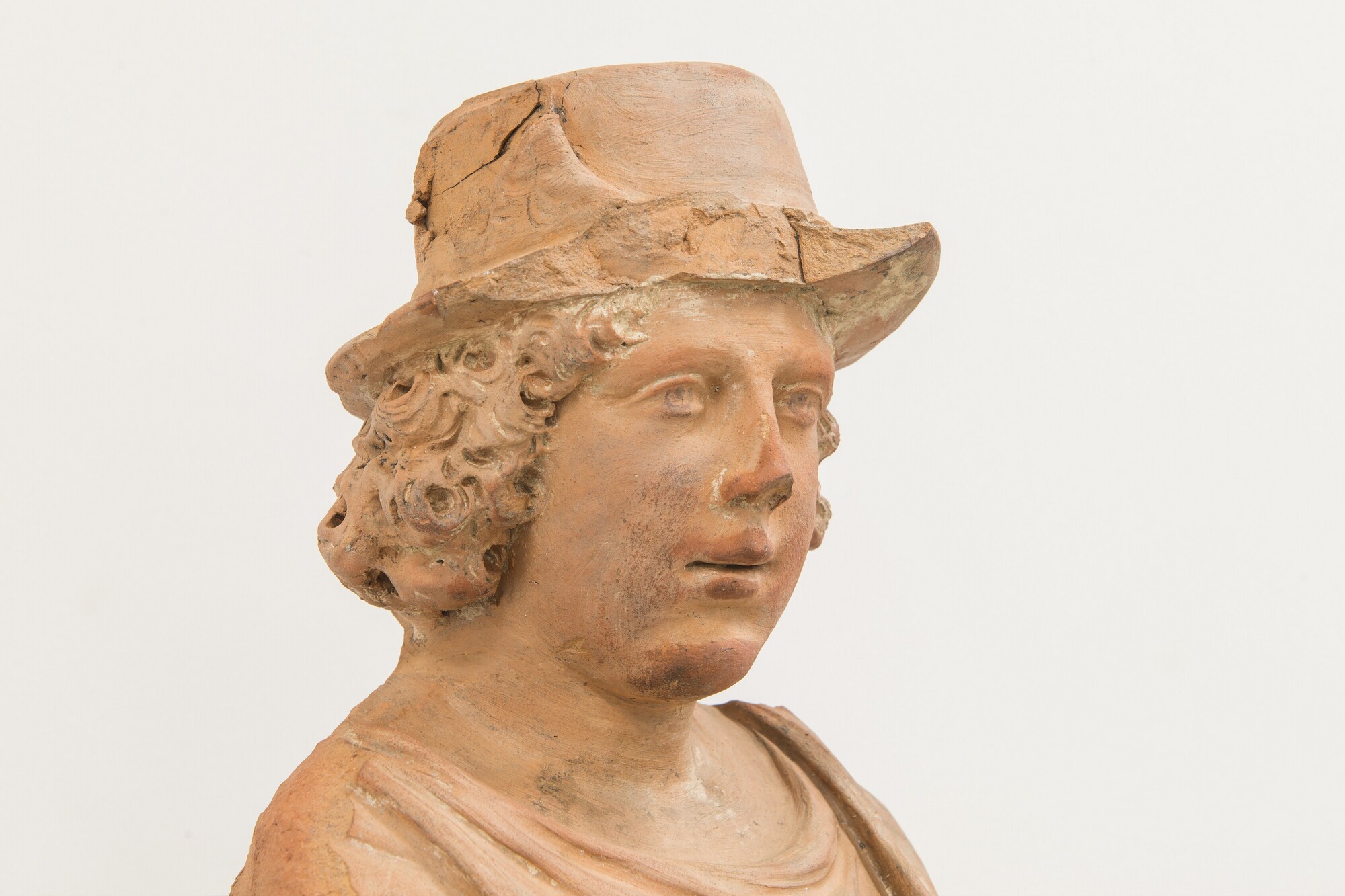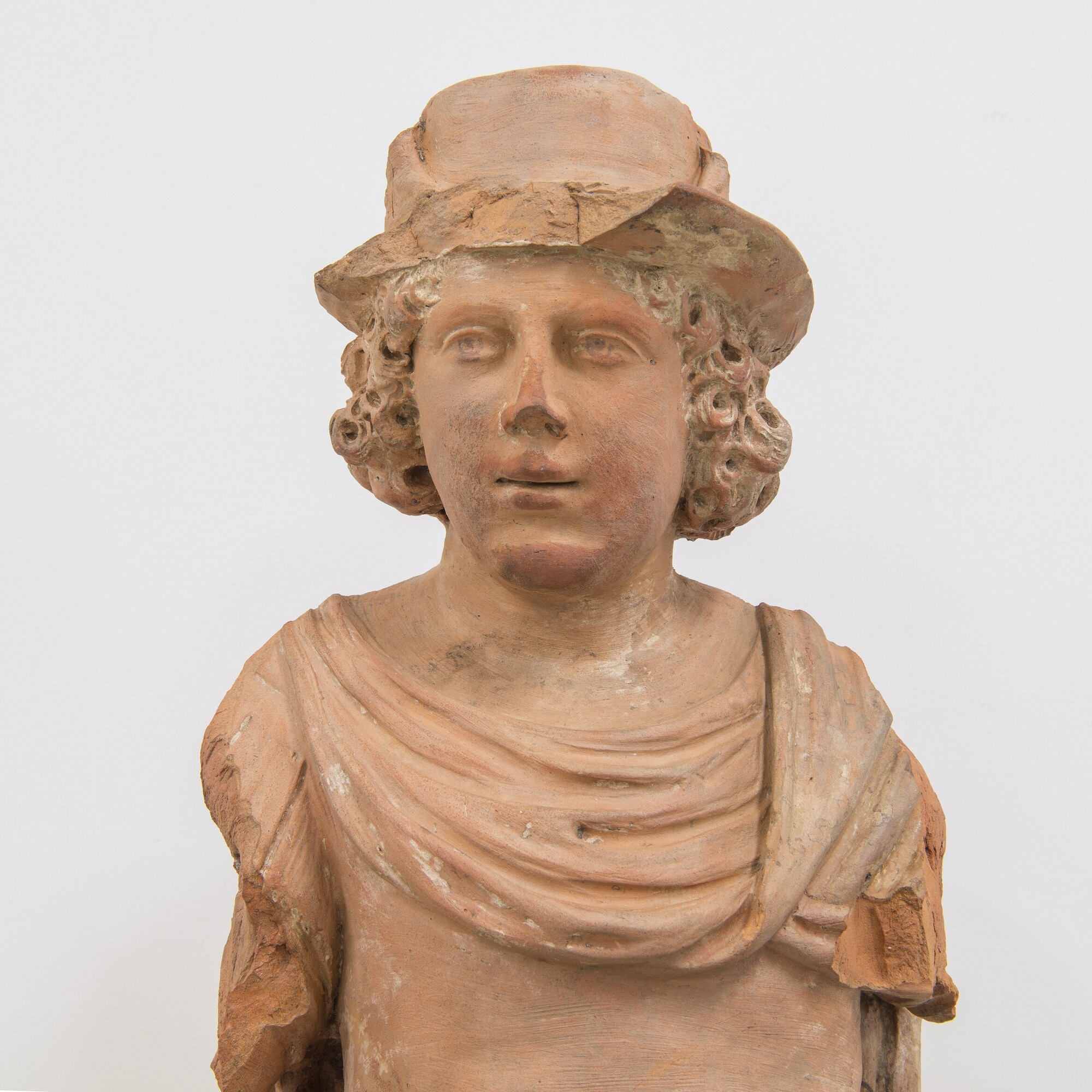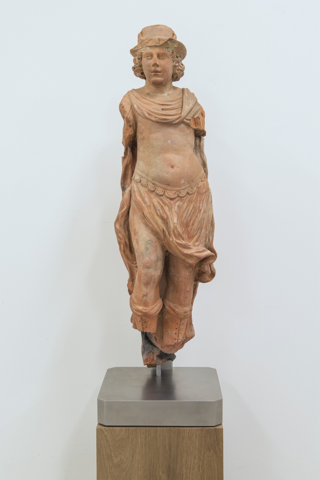 Deel van een schouw pilaster; Mercurius als jonge man met halflang krullend haar, leunend op zijn linkerbeen; klassiek gekleed: een borstkuras met golfrand onderaan (navel is aangegeven), een opzij waaiende tuniek, een lange golvende mantel, blote benen en laarzen met veters; op zijn hoofd een hoed met vleugels; touwrand boven de brede horizontale rand van ...