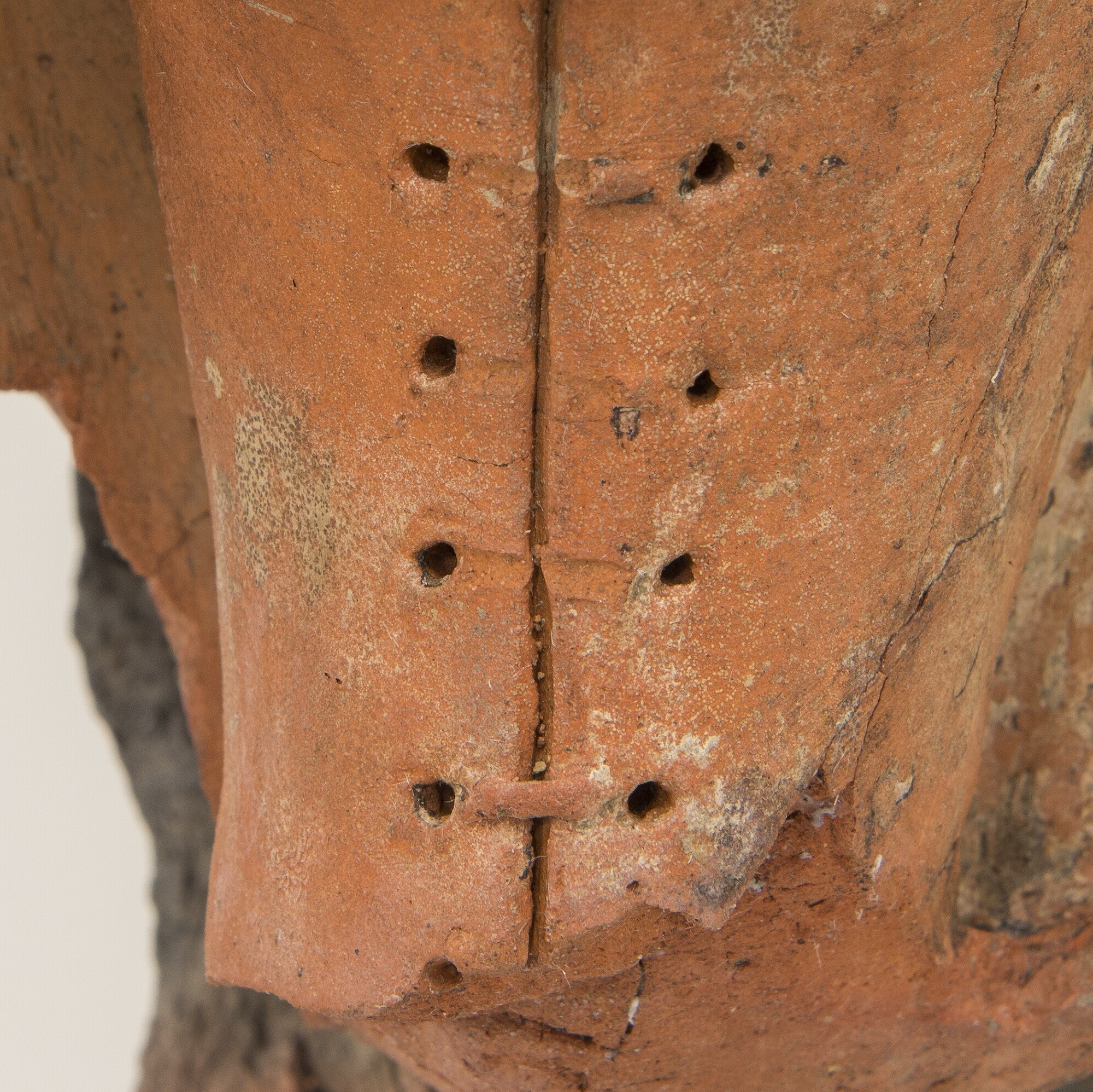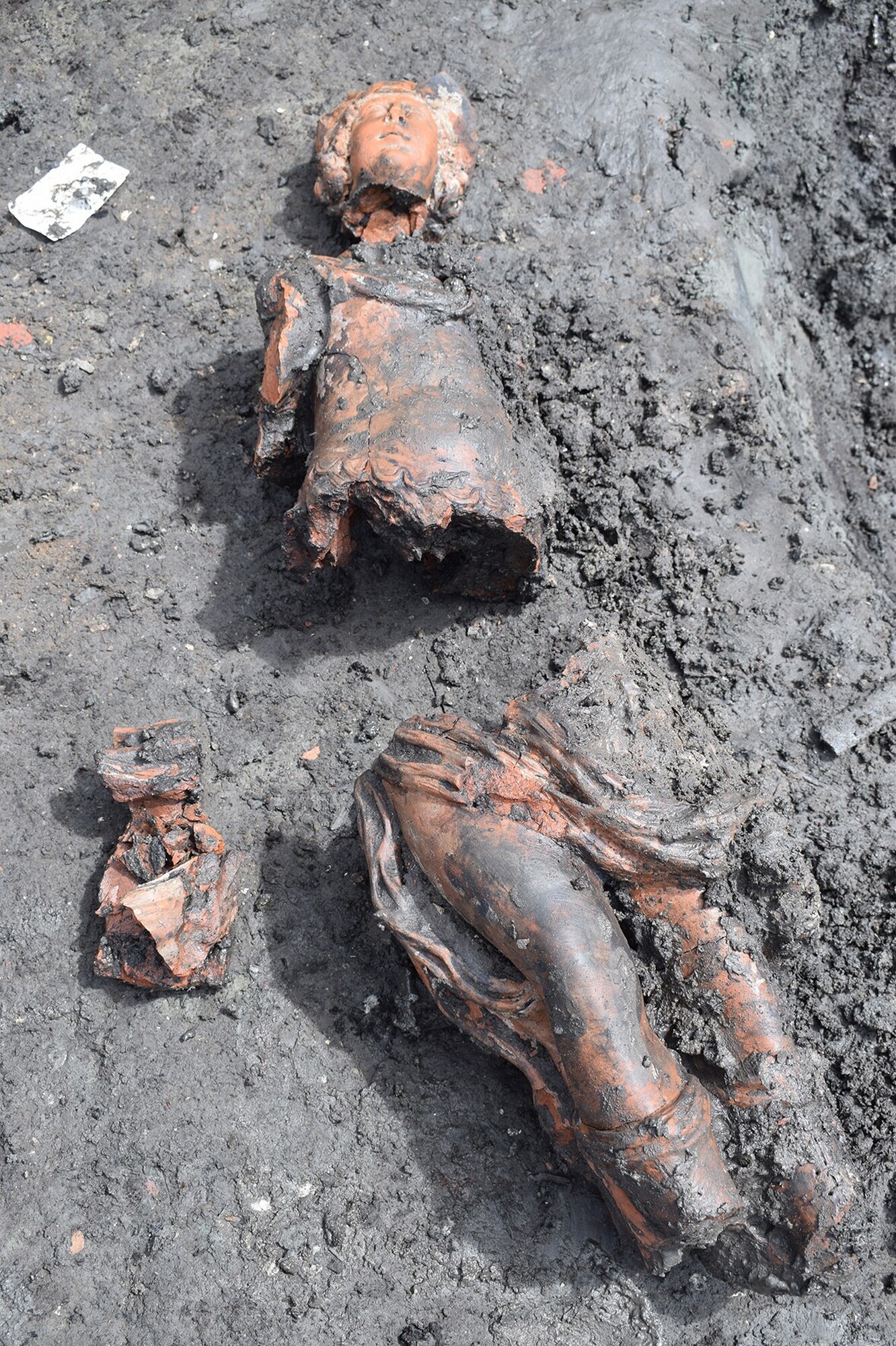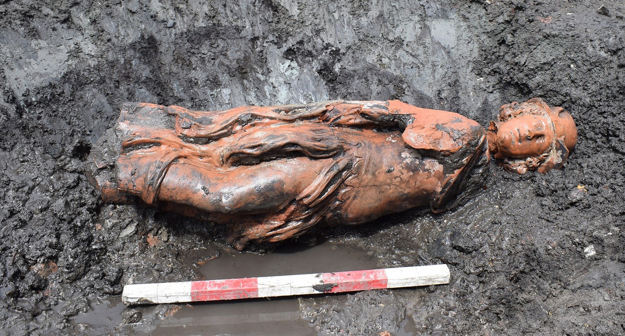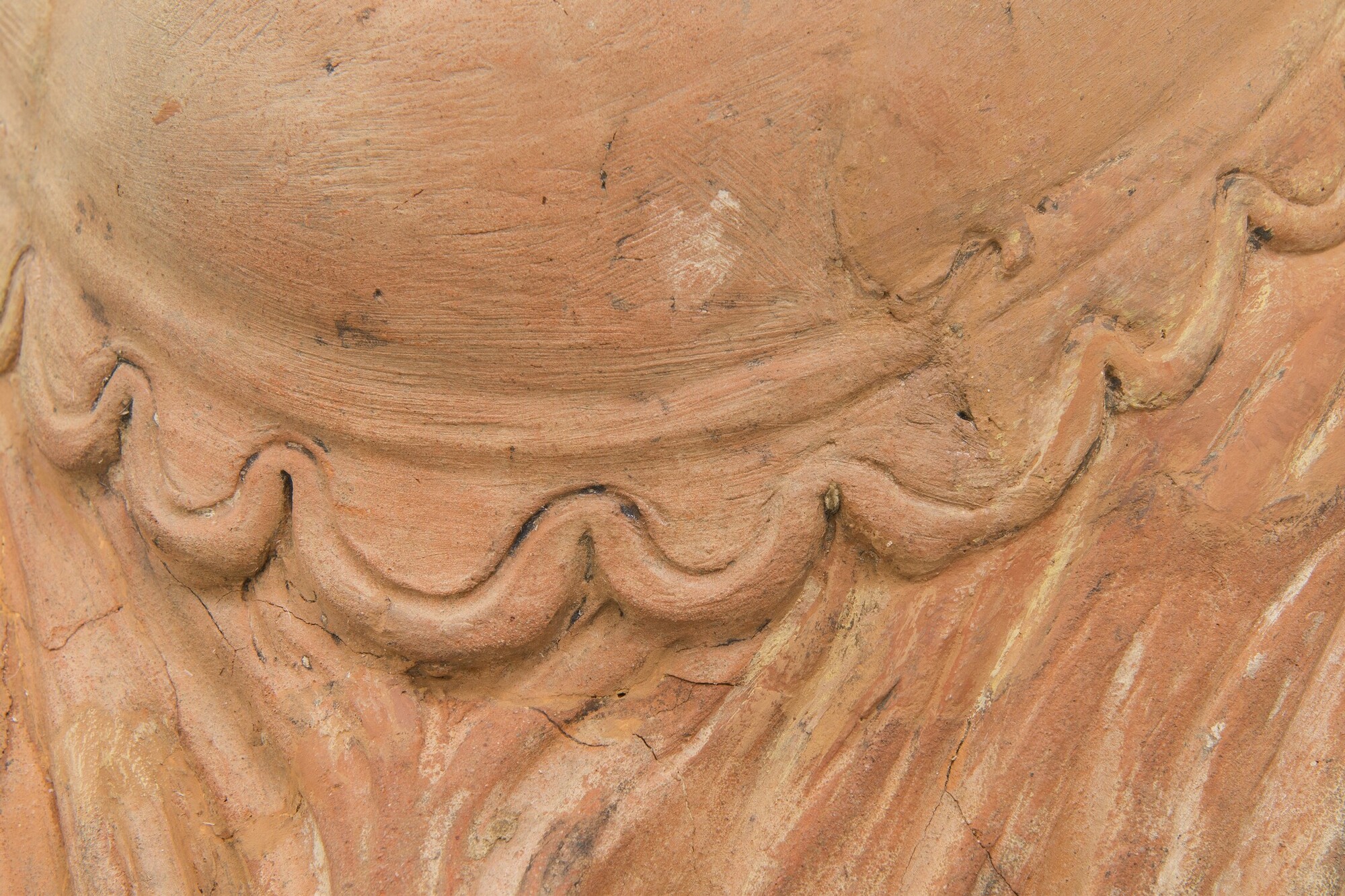 Deel van een schouw pilaster; Mercurius als jonge man met halflang krullend haar, leunend op zijn linkerbeen; klassiek gekleed: een borstkuras met golfrand onderaan (navel is aangegeven), een opzij waaiende tuniek, een lange golvende mantel, blote benen en laarzen met veters; op zijn hoofd een hoed met vleugels; touwrand boven de brede horizontale rand van ...