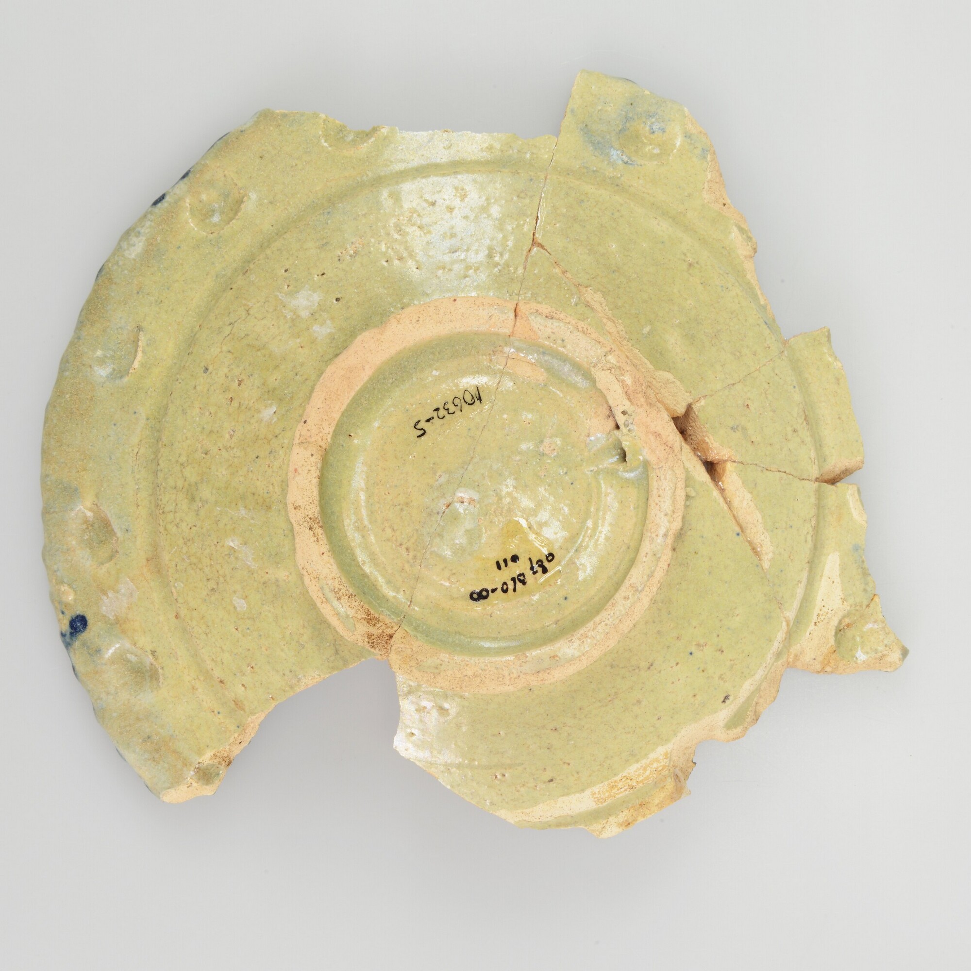 Bord; m-bor-14; majolica; vlag: reliëf met kartelrand; bovenzijde tinglazuur, onderzijde loodglazuur; beschildering in blauw, groen en oranje; spiegel: granaatappels, druiven en bladeren; standring; vondstomstandigheden: Afvalkuil I, 29-02-1988